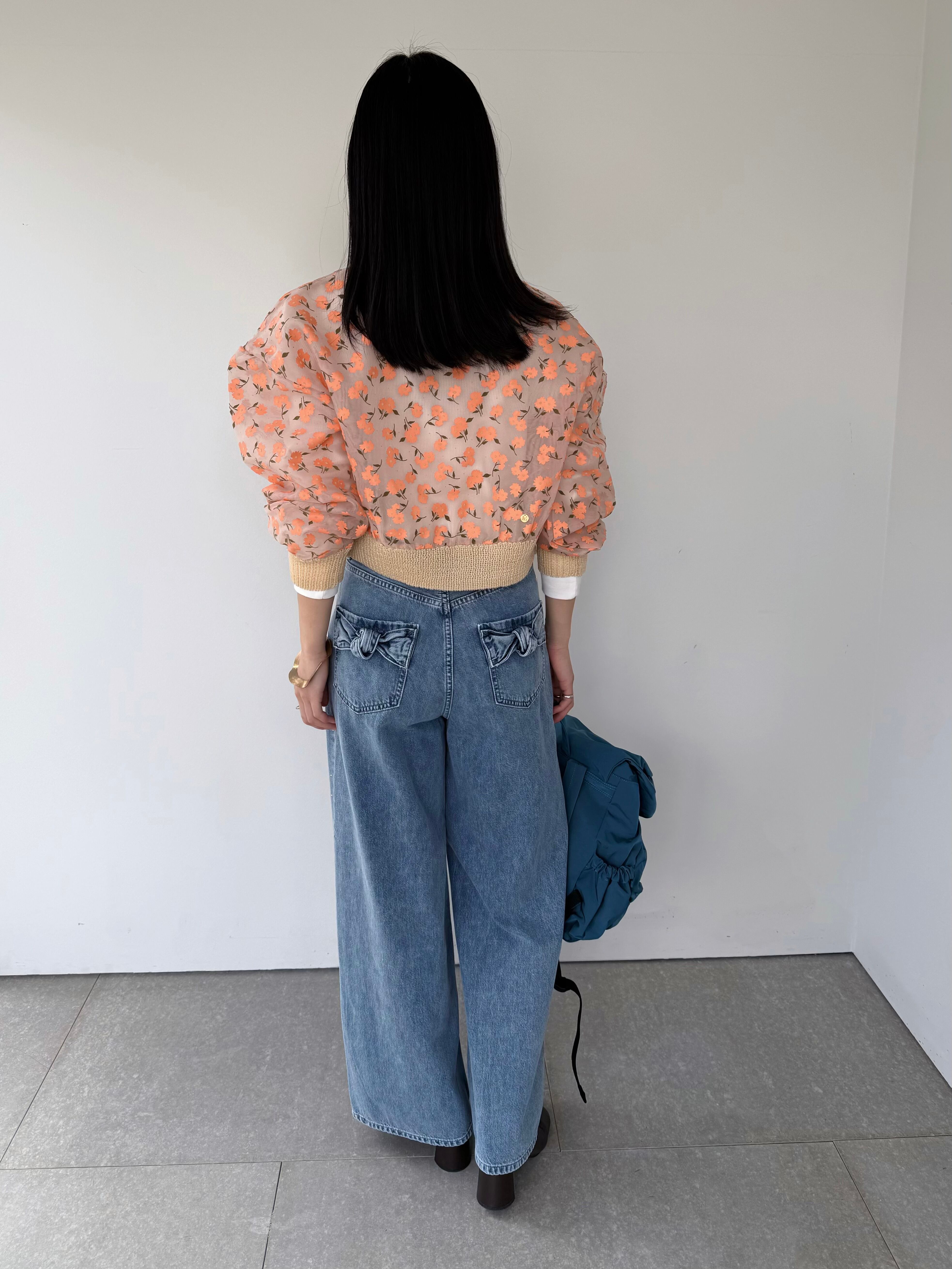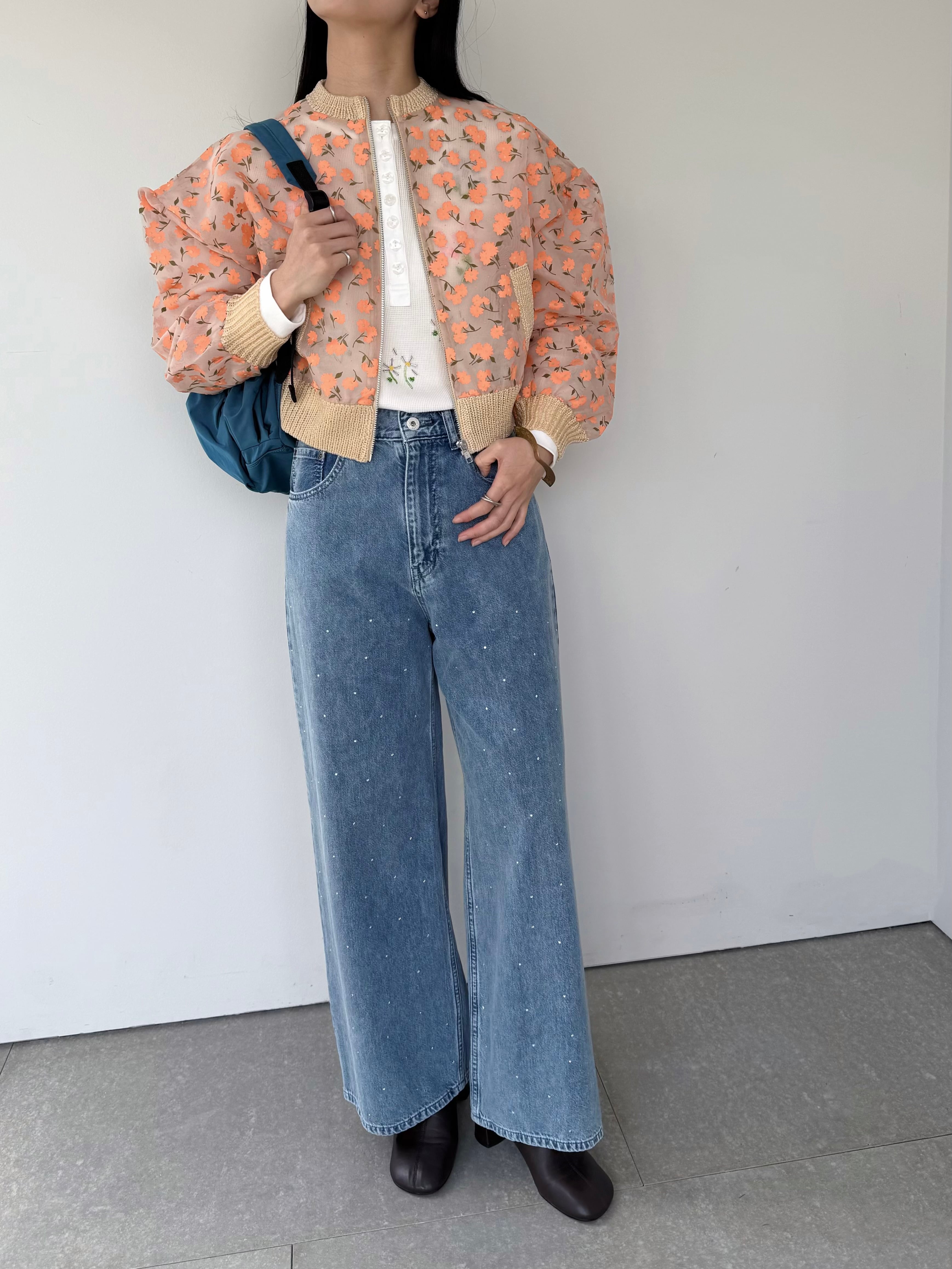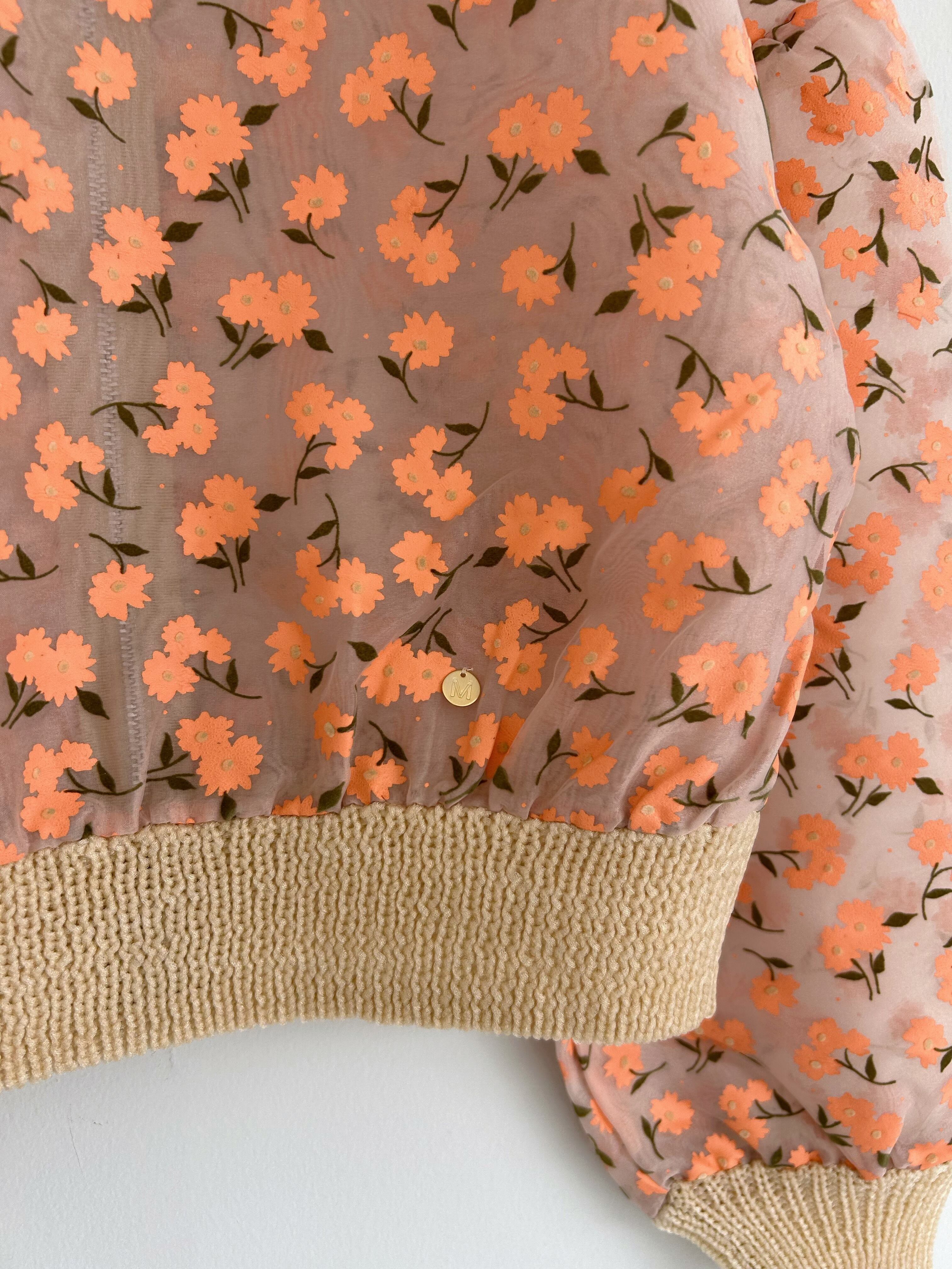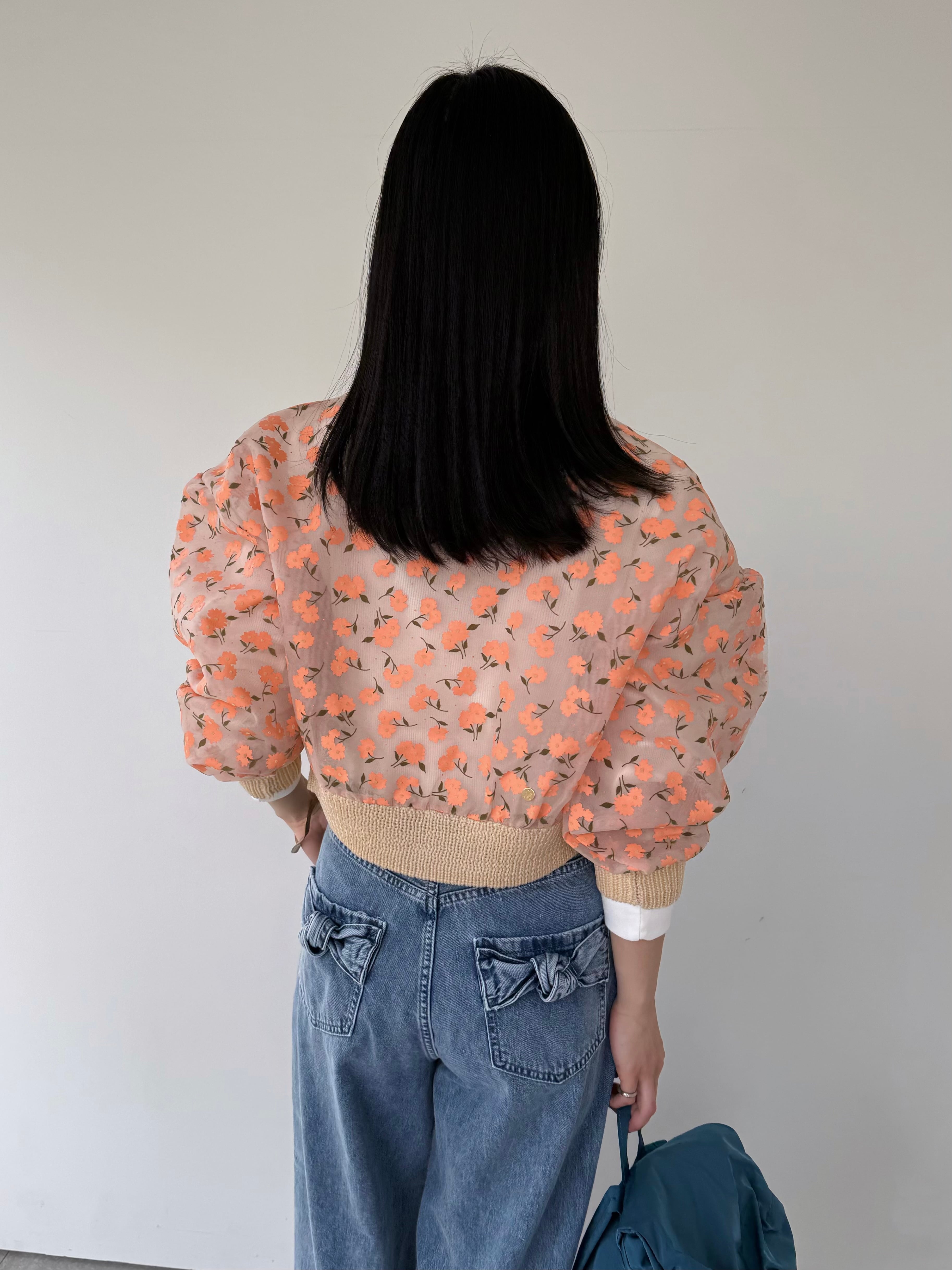 オーガンジー素材に顔料とフロッキーを組み合わせたオリジナルフラワープリントのジップカーディガン。