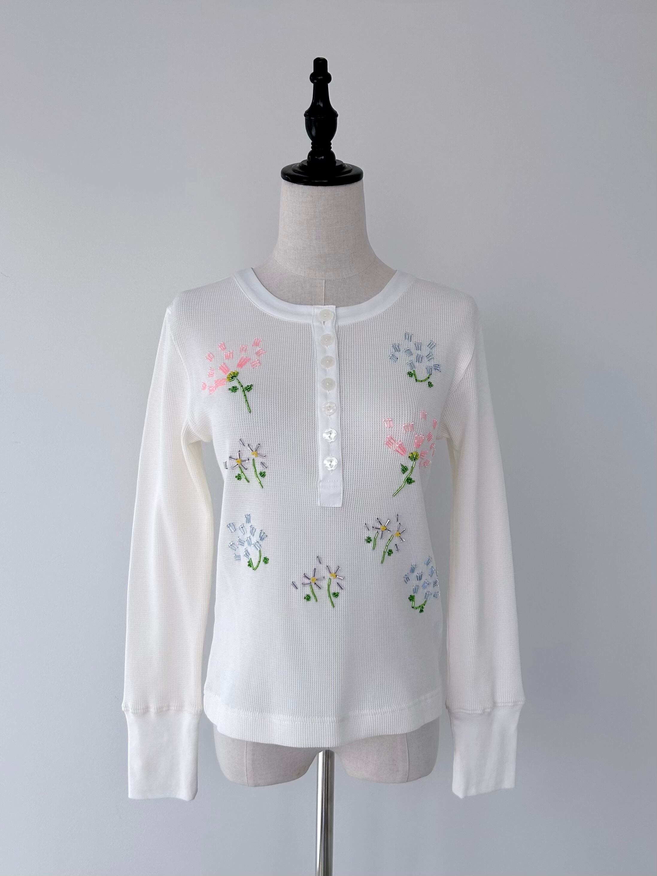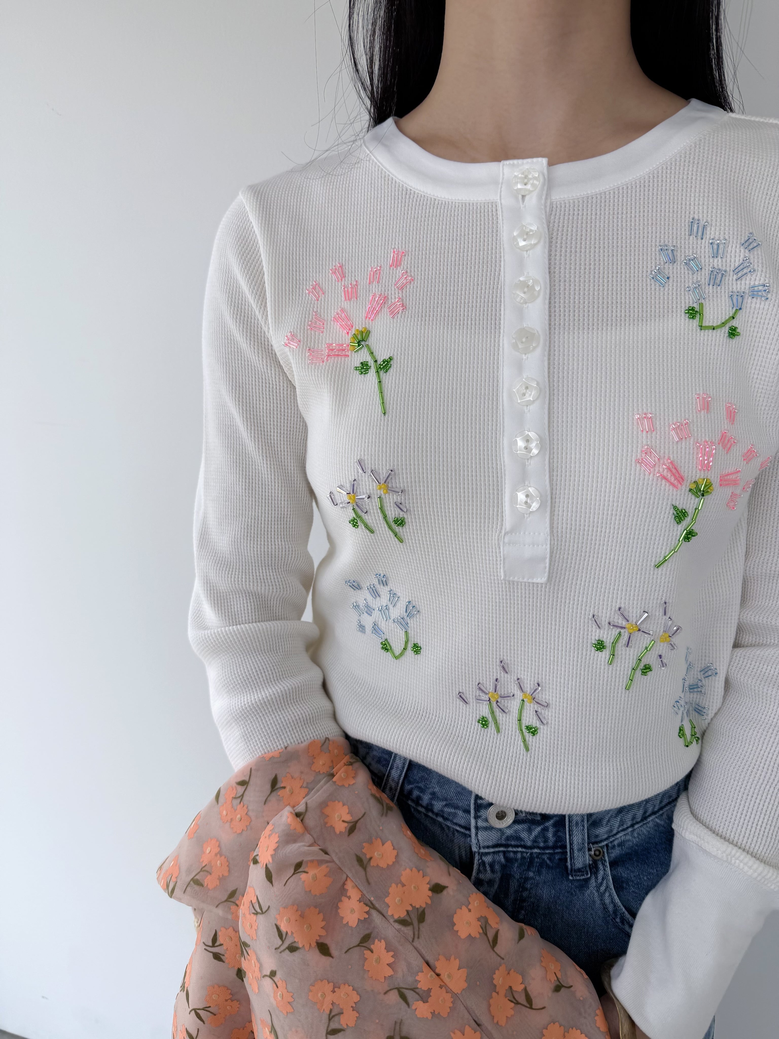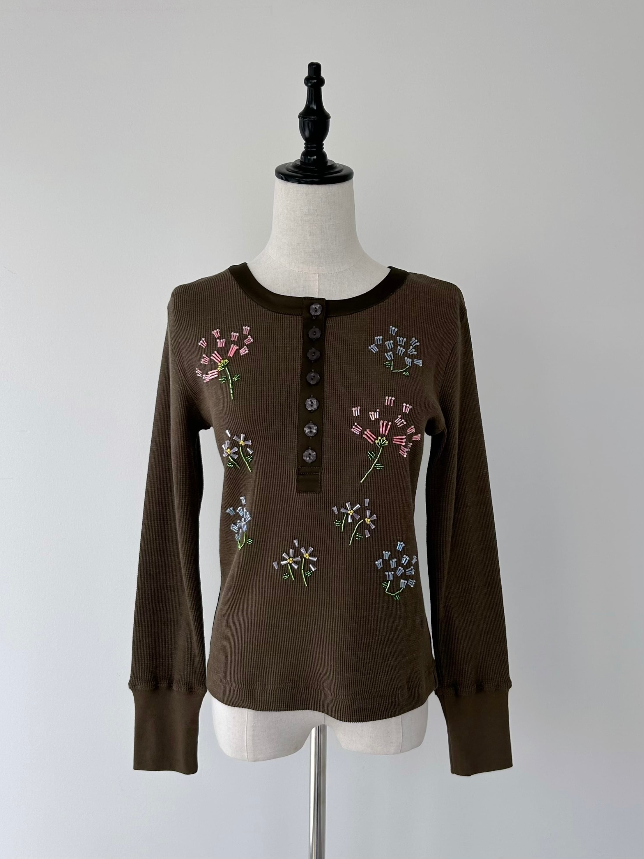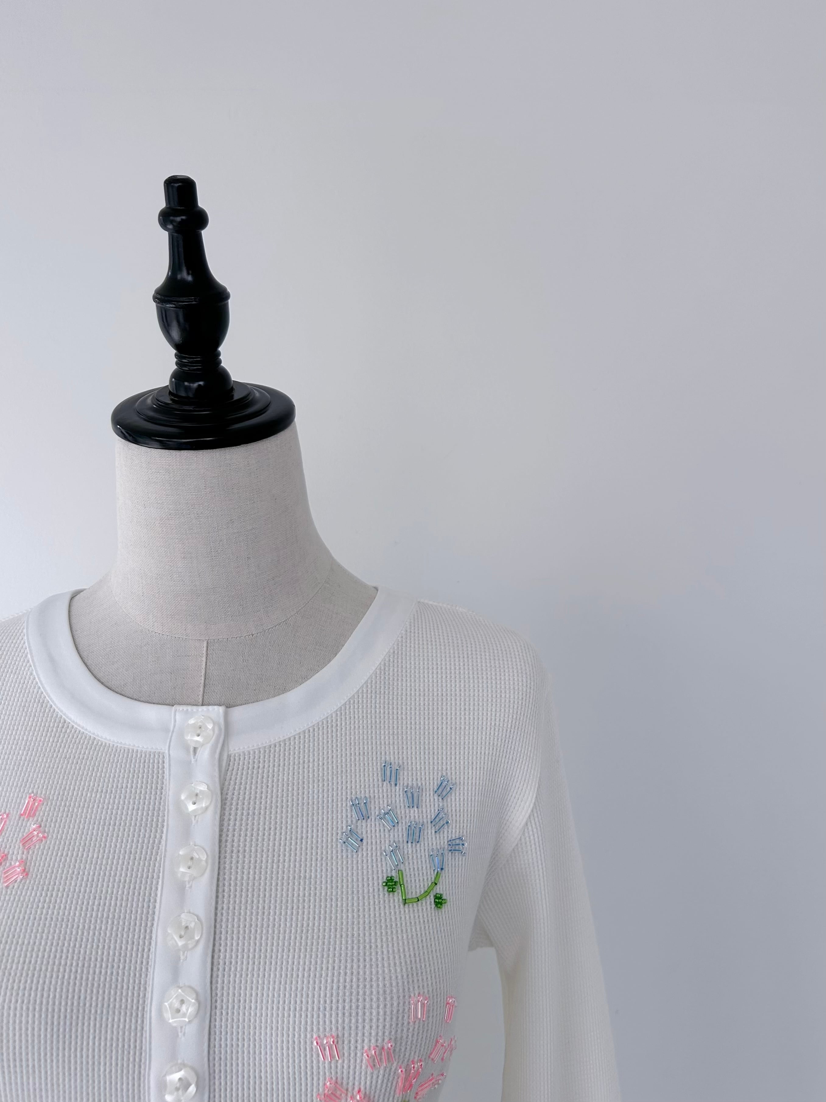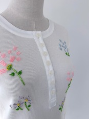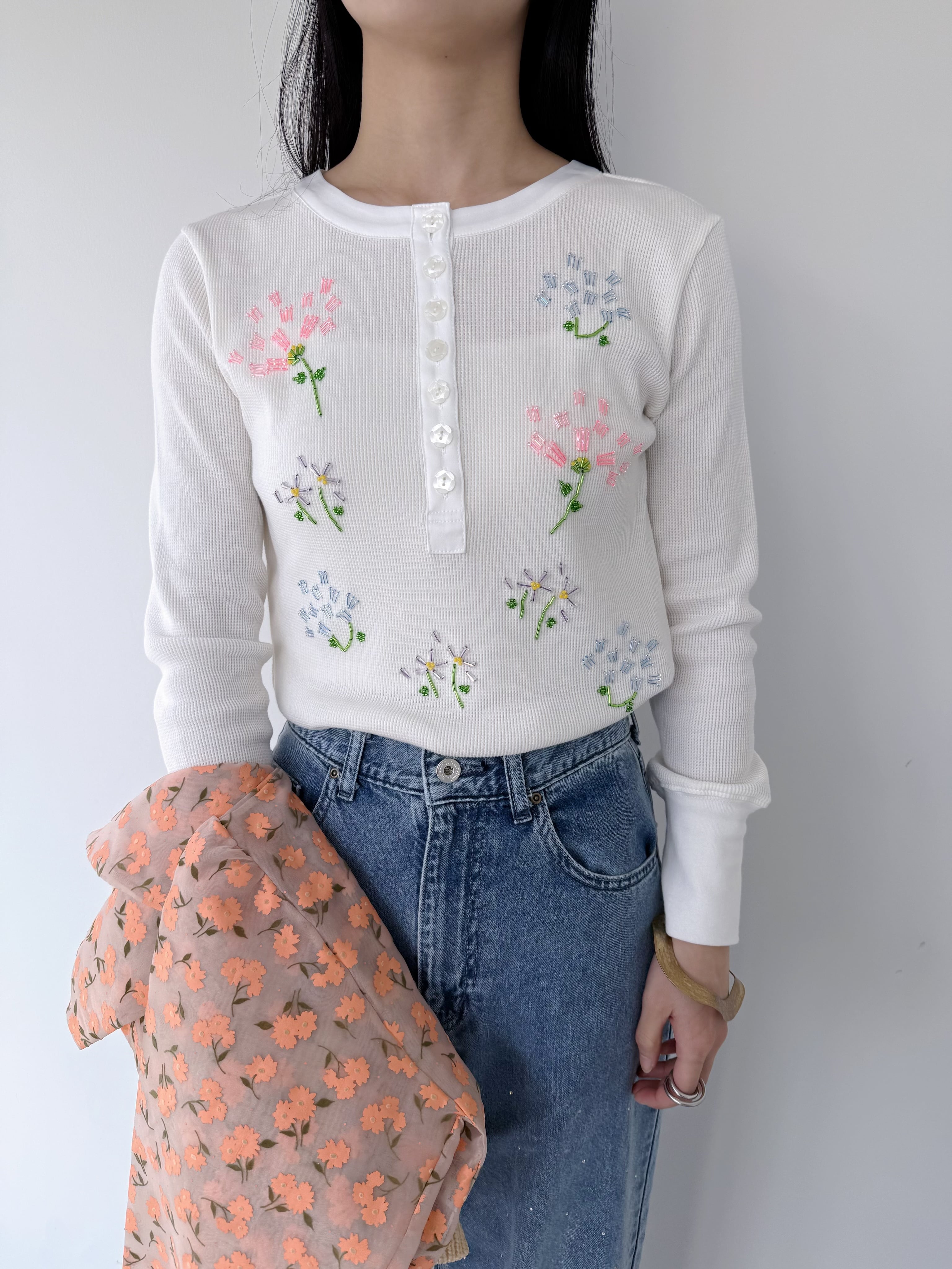 フラワーモチーフのビーズ刺繍で華やかさを添えた一着。