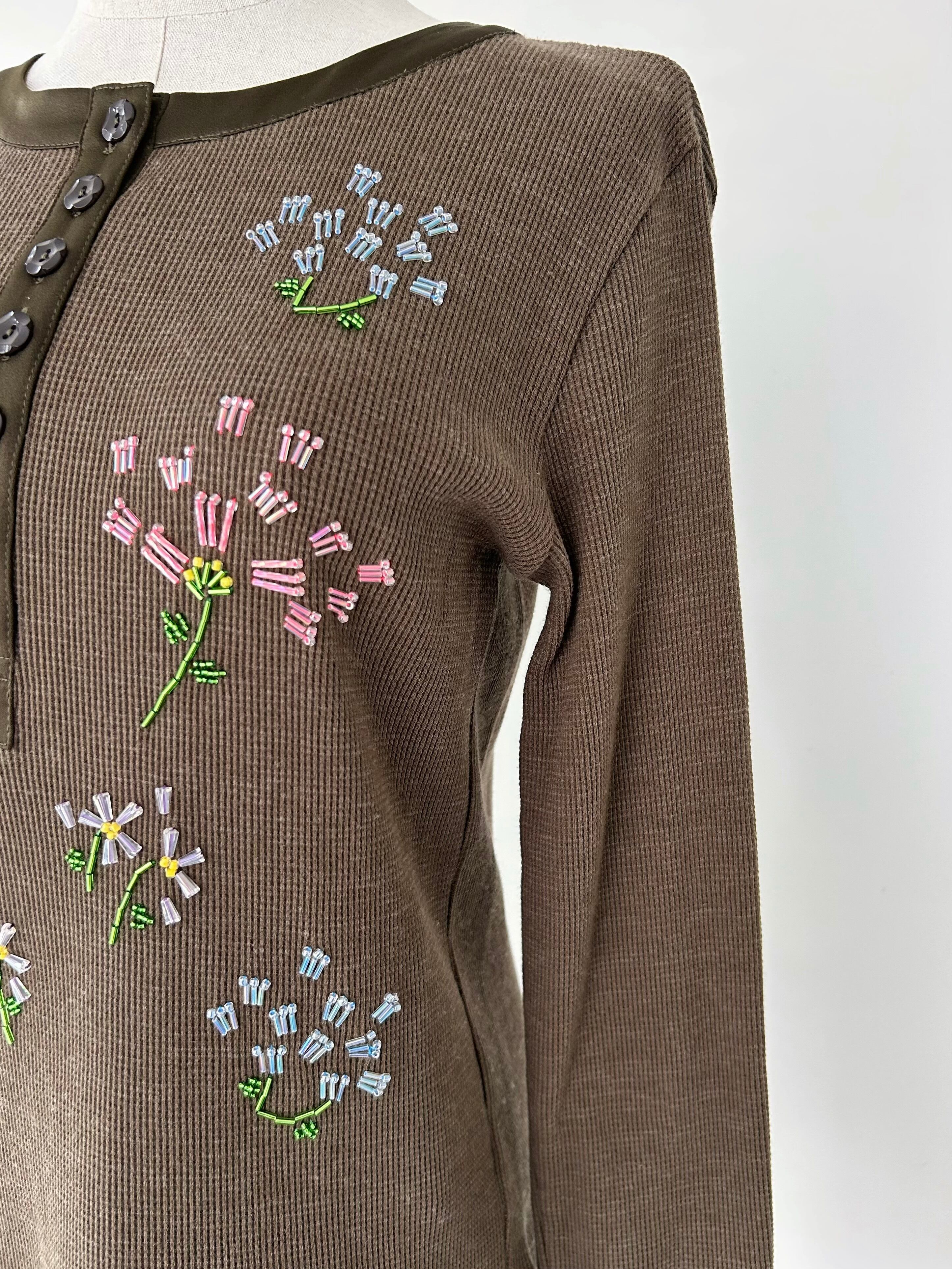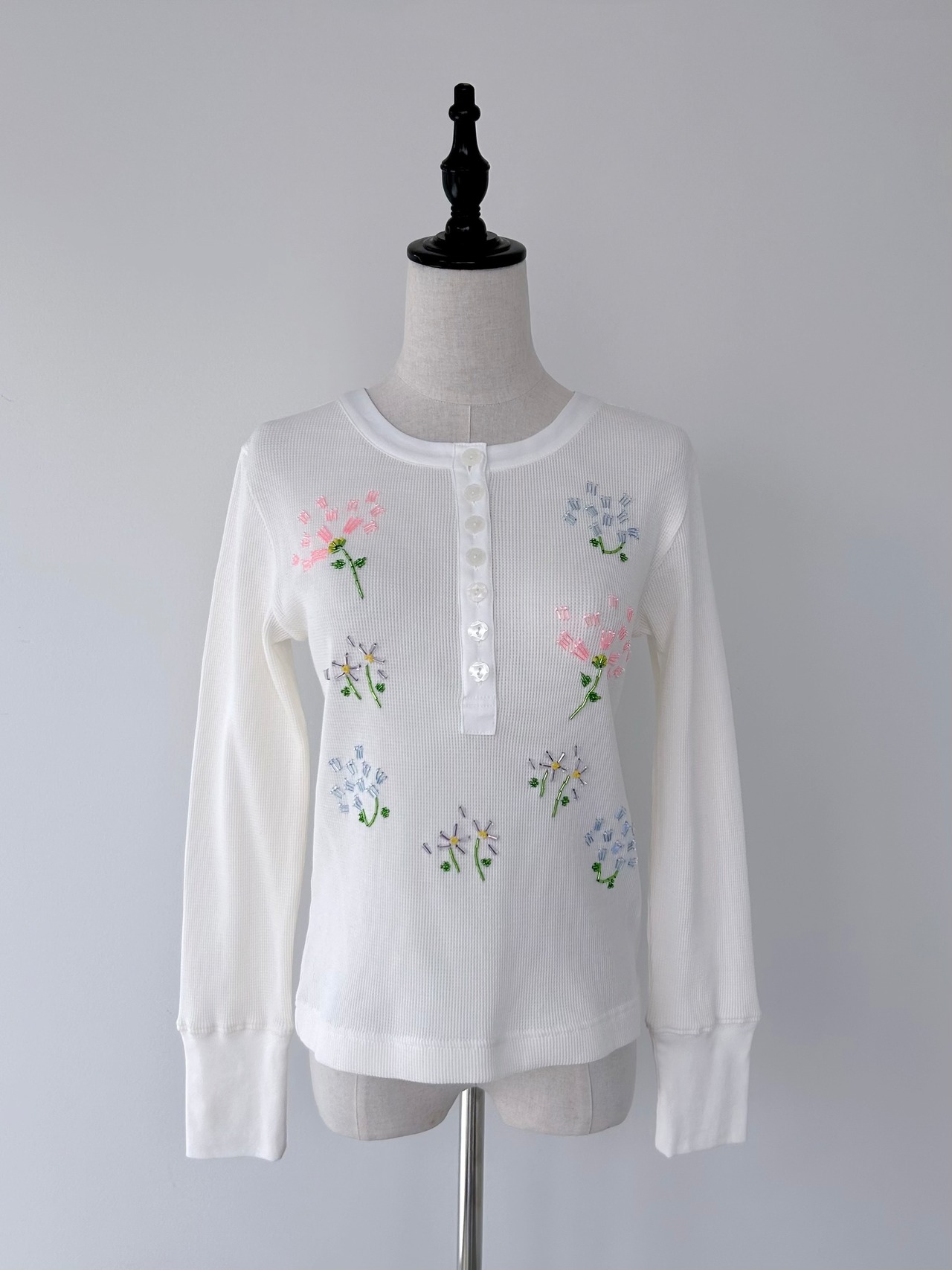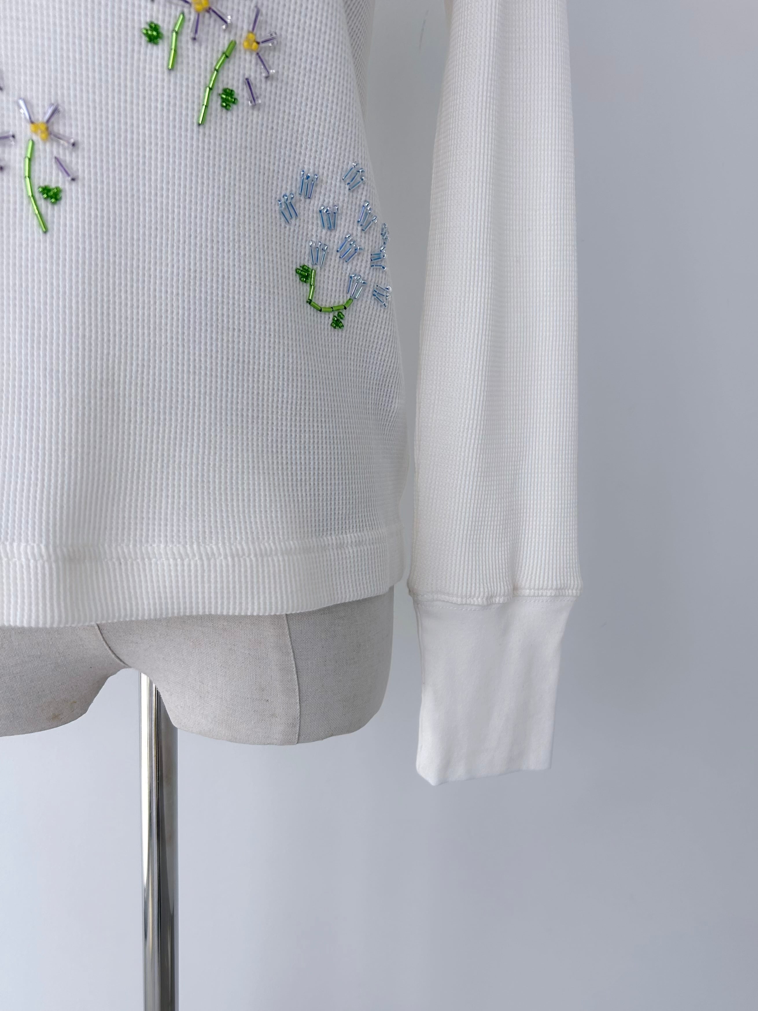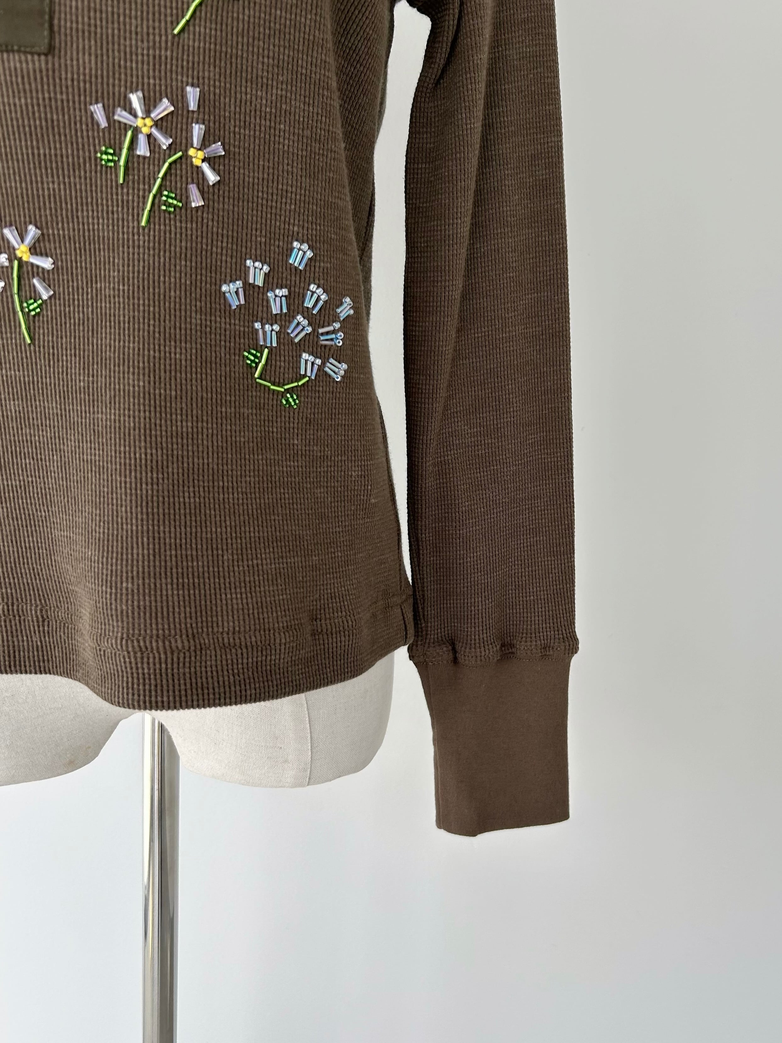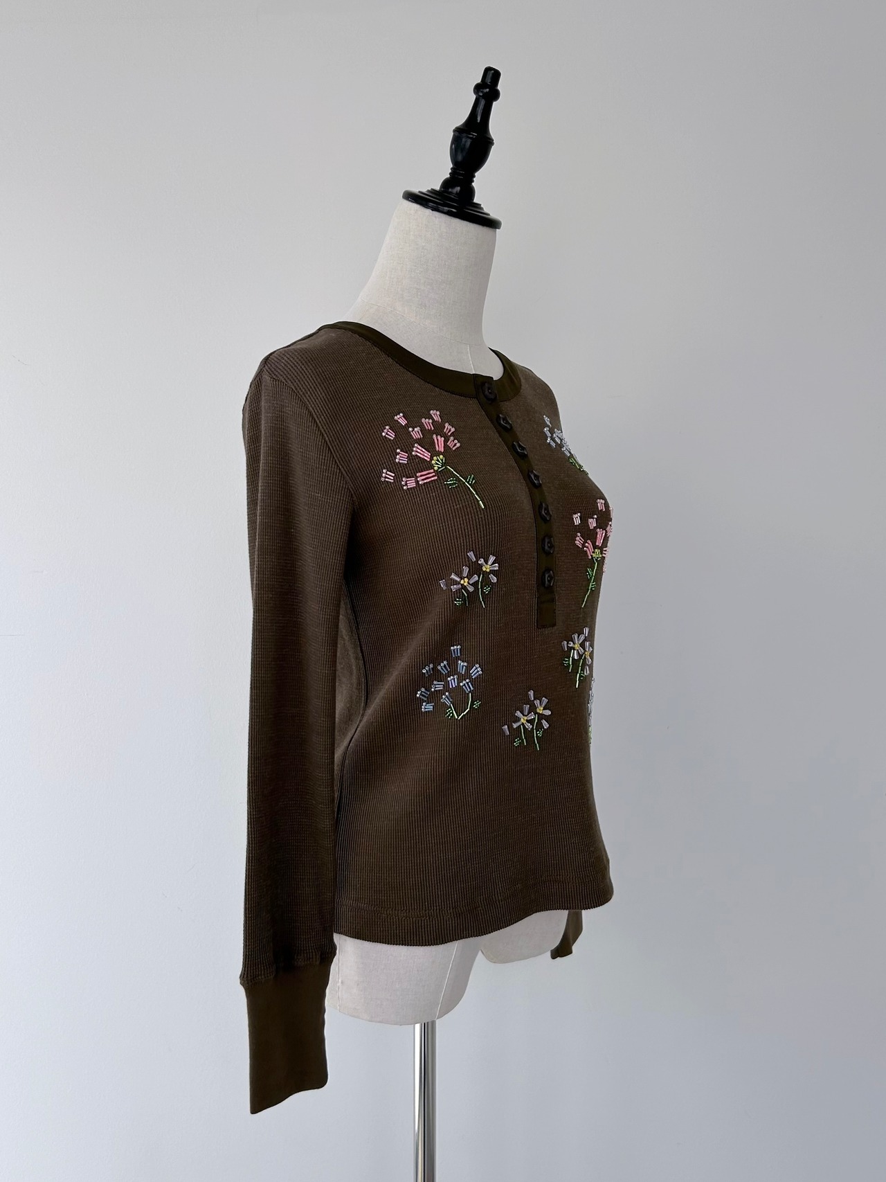 フラワーモチーフのビーズ刺繍で華やかさを添えた一着。