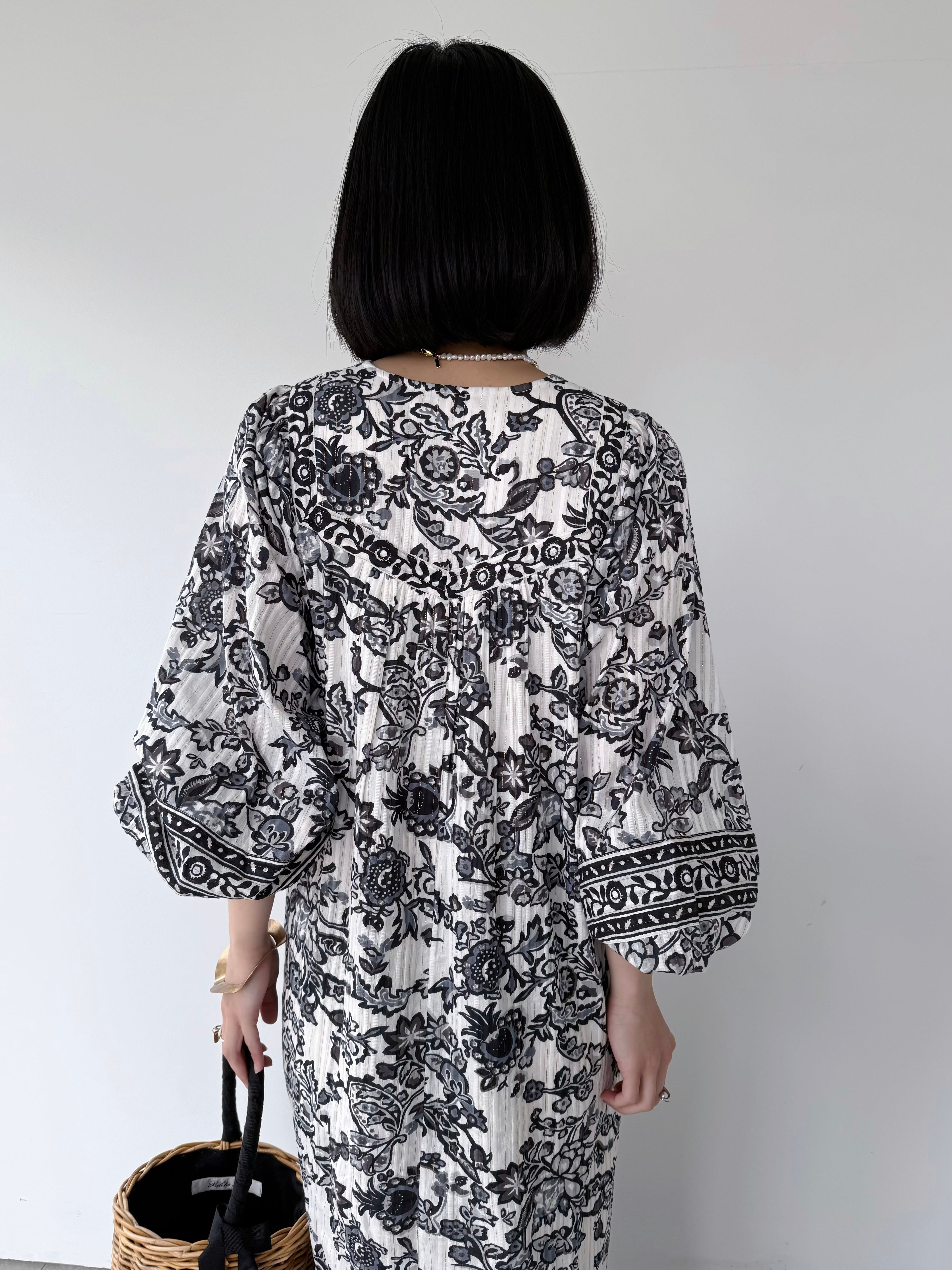 金糸を織り込んだドビー織の生地にペイズリー柄のようなフラワープリントを重ねたドレス。