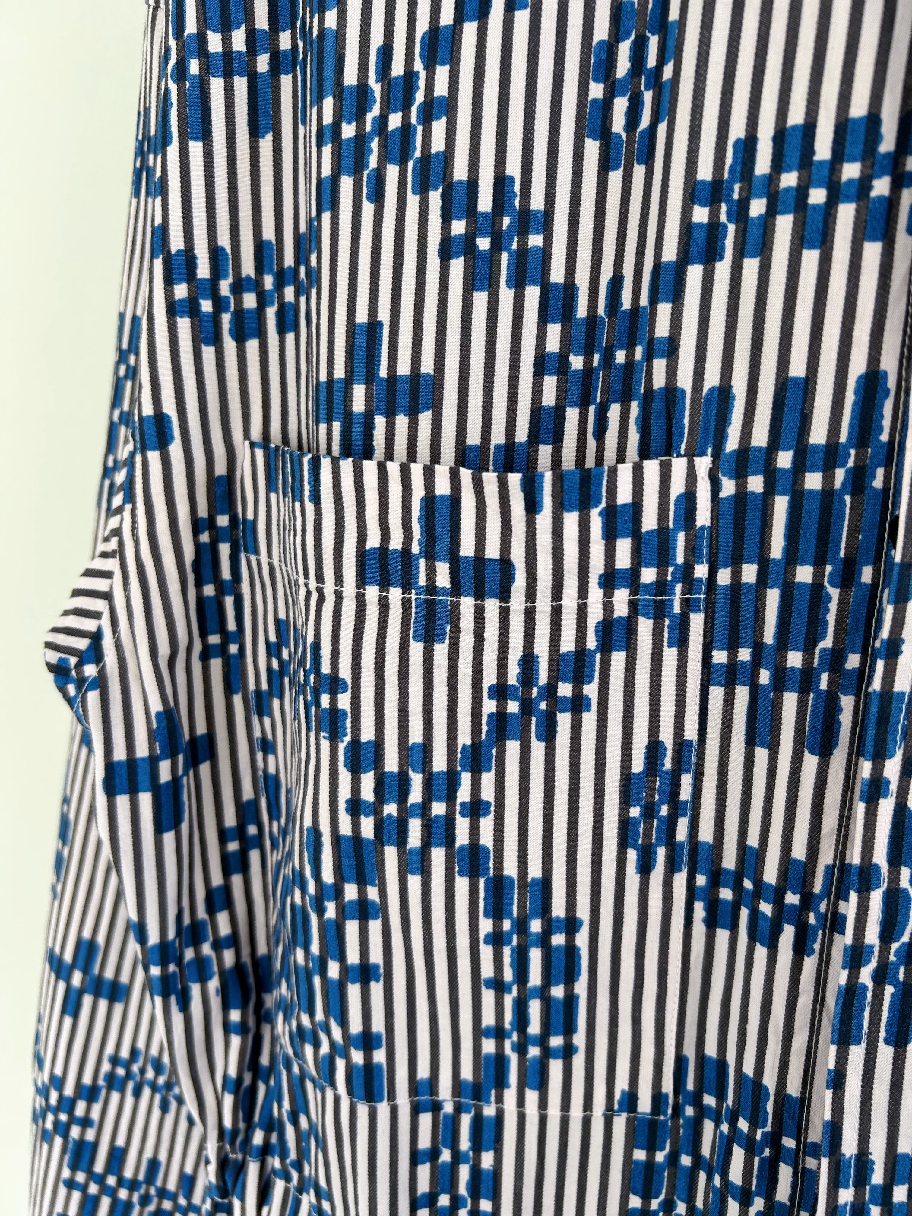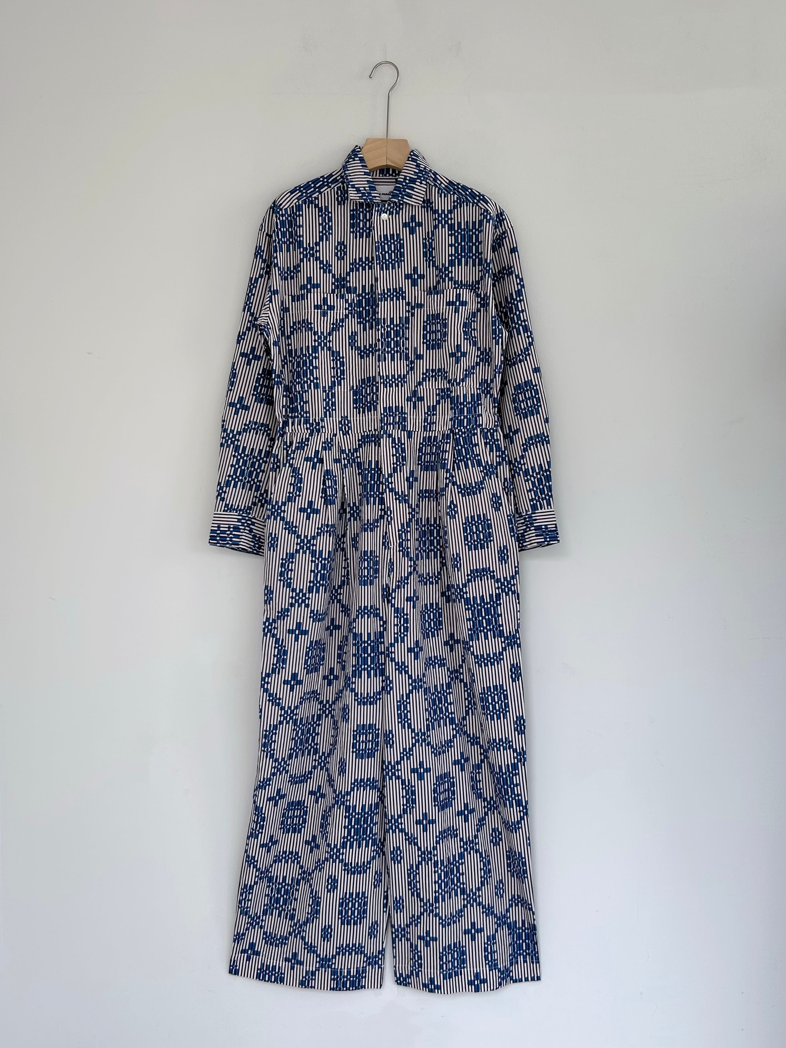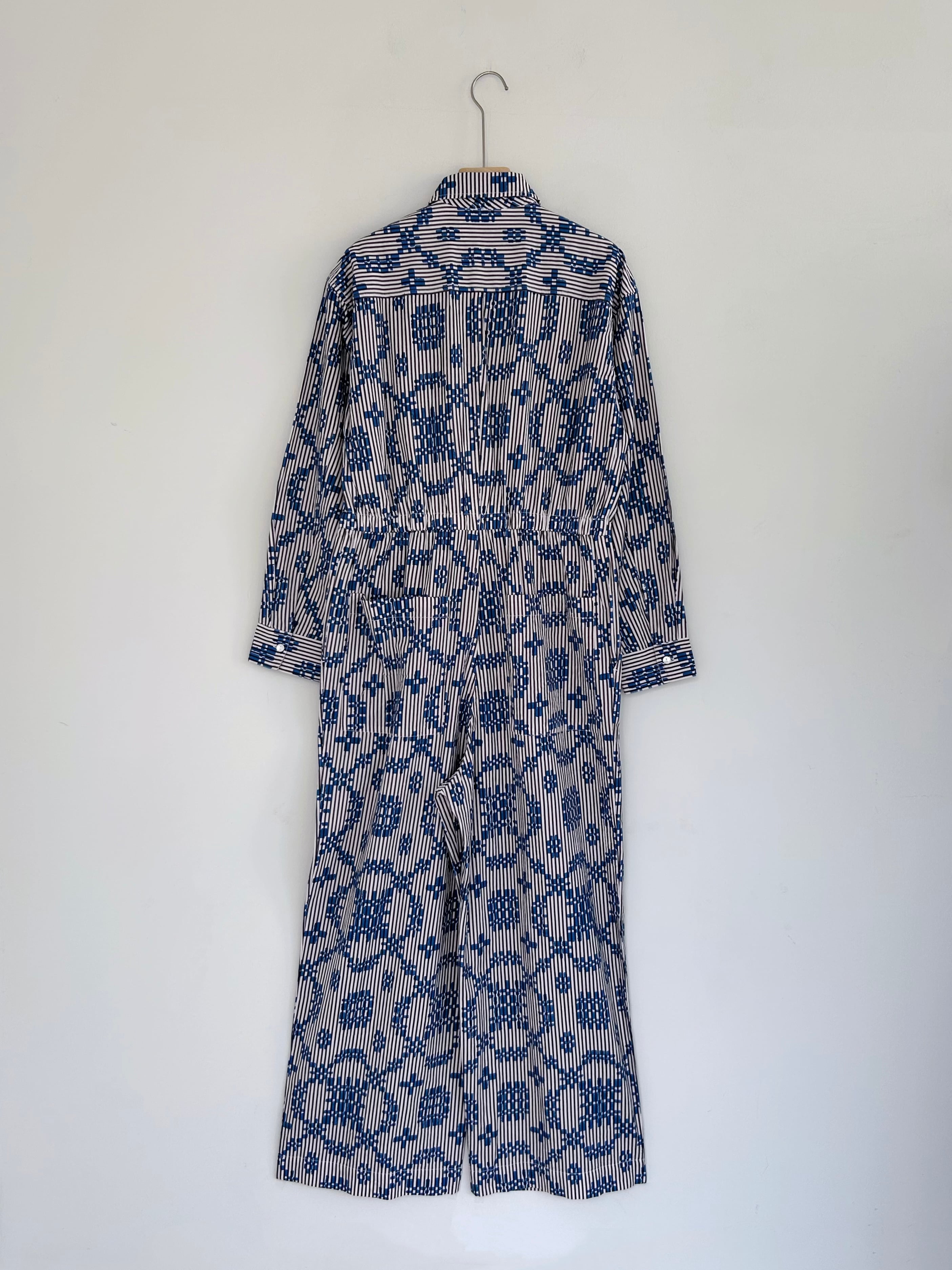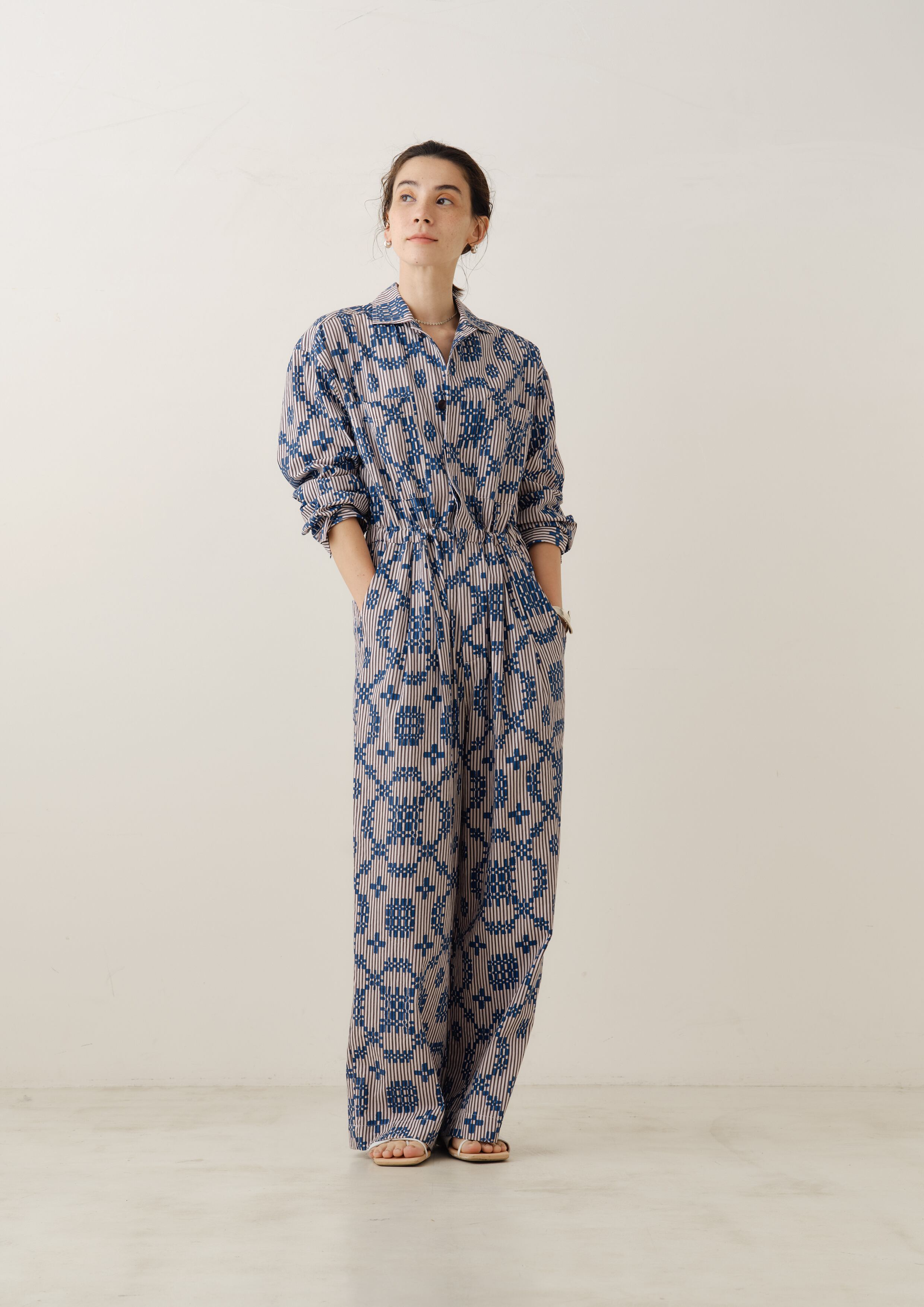 ハリのあるコットン100%のストライプ生地にオリジナルプリントを施したオールインワン。