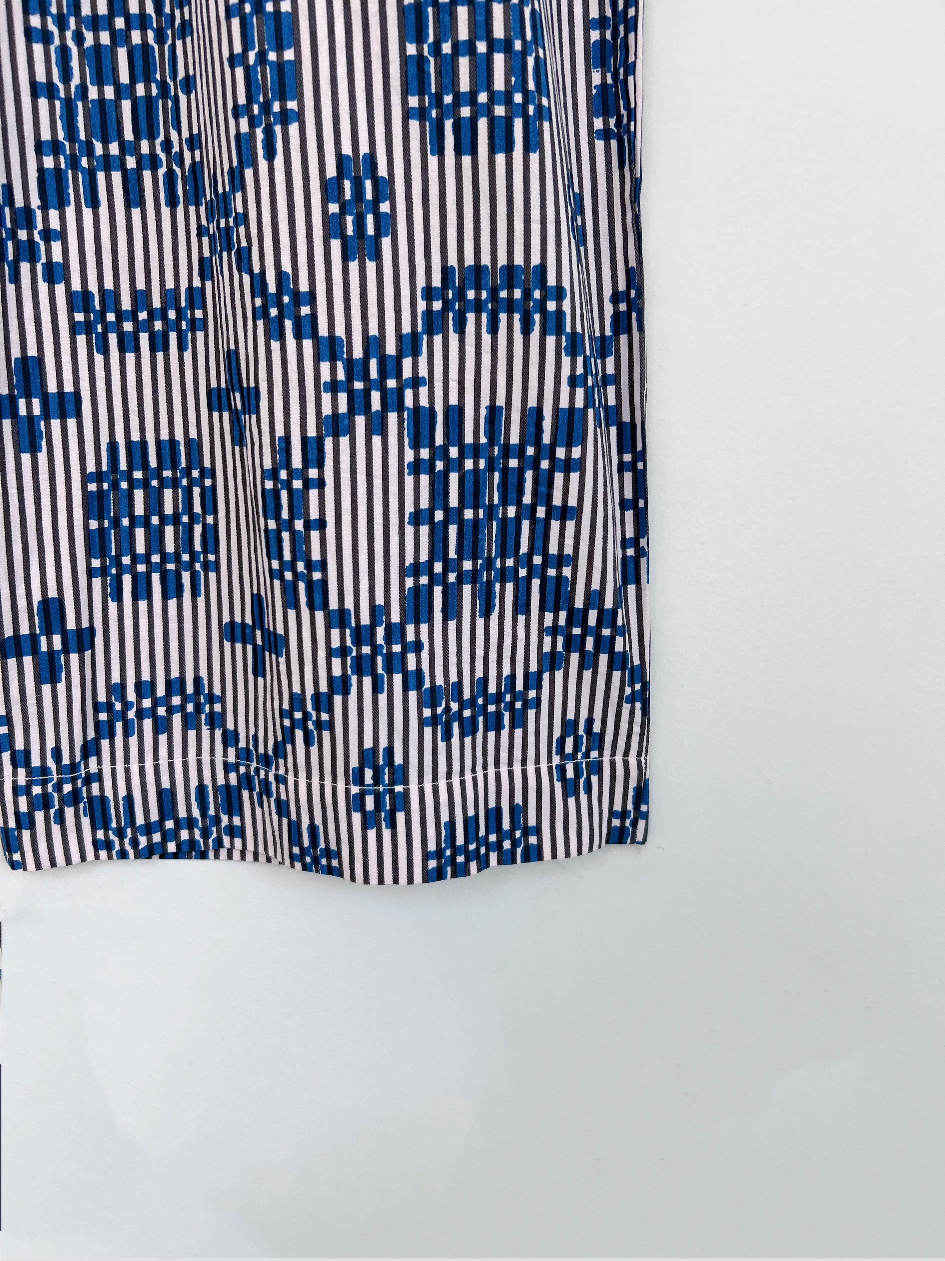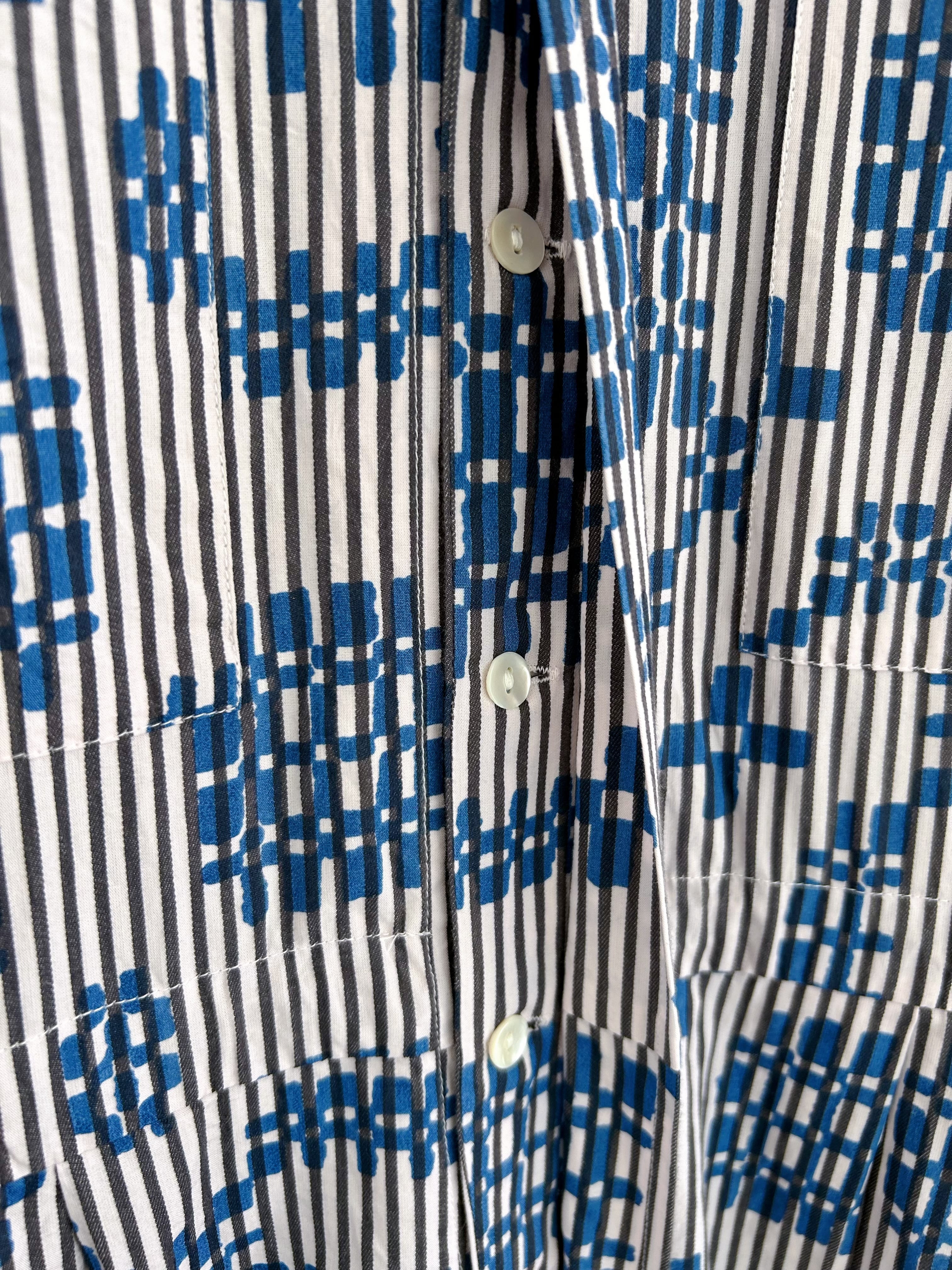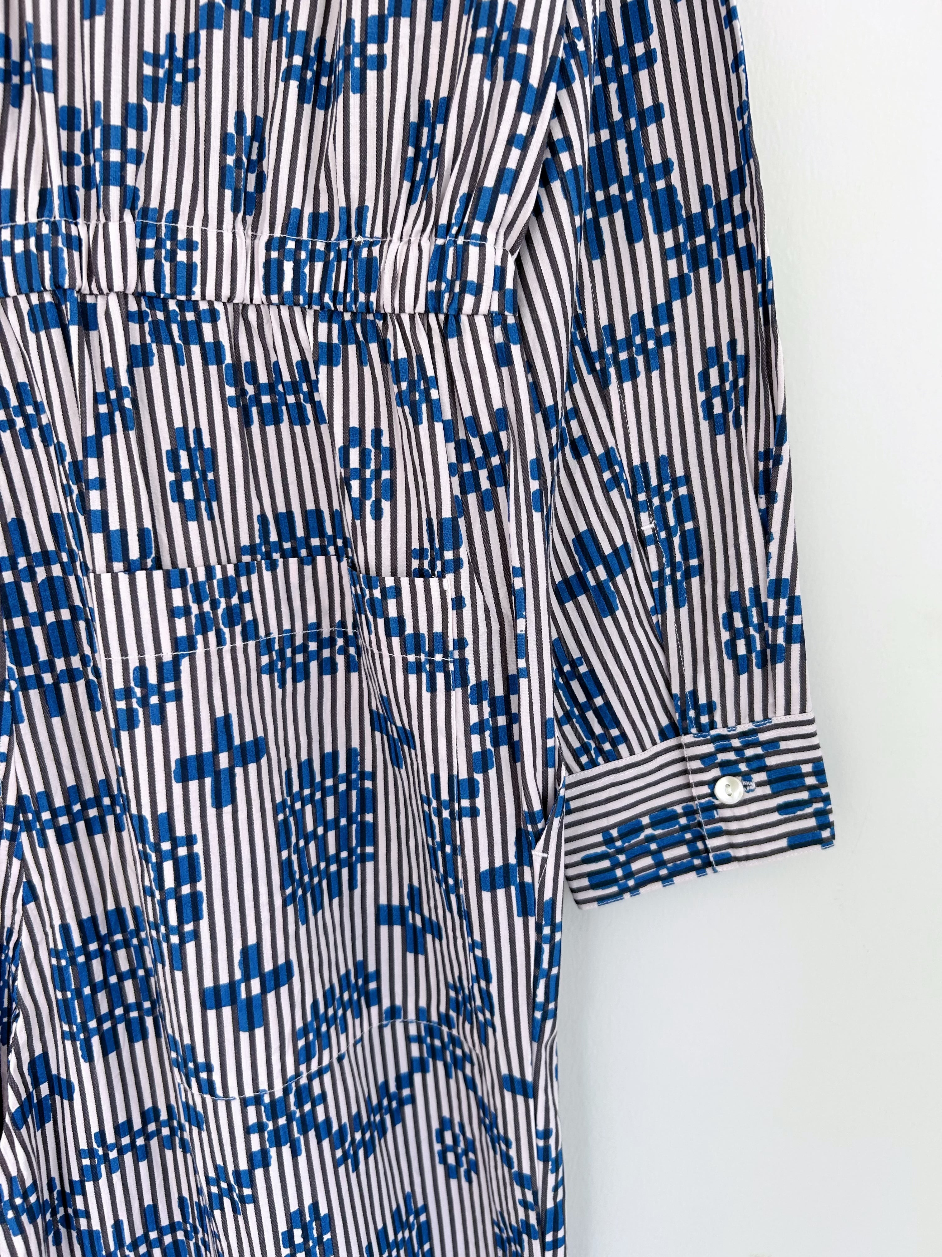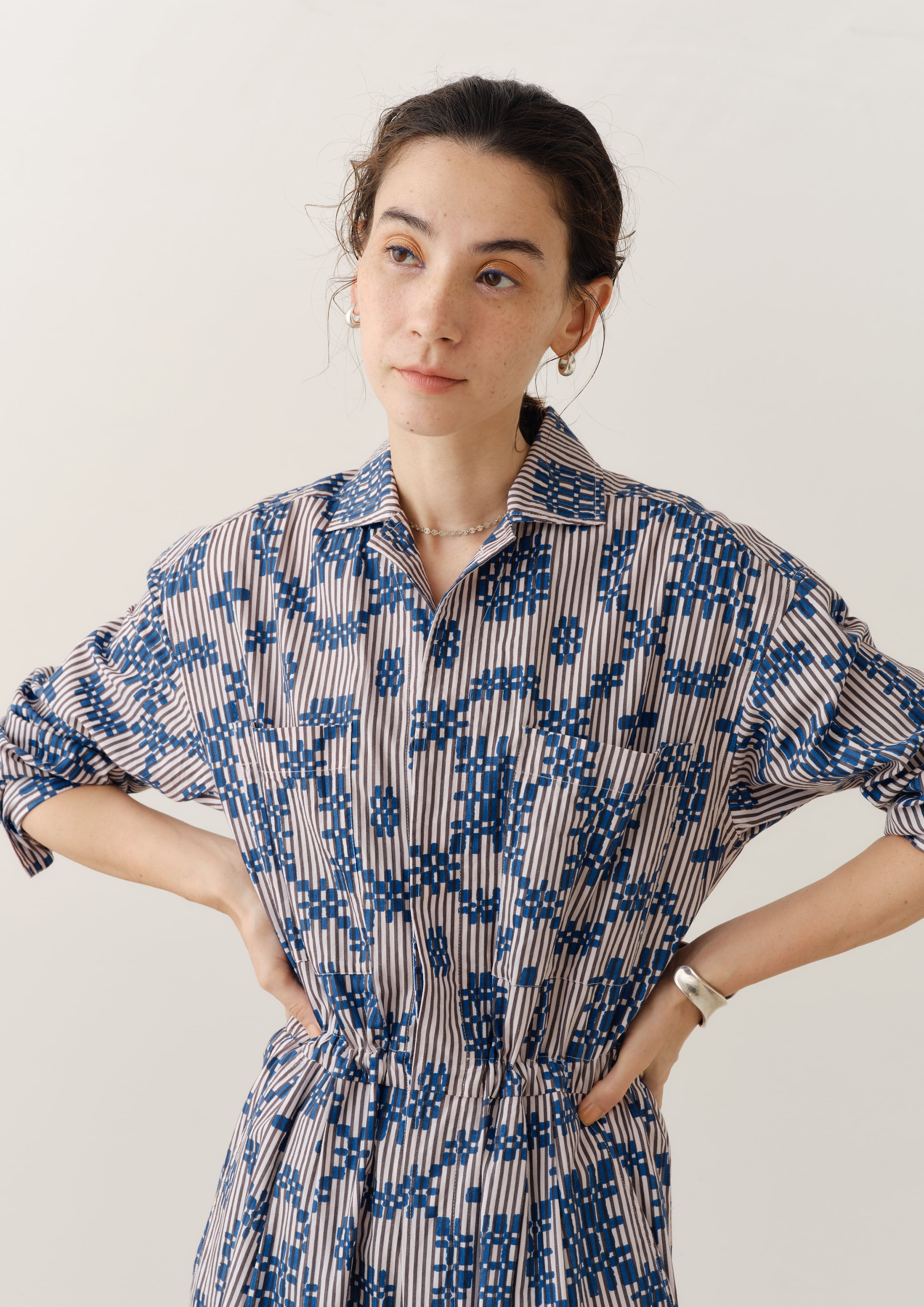 ハリのあるコットン100%のストライプ生地にオリジナルプリントを施したオールインワン。