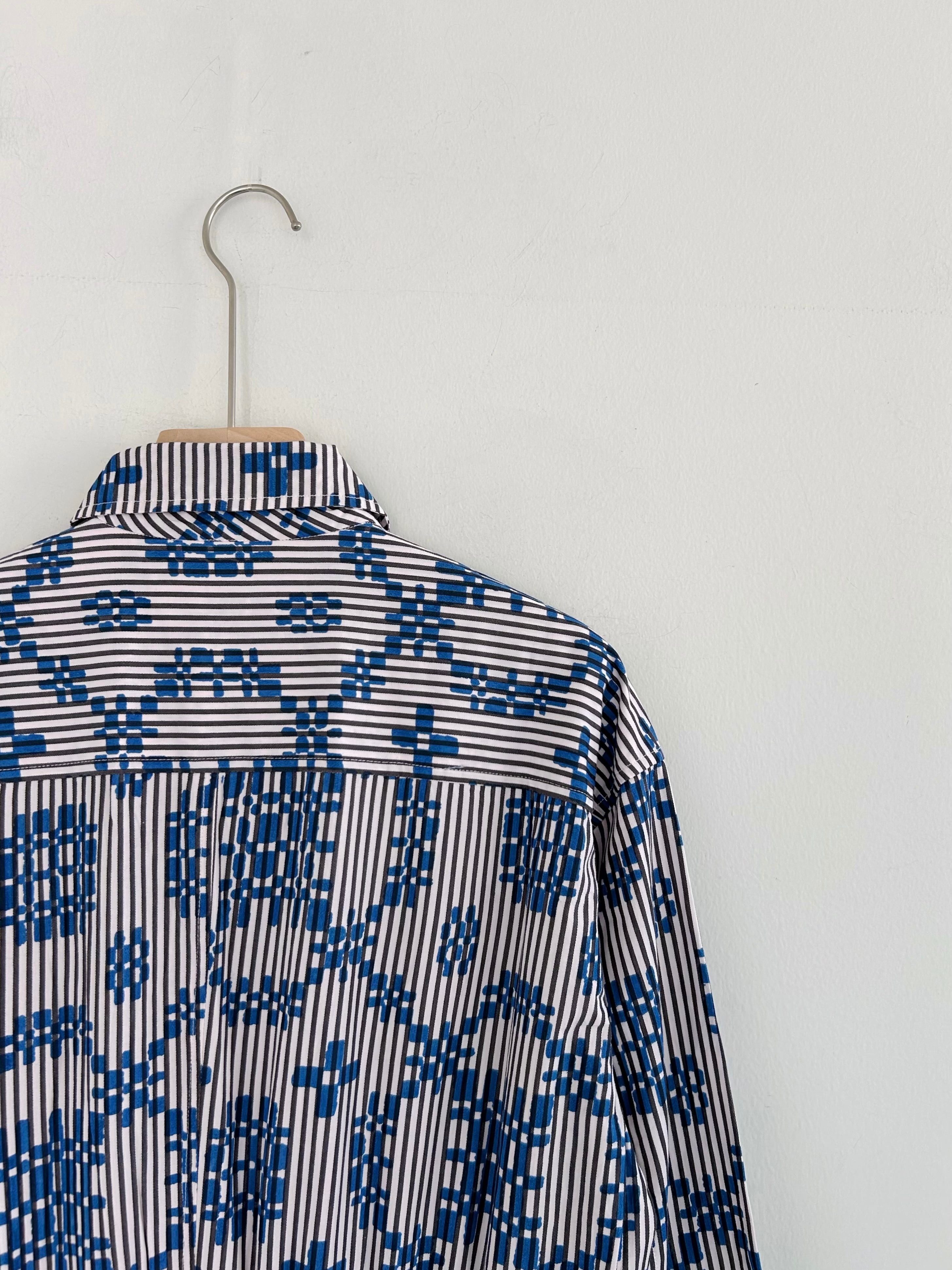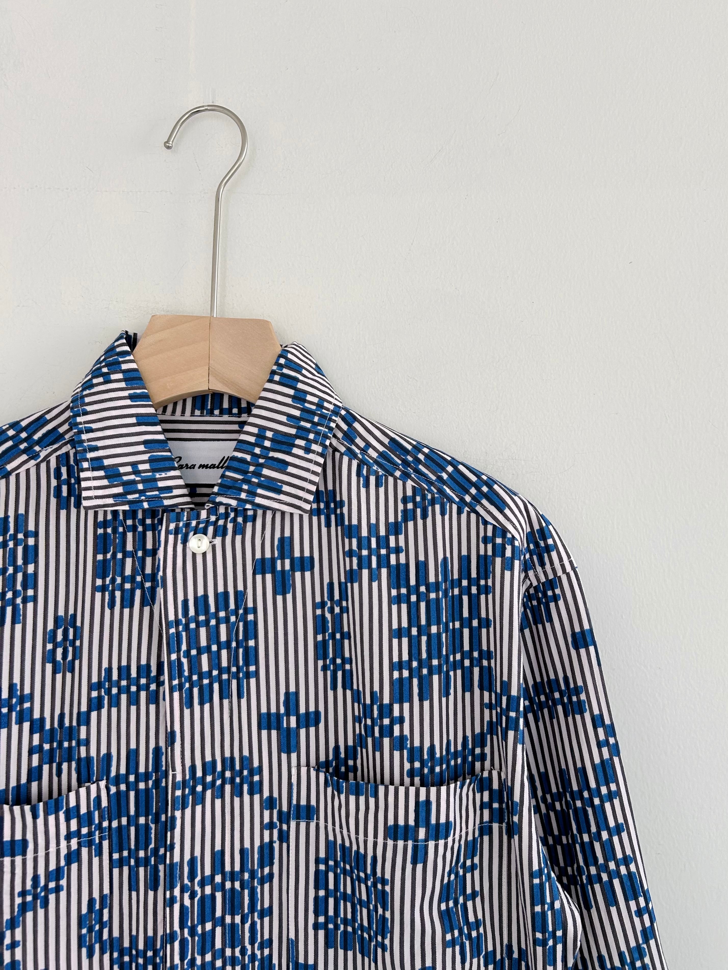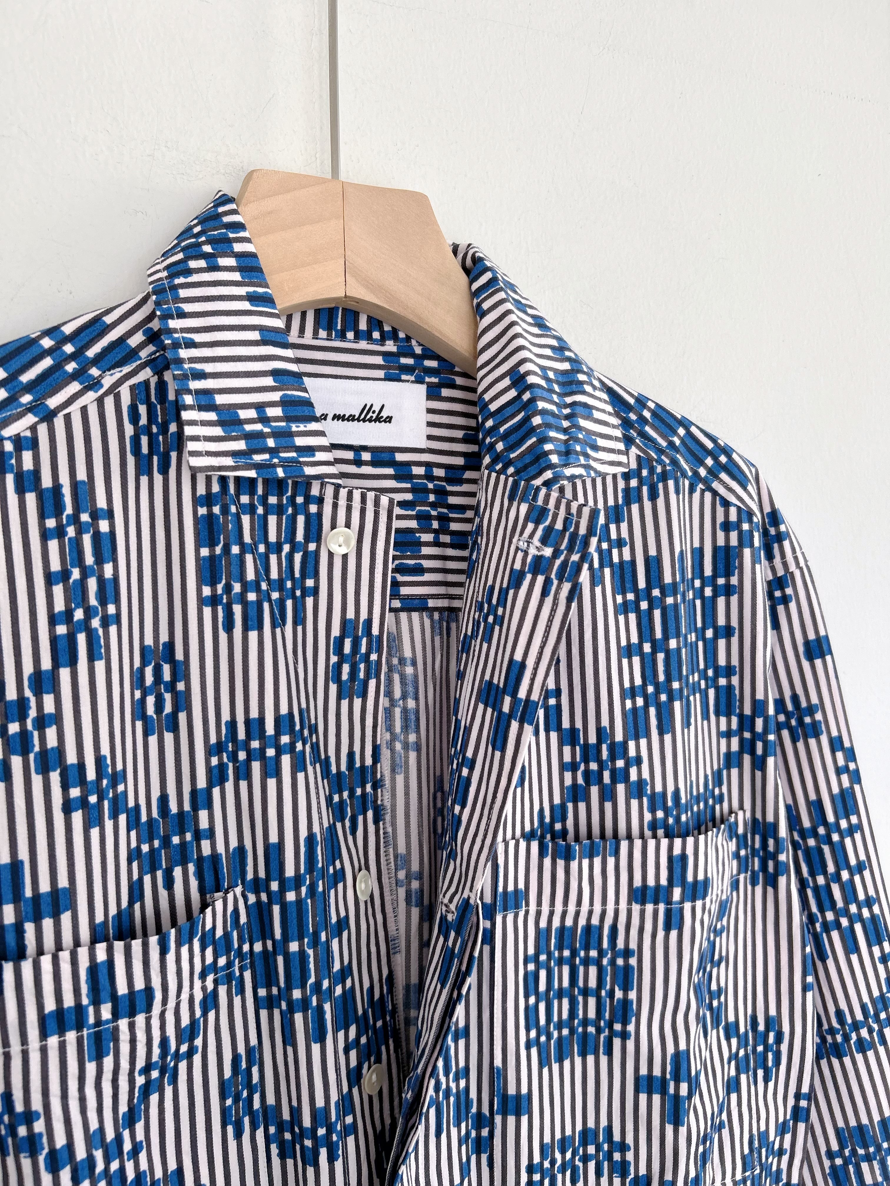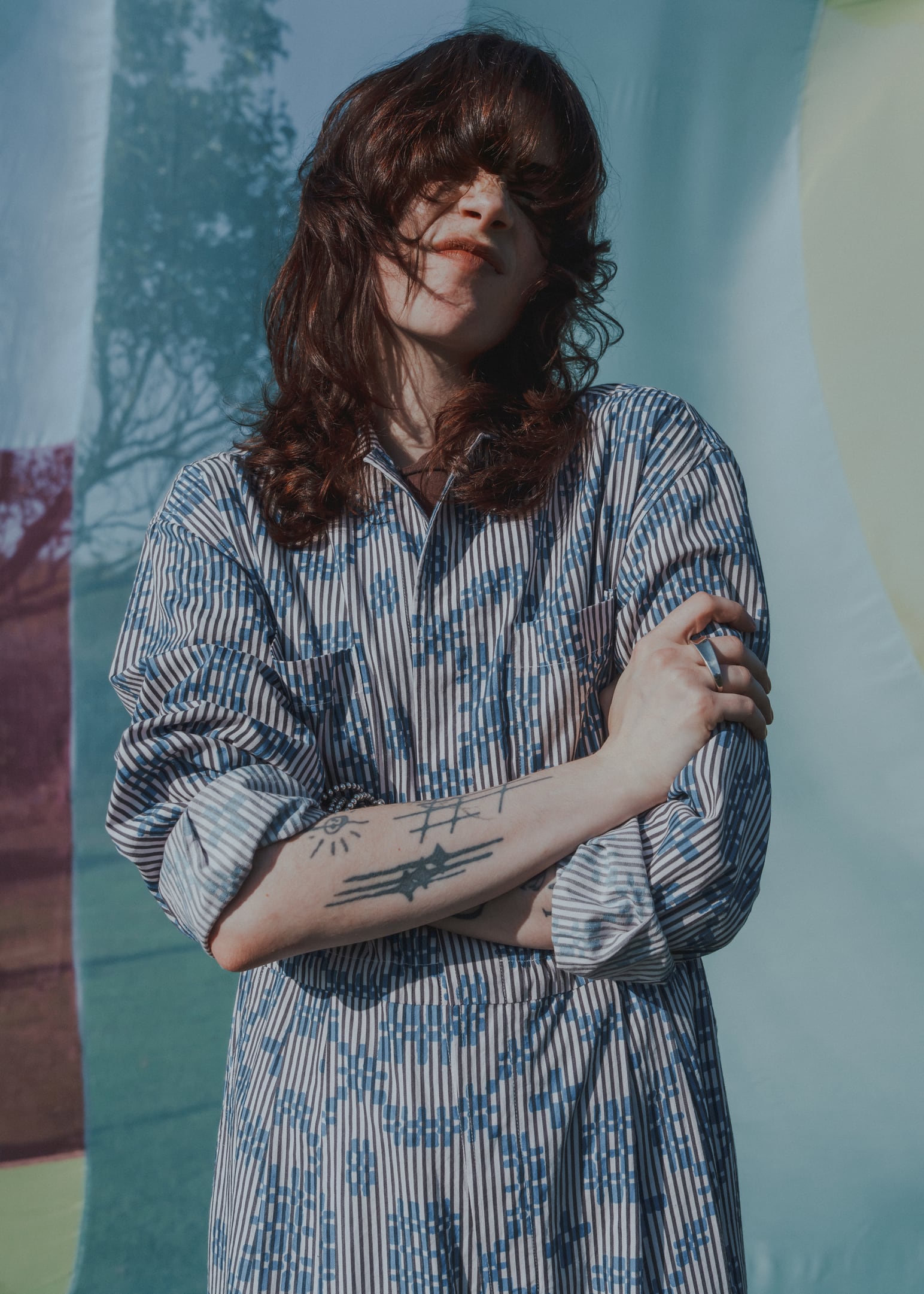 ハリのあるコットン100%のストライプ生地にオリジナルプリントを施したオールインワン。