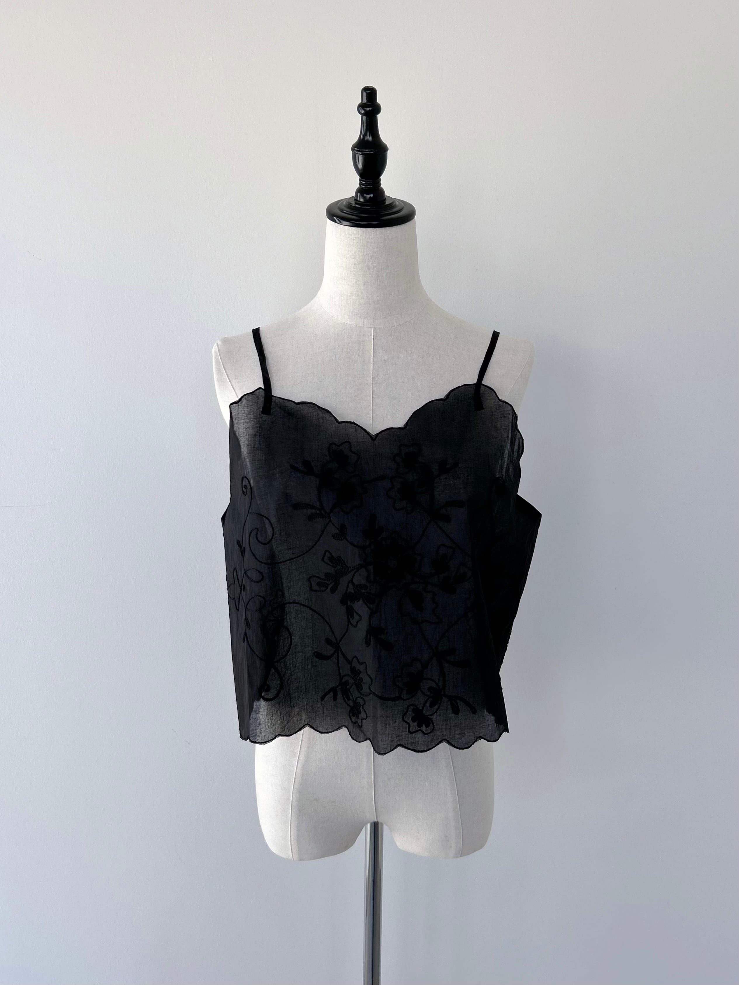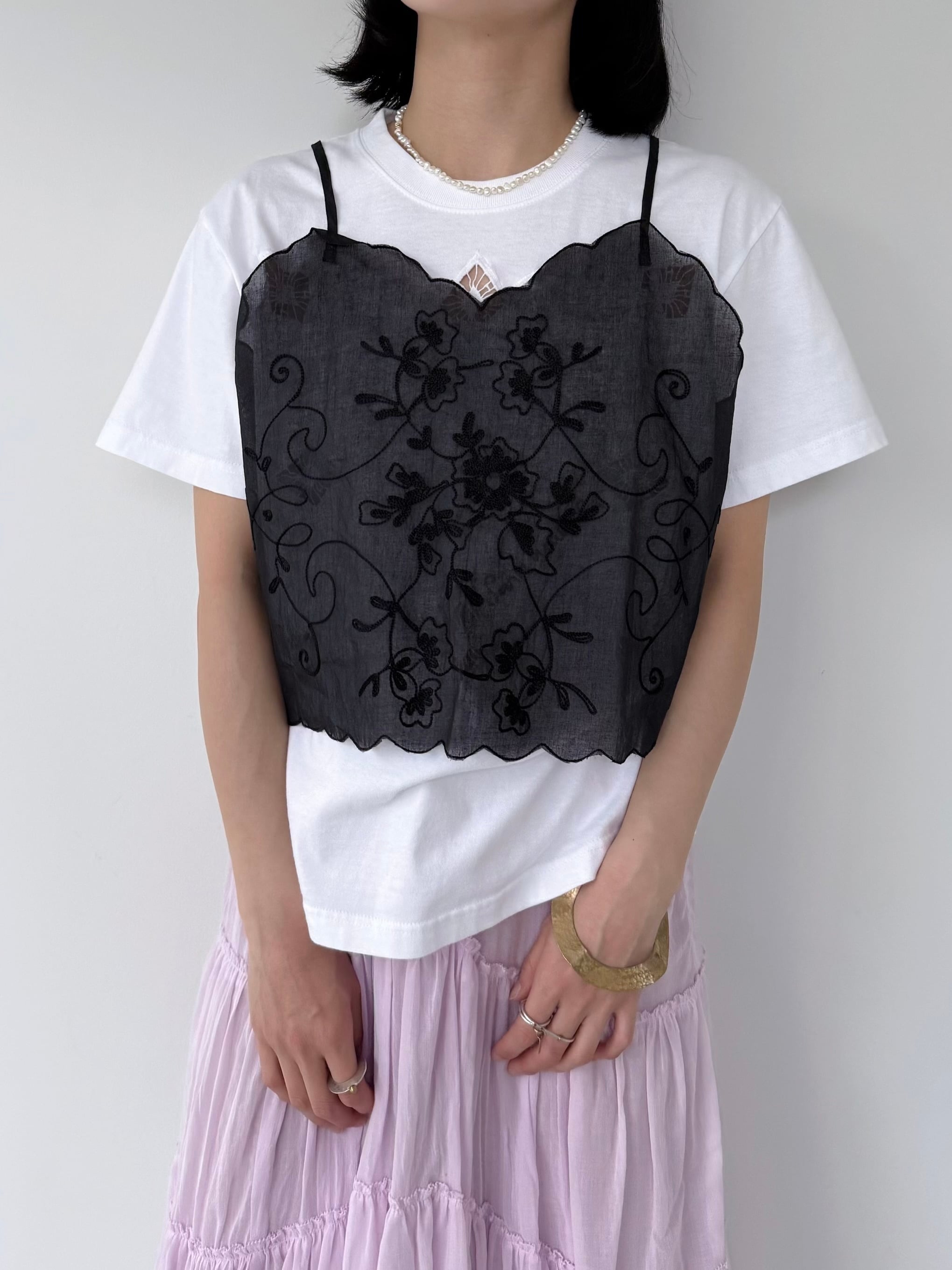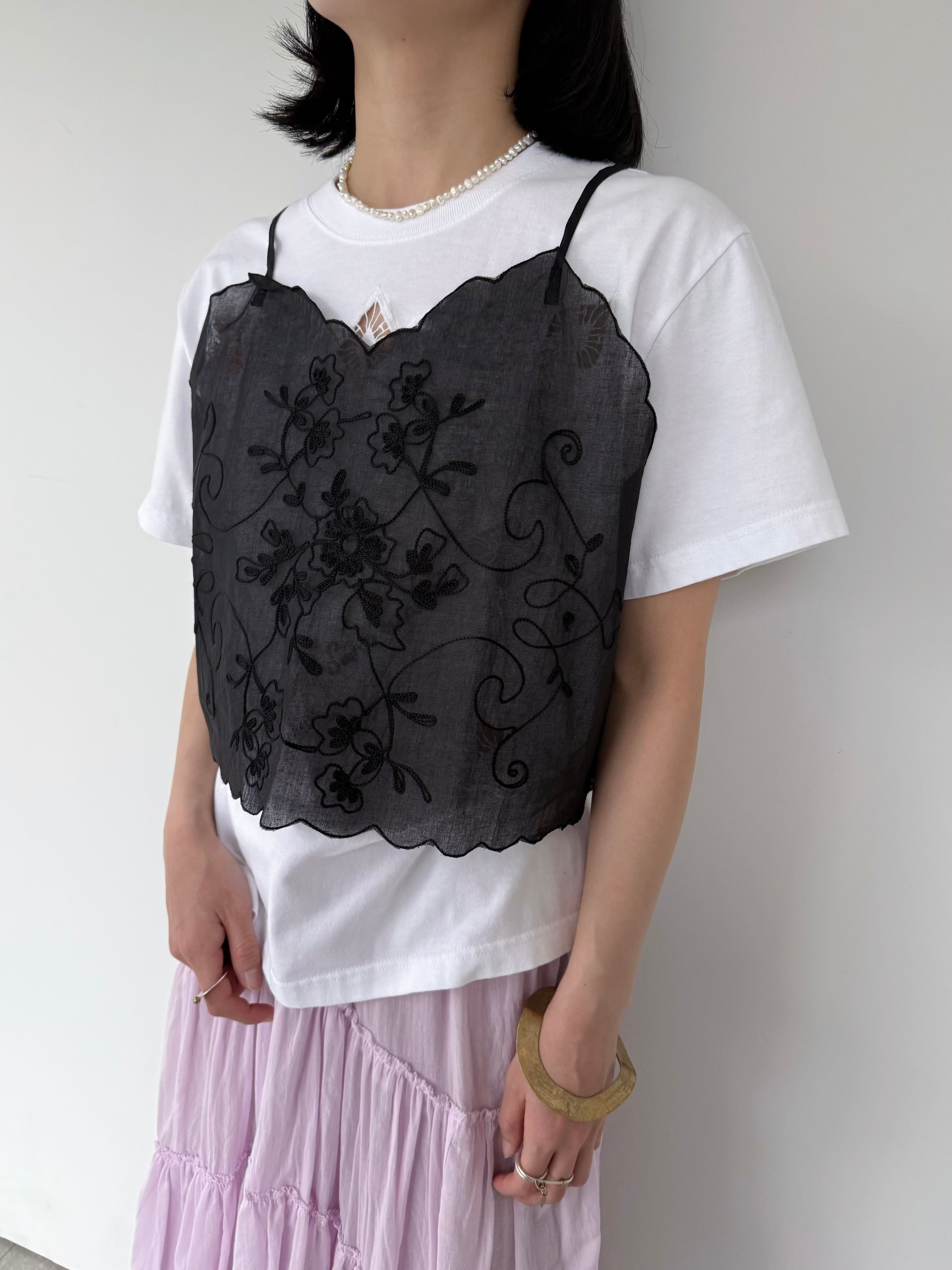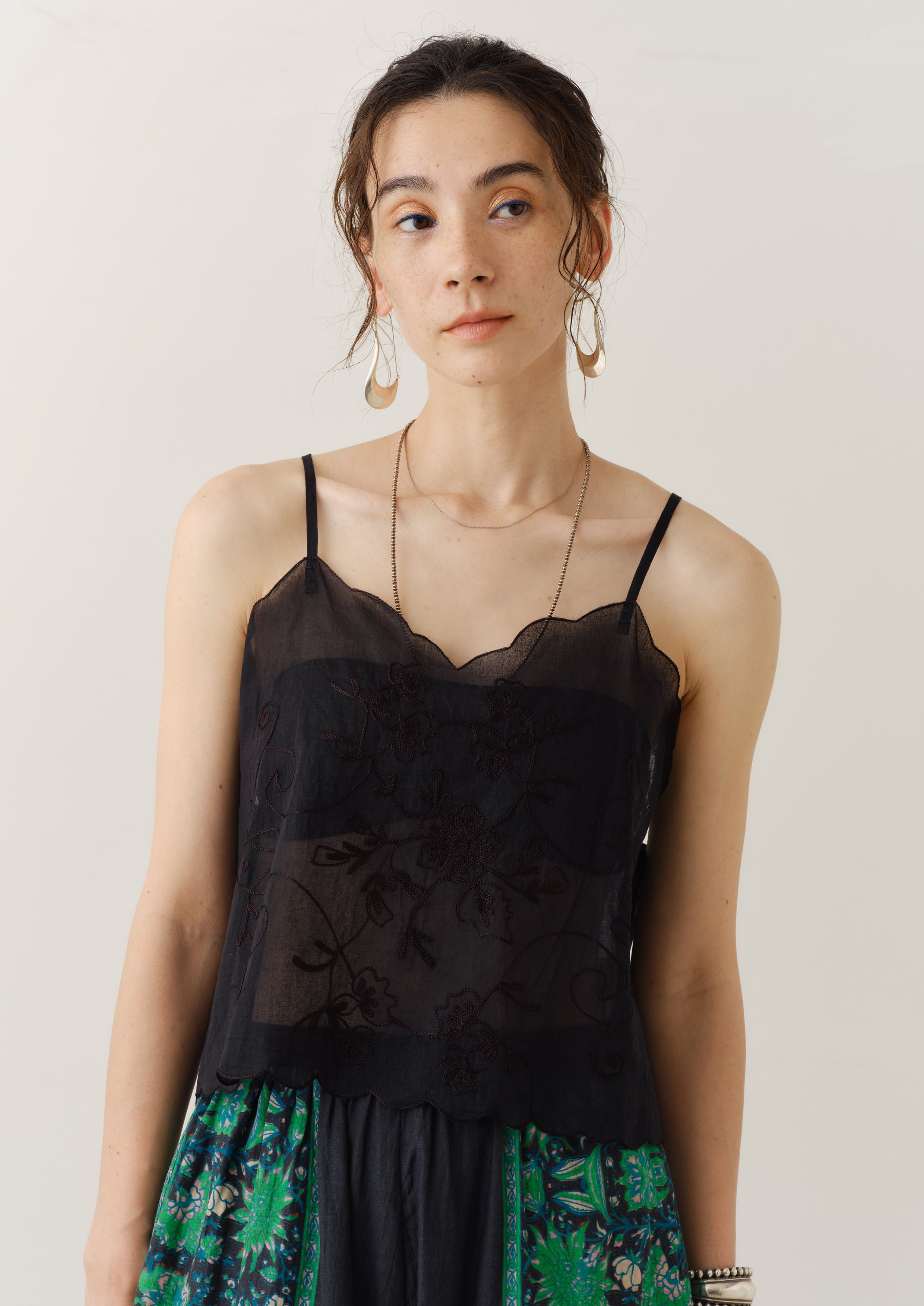 軽やかなコットンオーガンザの生地に、インド伝統のアリ刺繍を贅沢にあしらったキャミソールトップ。
