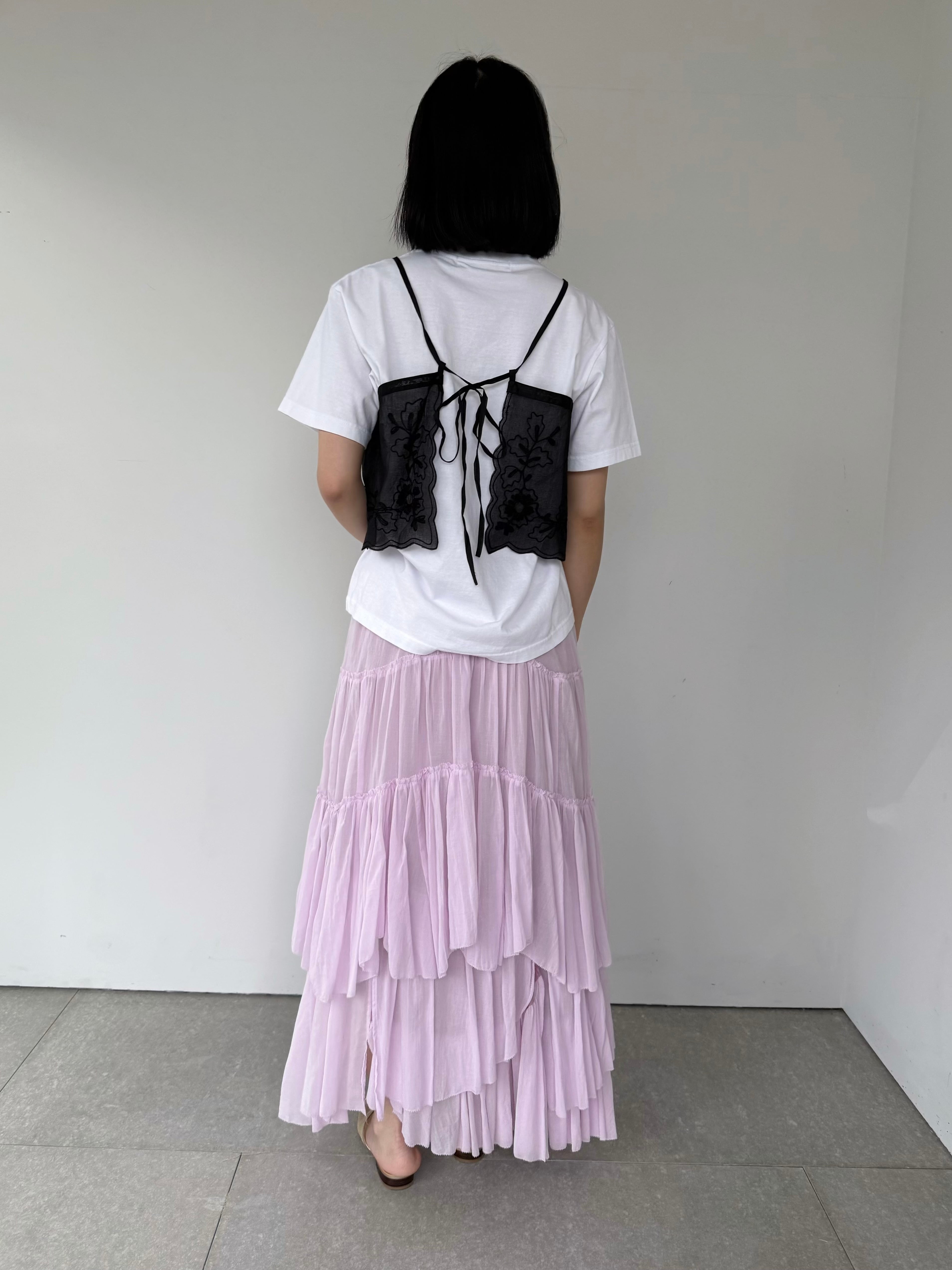 ヴィンテージライクな刺繍と、波打つようにカットオフされた裾が、可憐さとモードを両立。