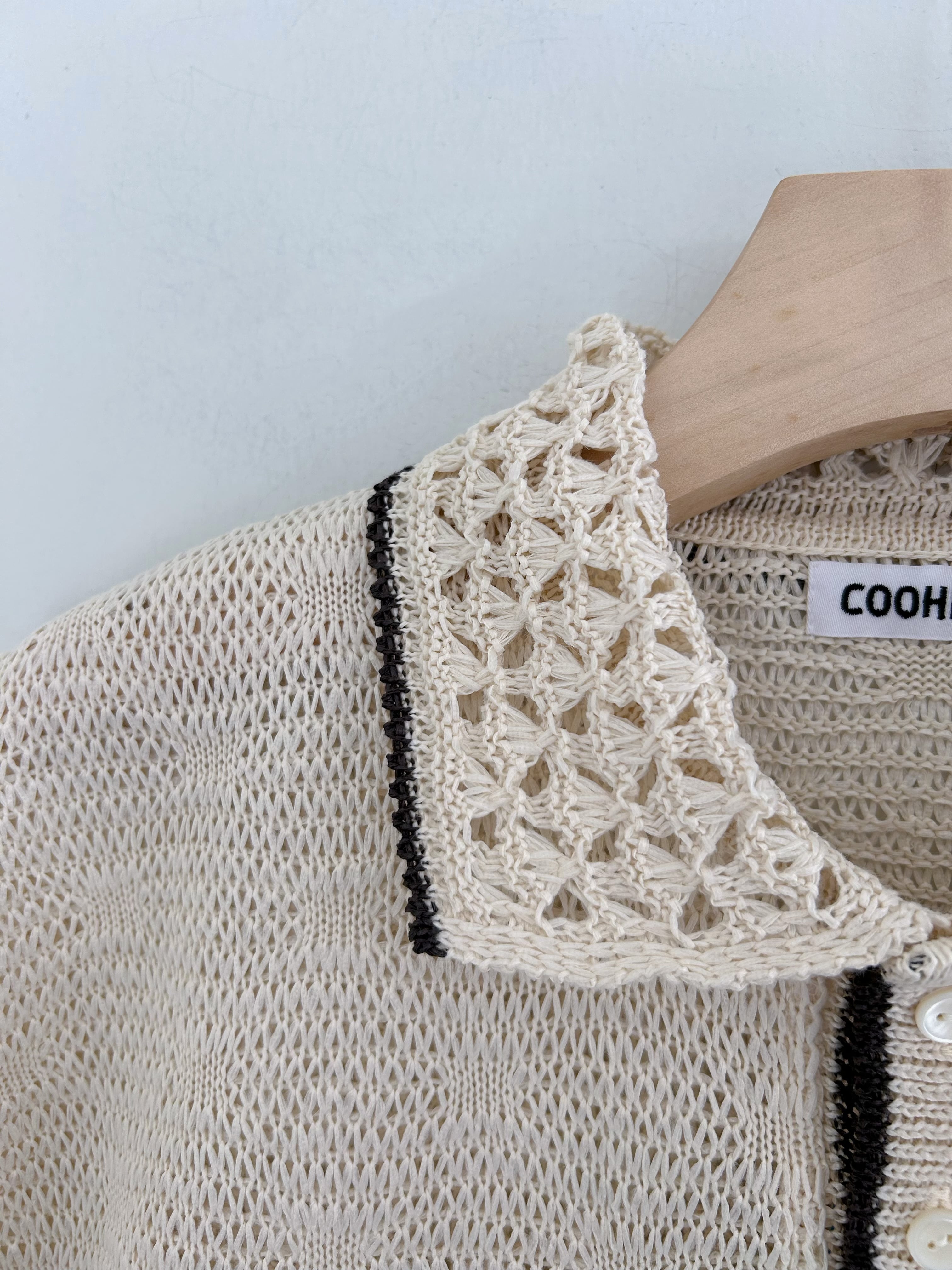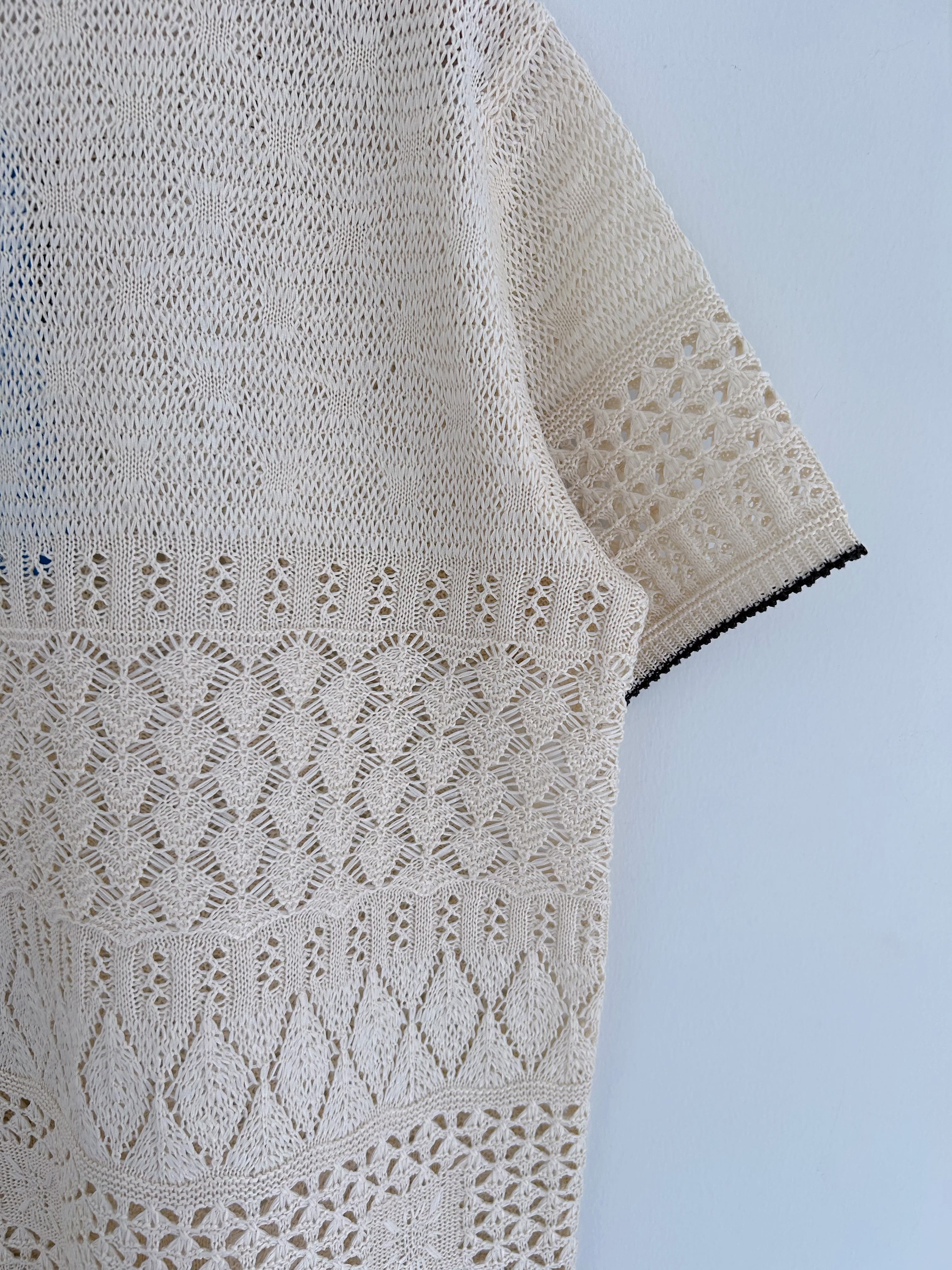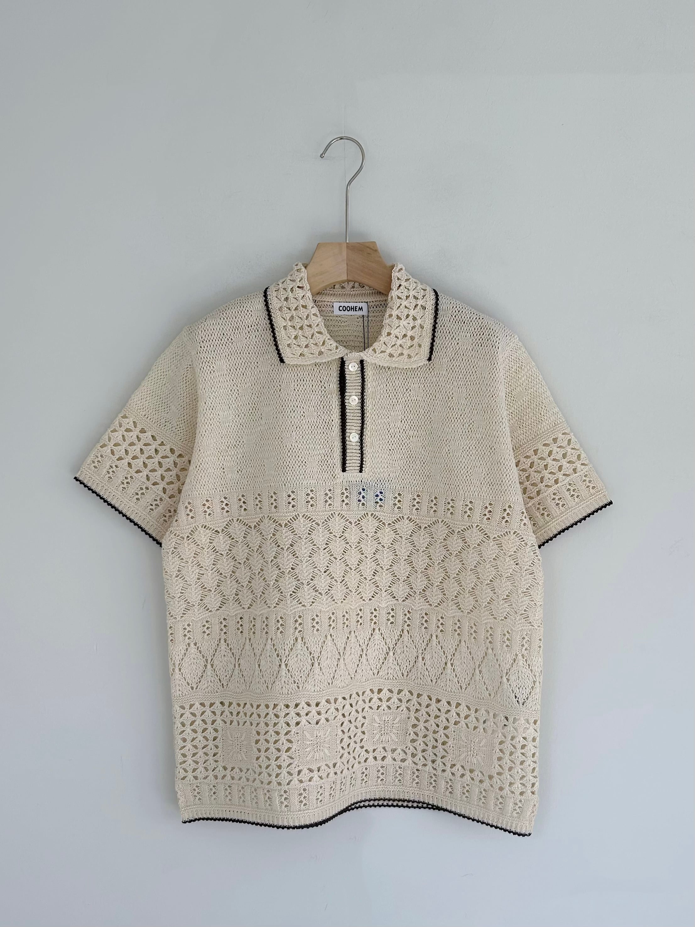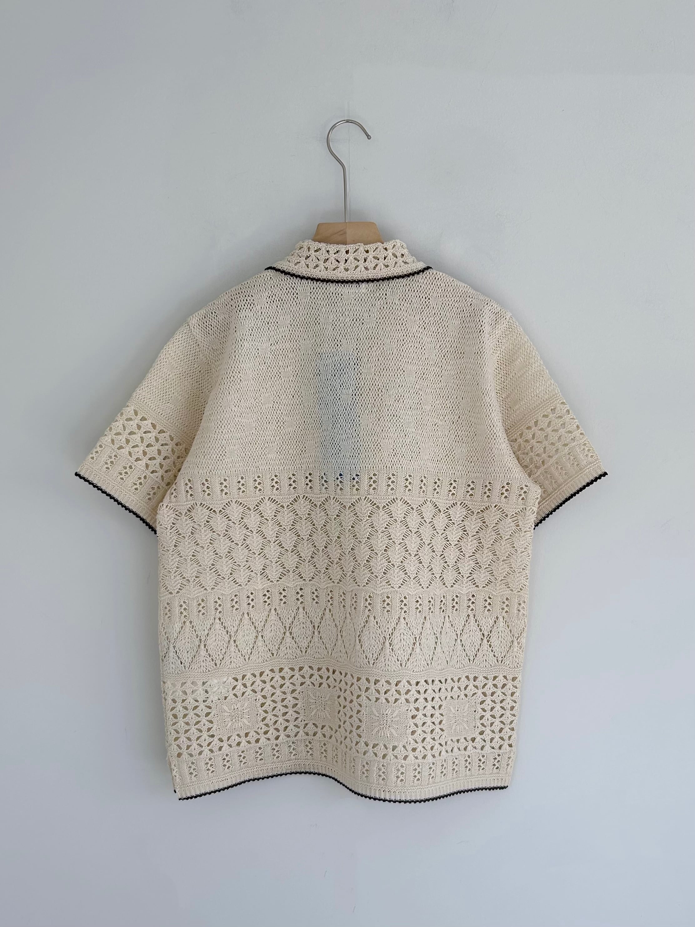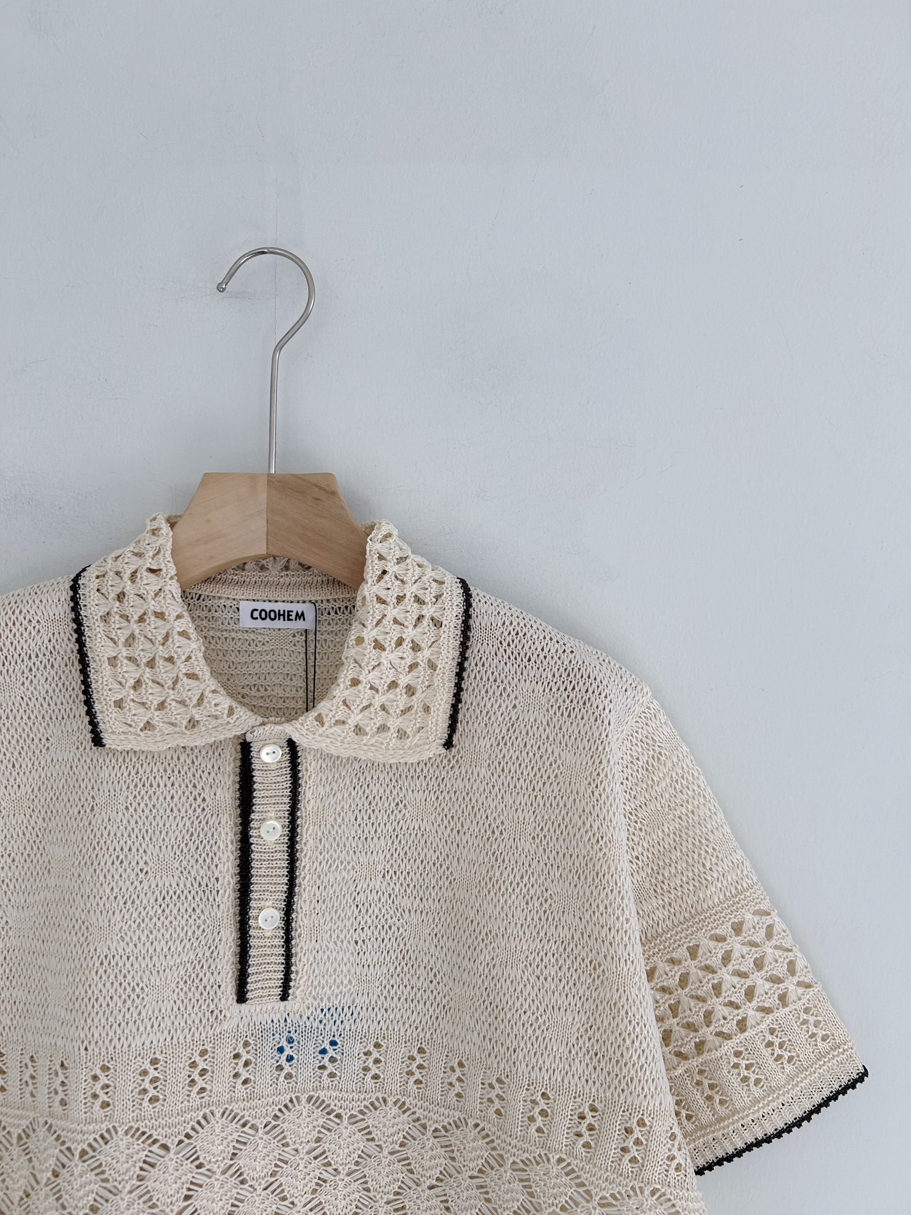 Yonetomiアーカイブスから引用した透かし編みをポリエステルのテープ糸で表現したニットポロ。
