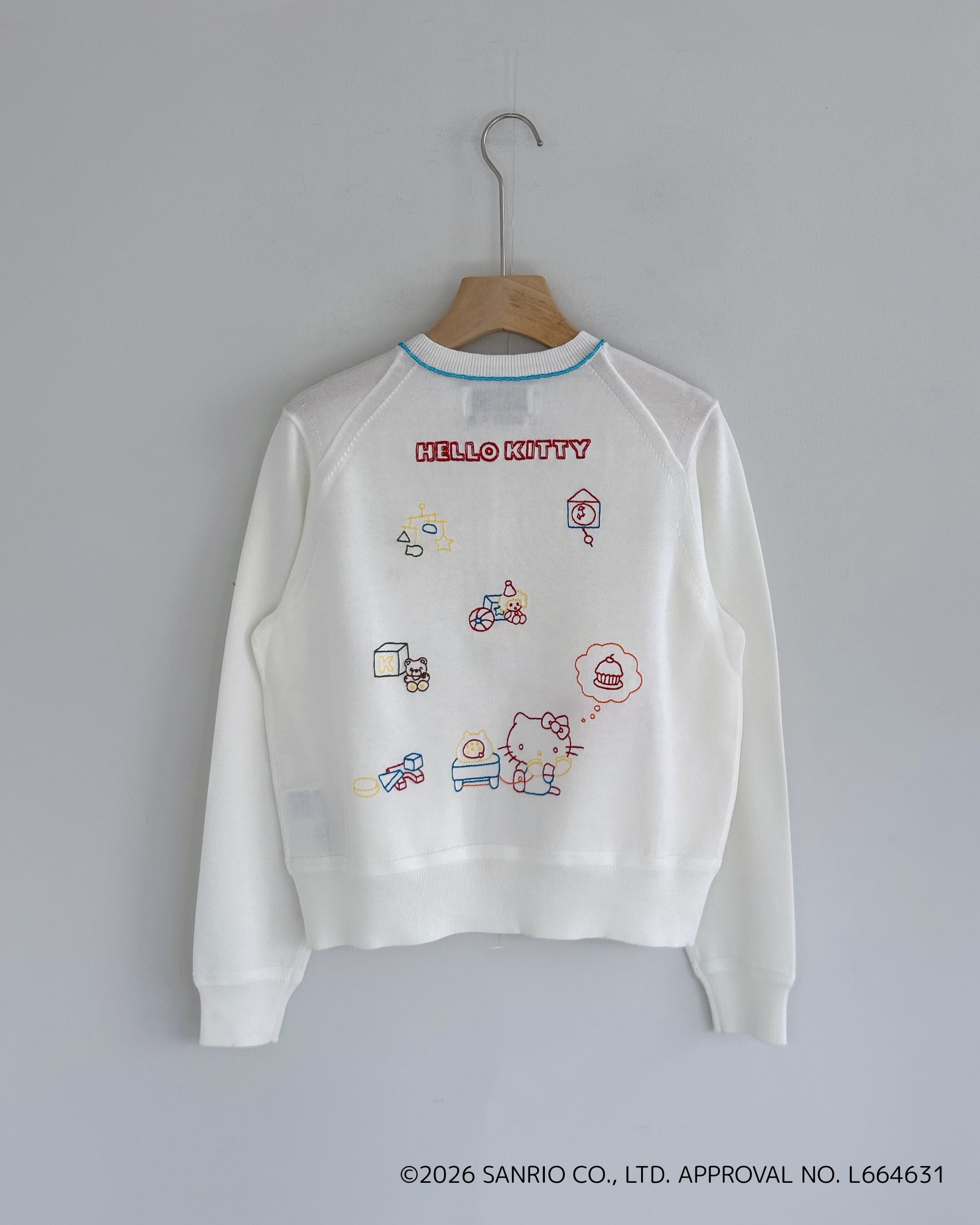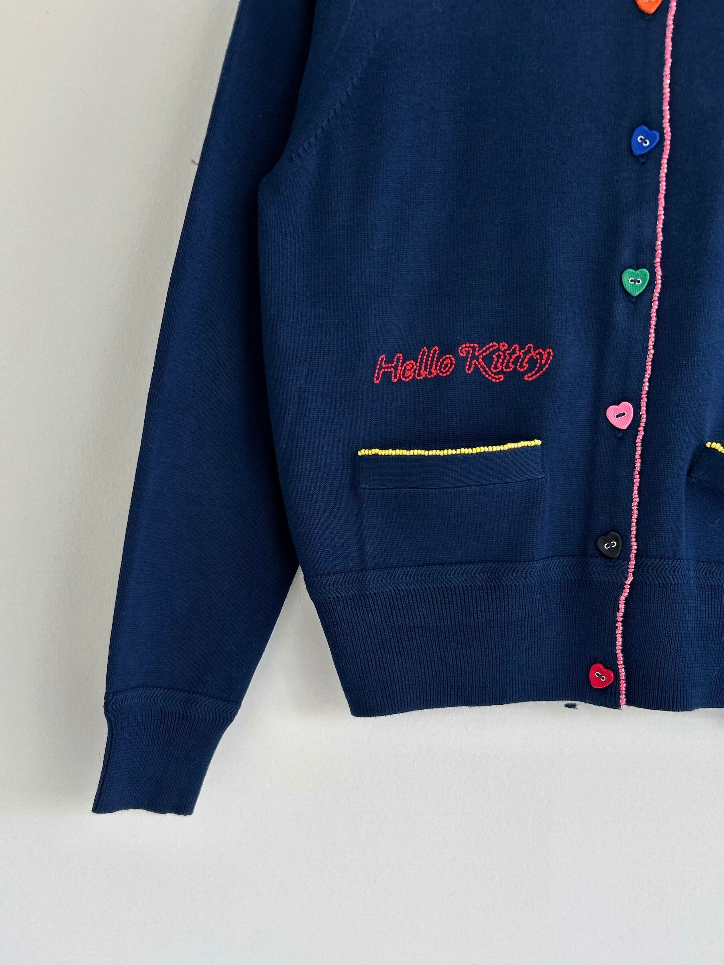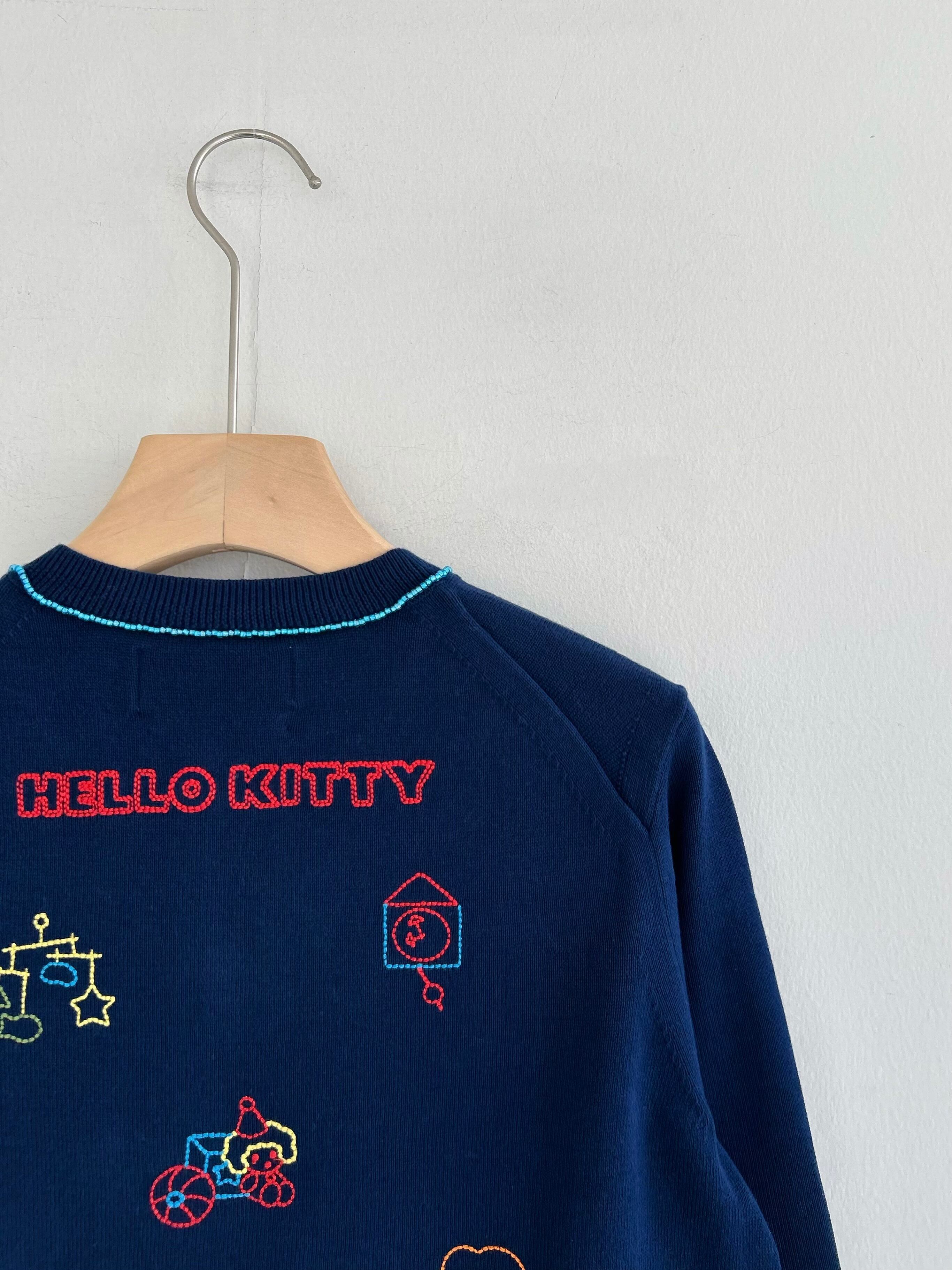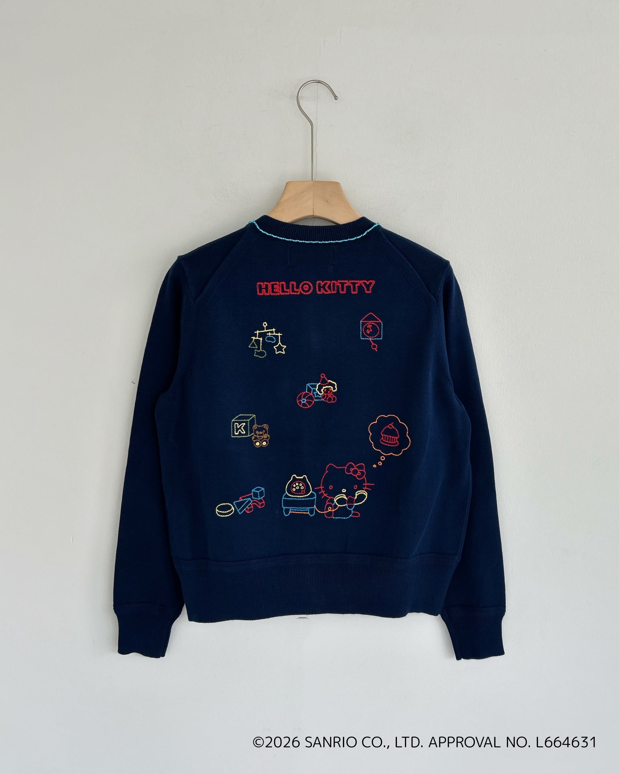 ハローキティの刺繍を贅沢に刺繍したUネックカーディガン。