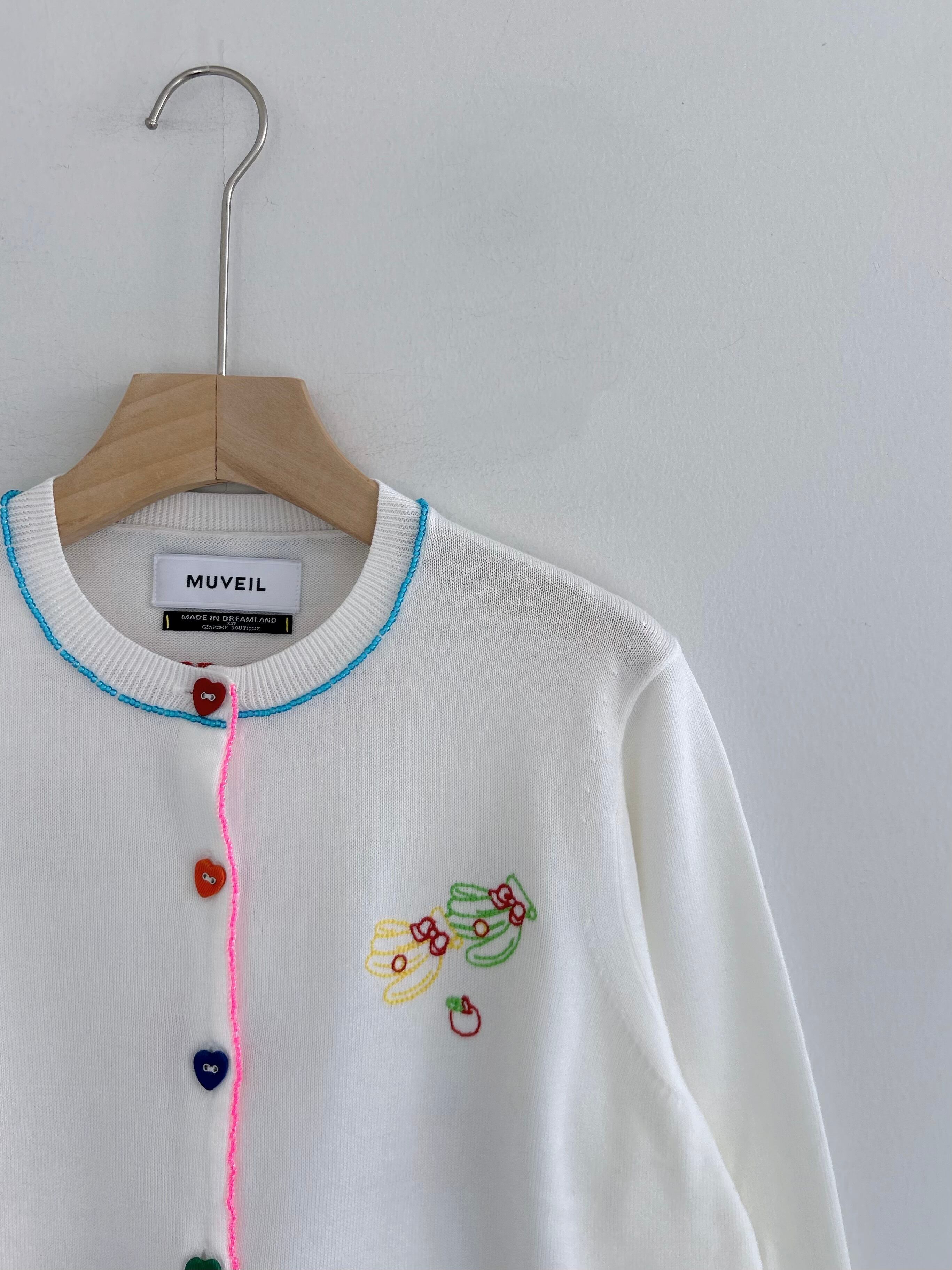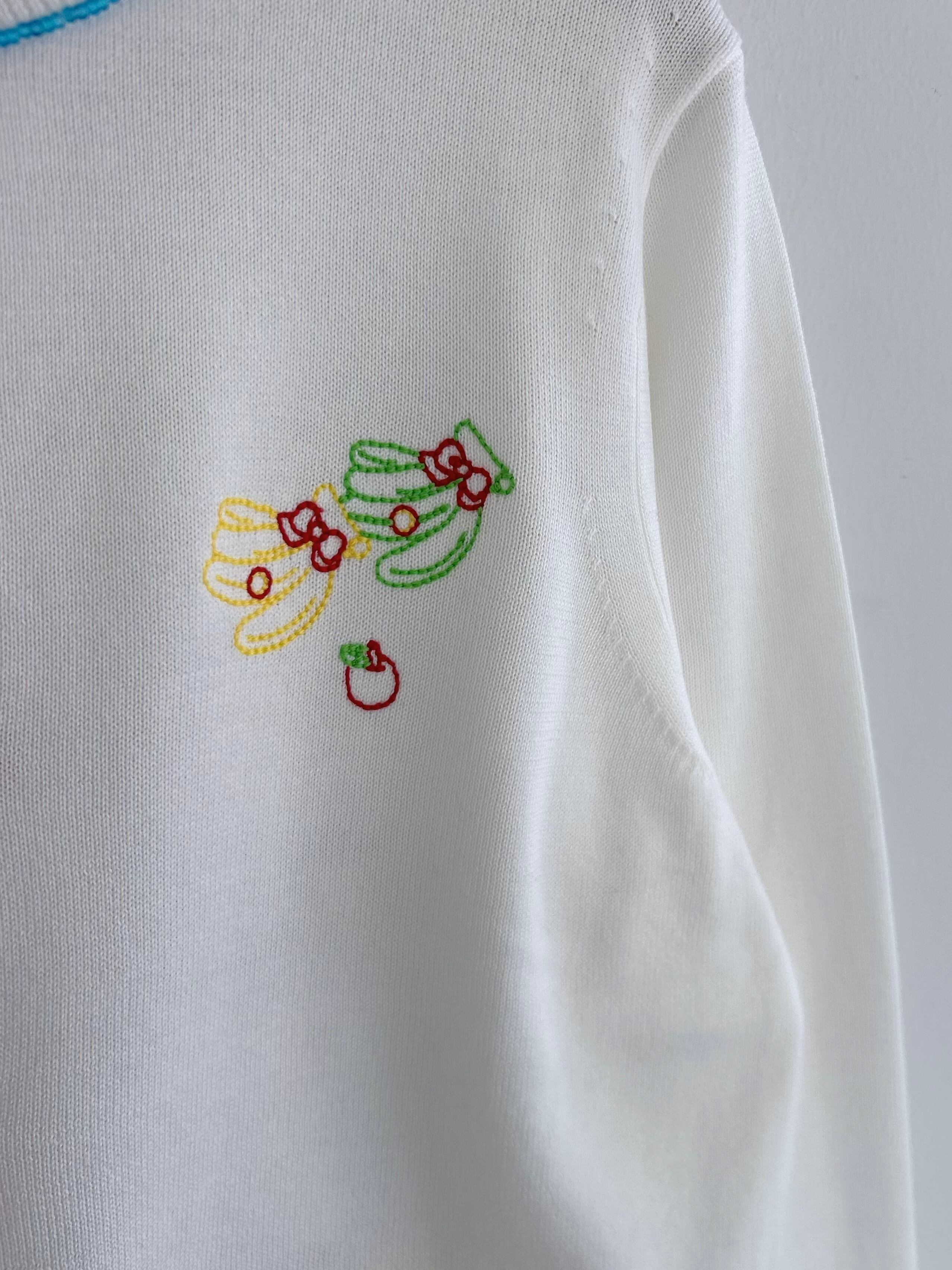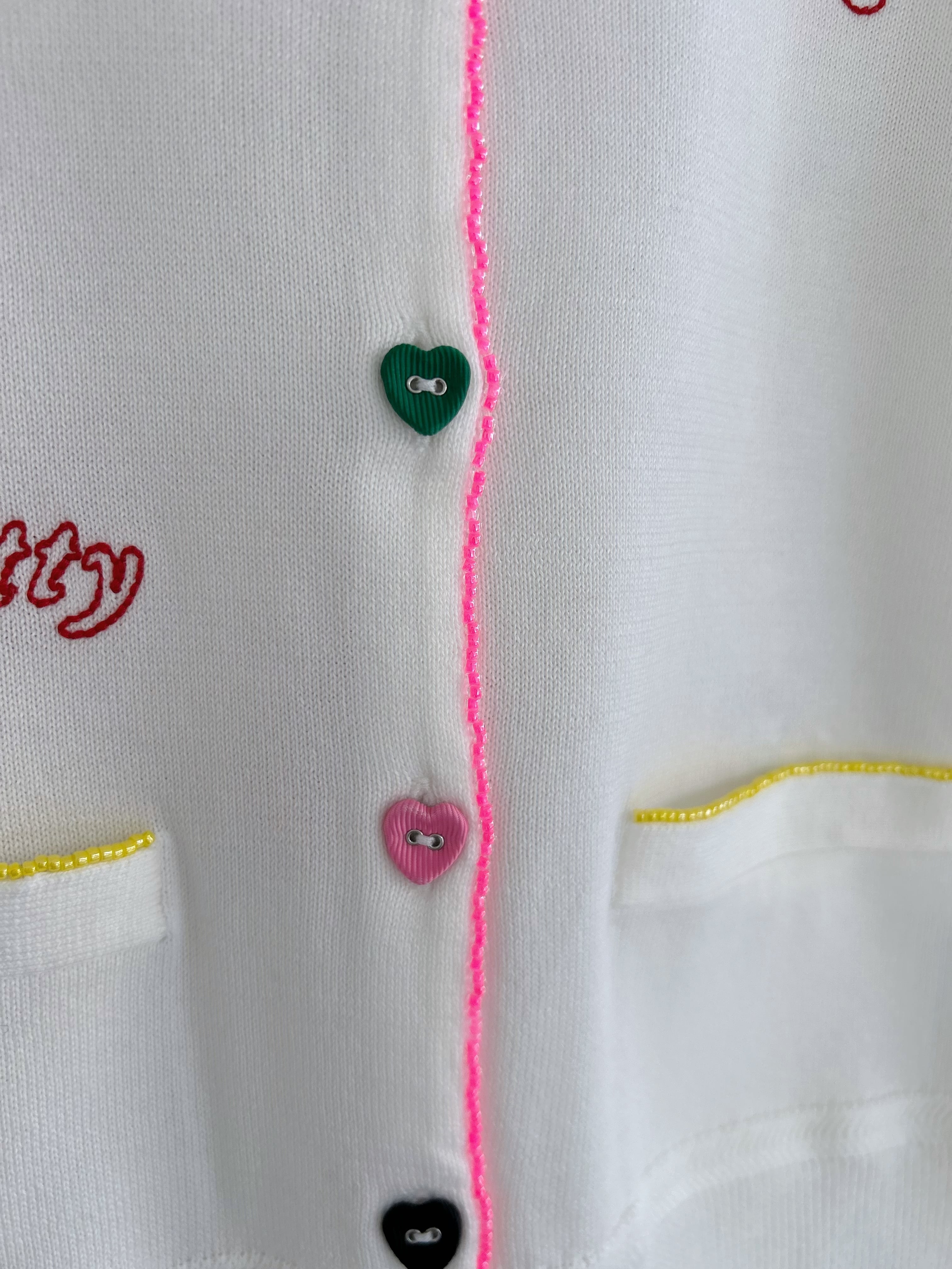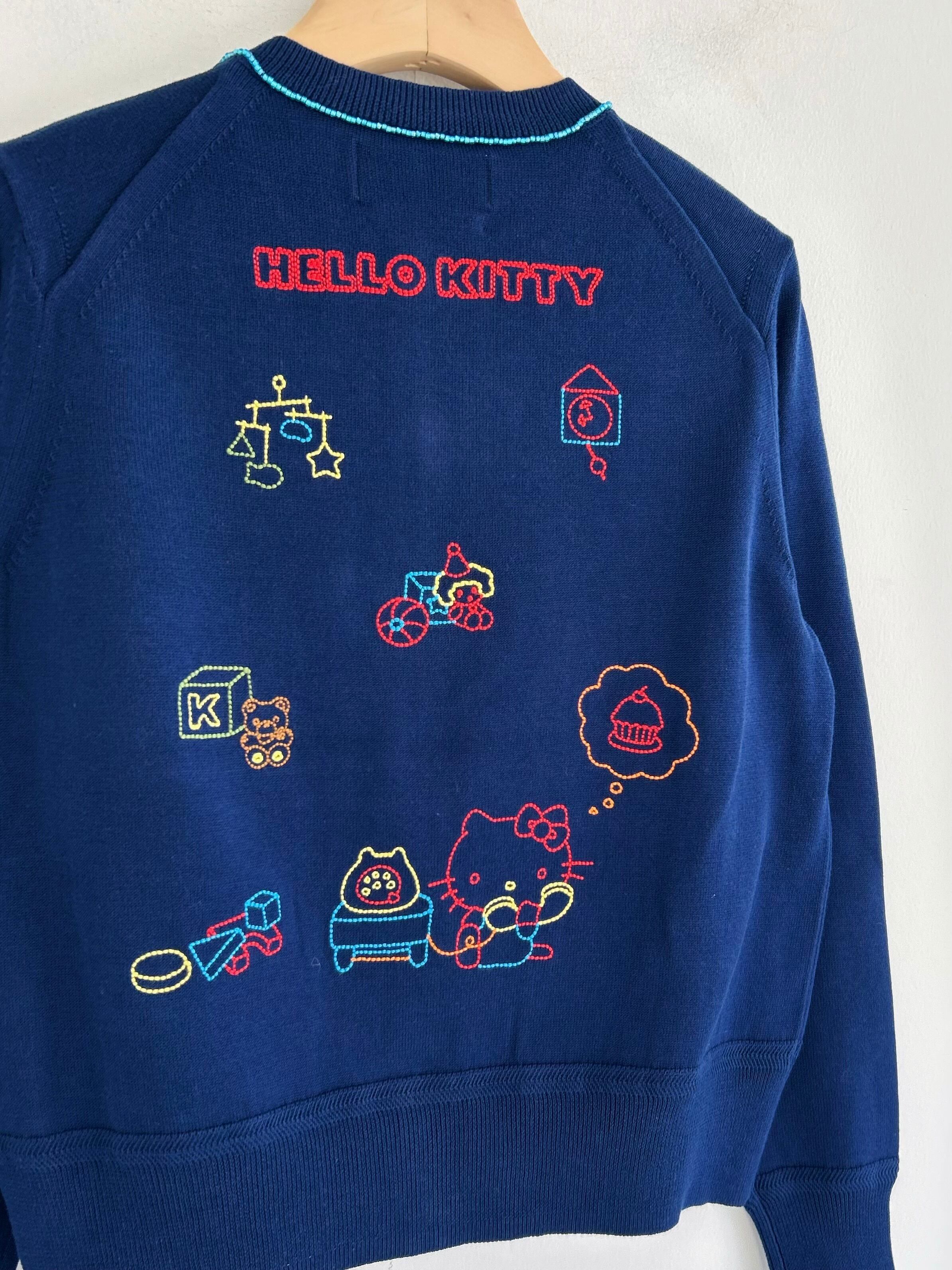 ハローキティの刺繍を贅沢に刺繍したUネックカーディガン。