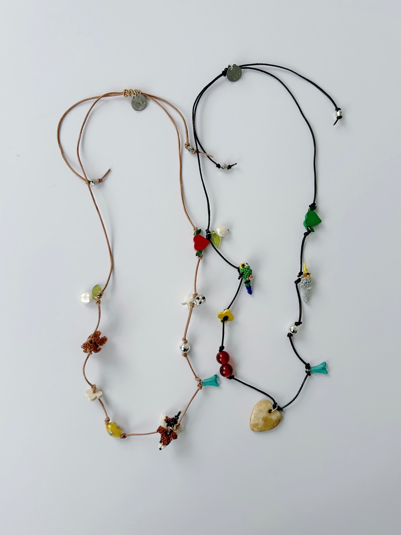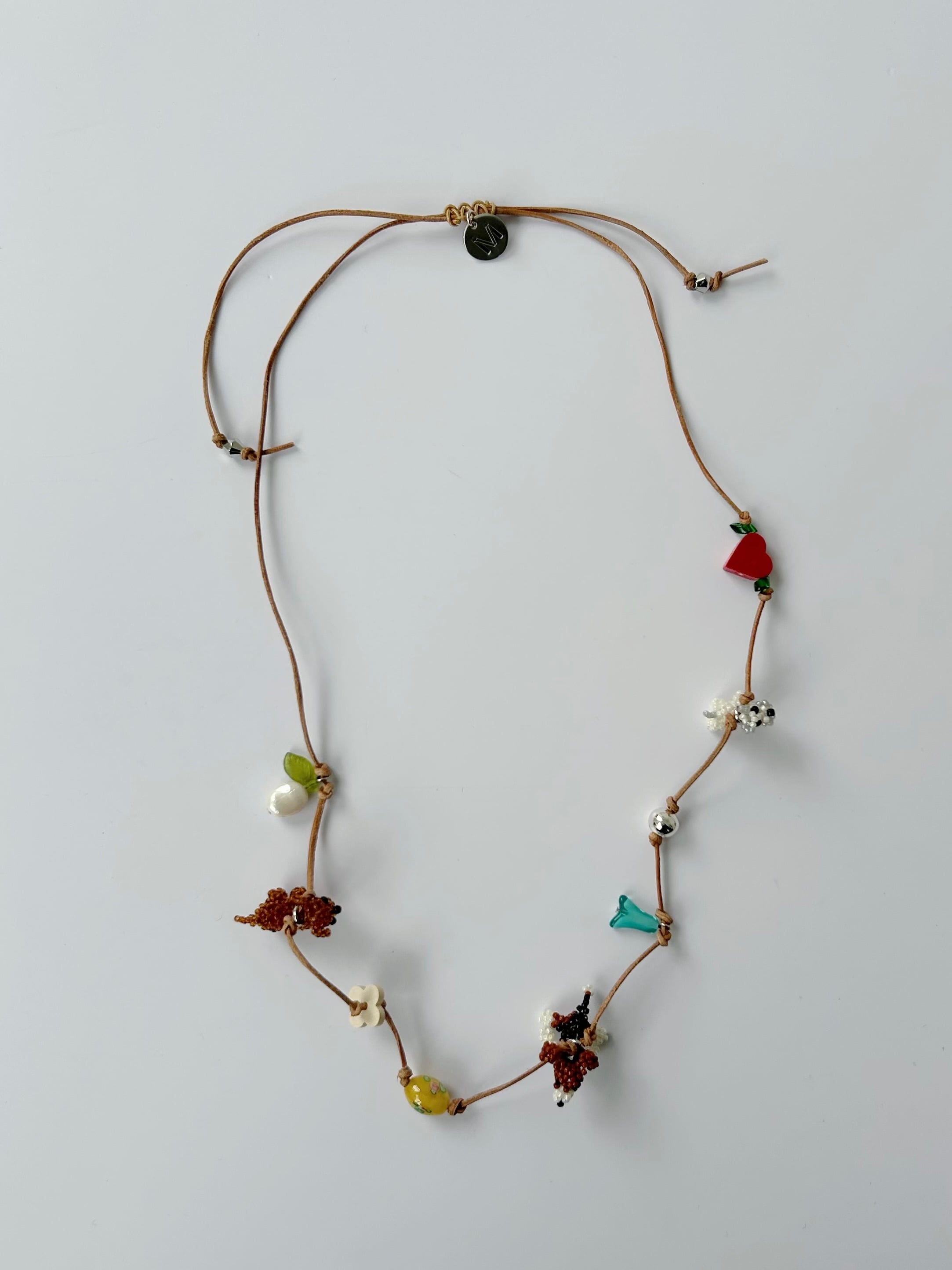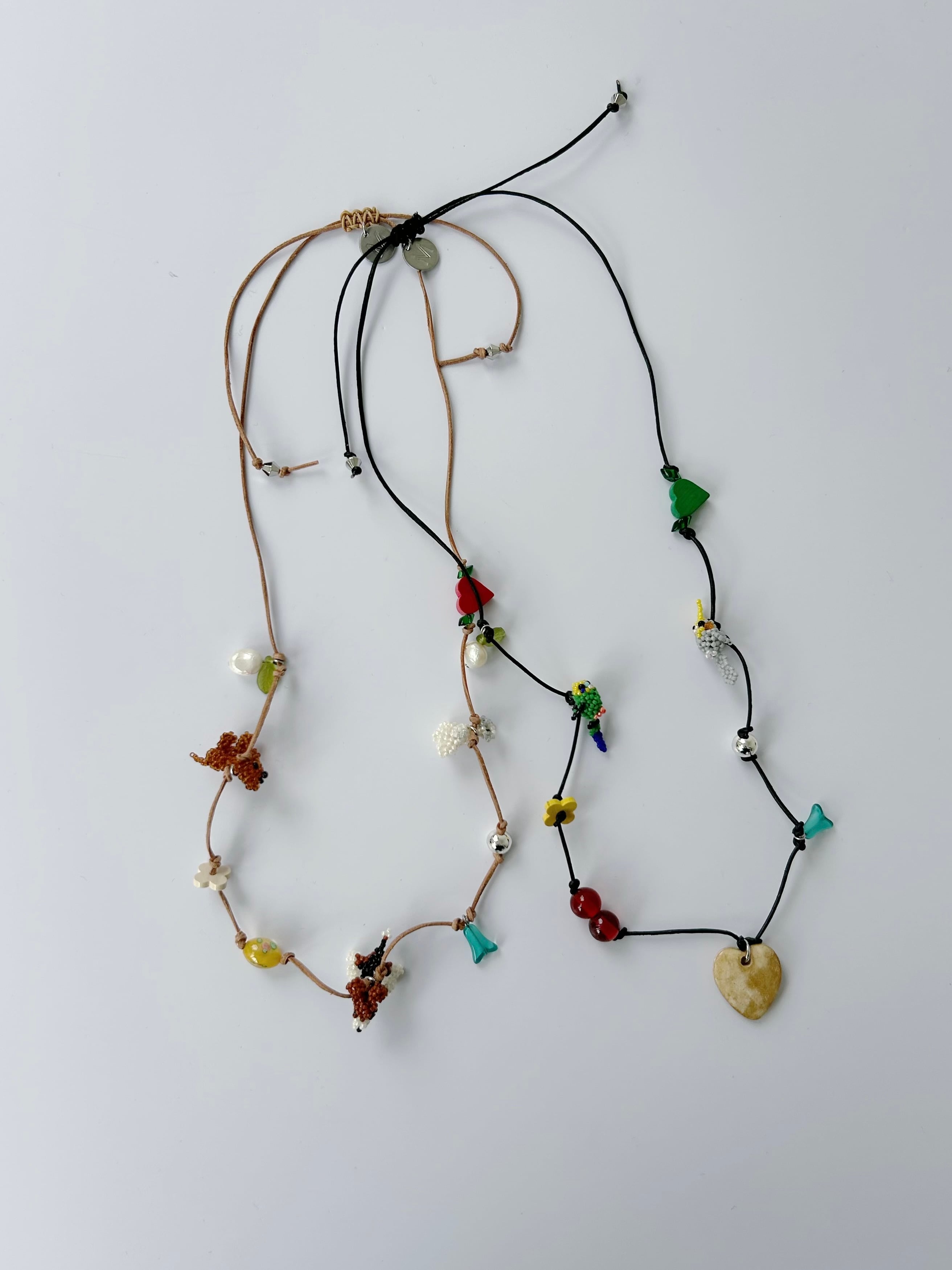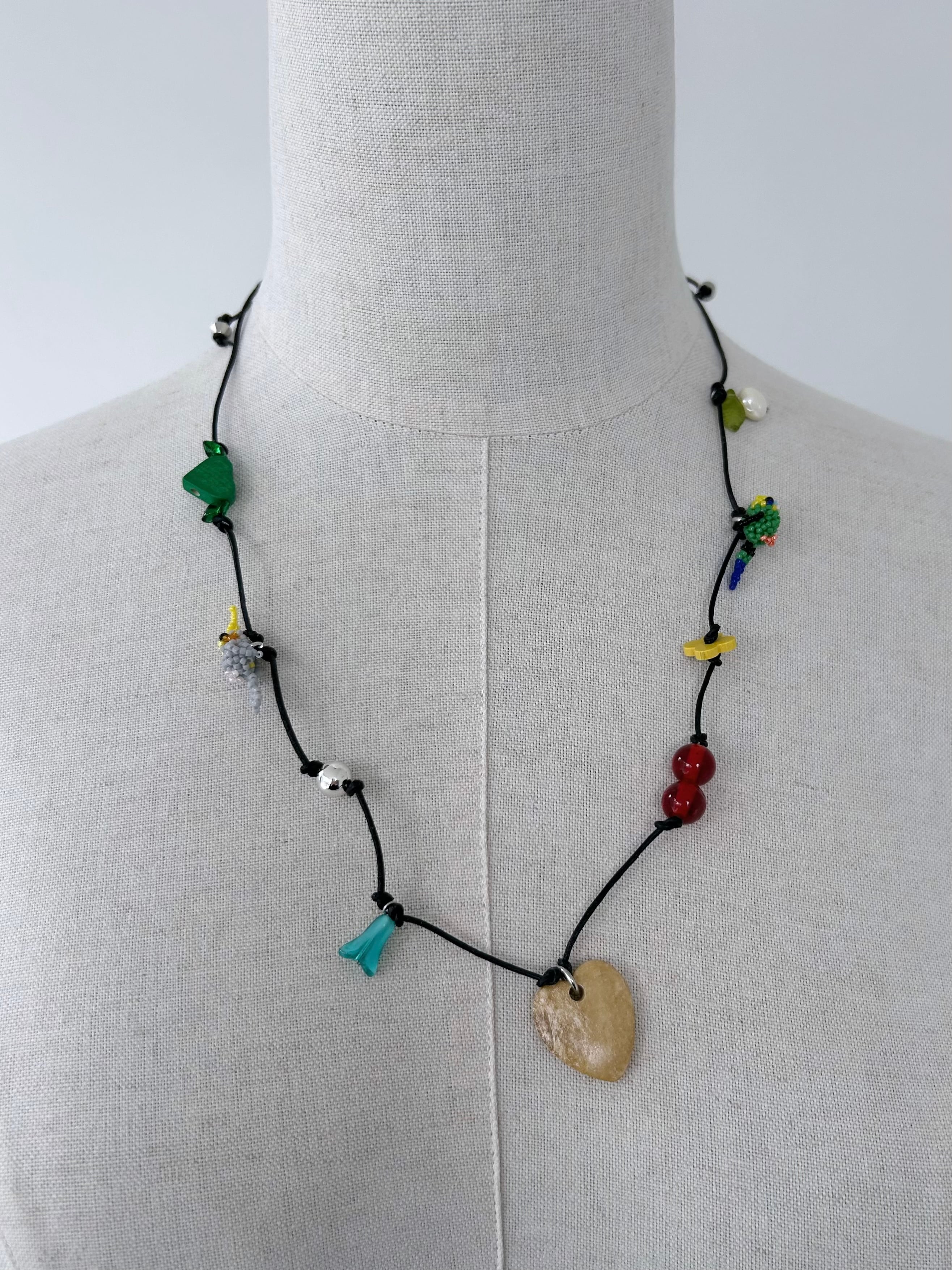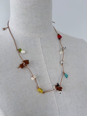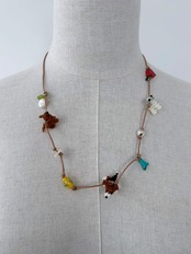 レザーコードにさまざまなチャームを施したネックレス。