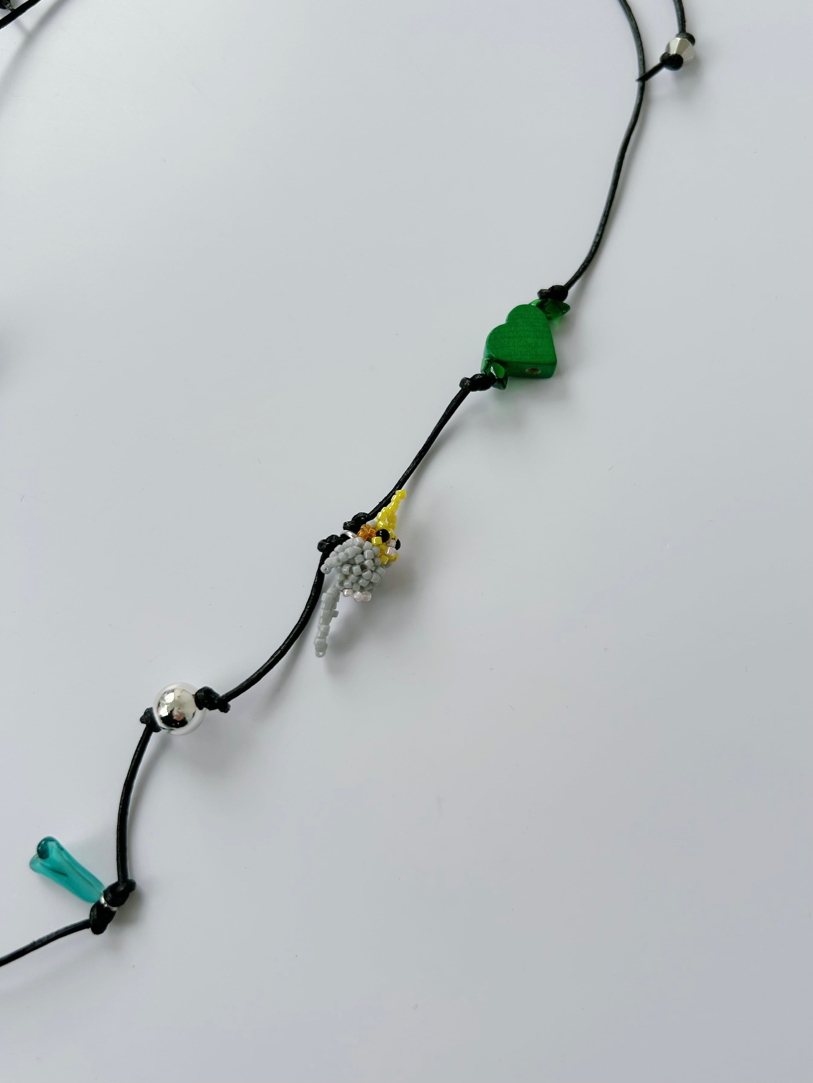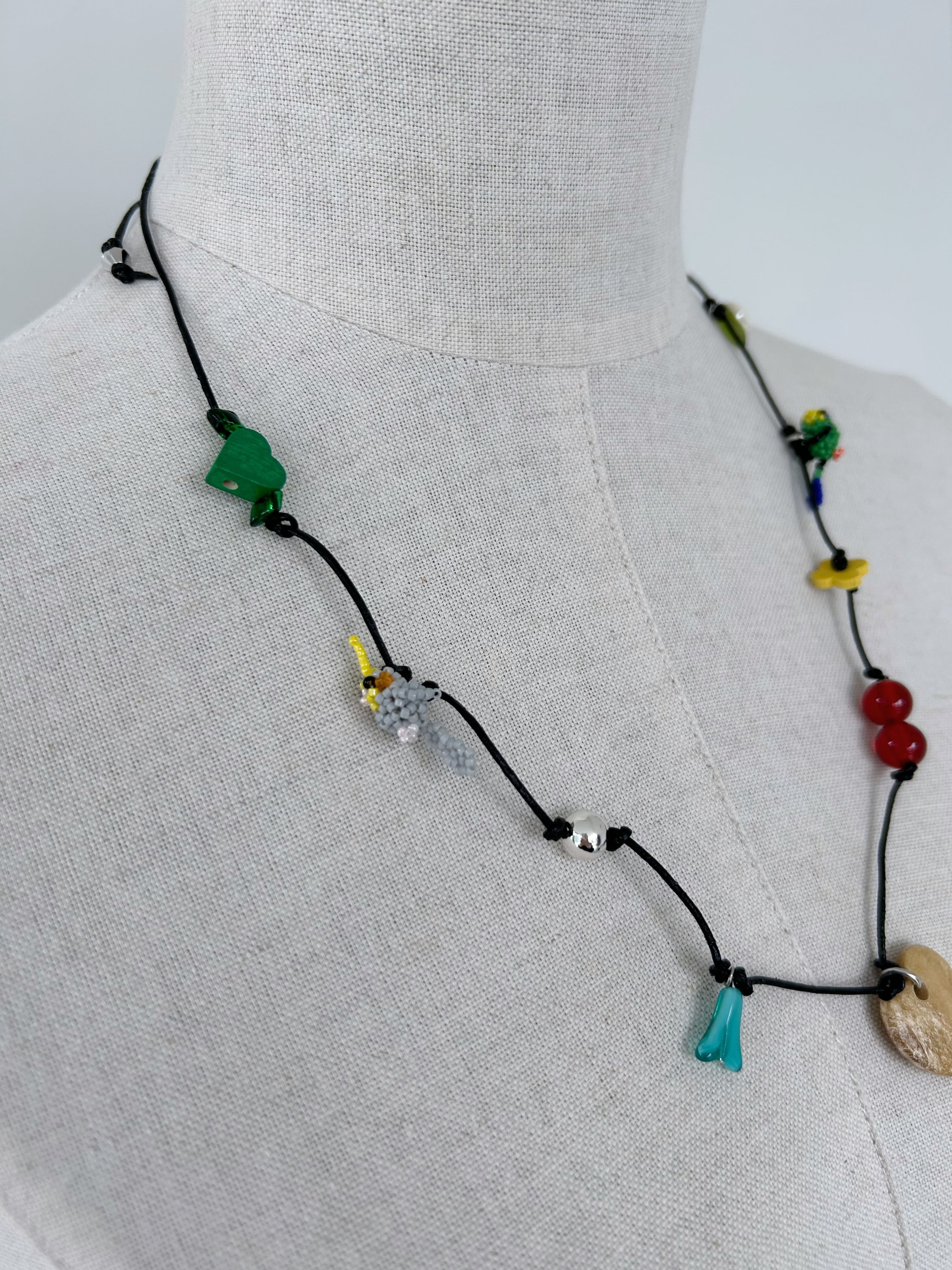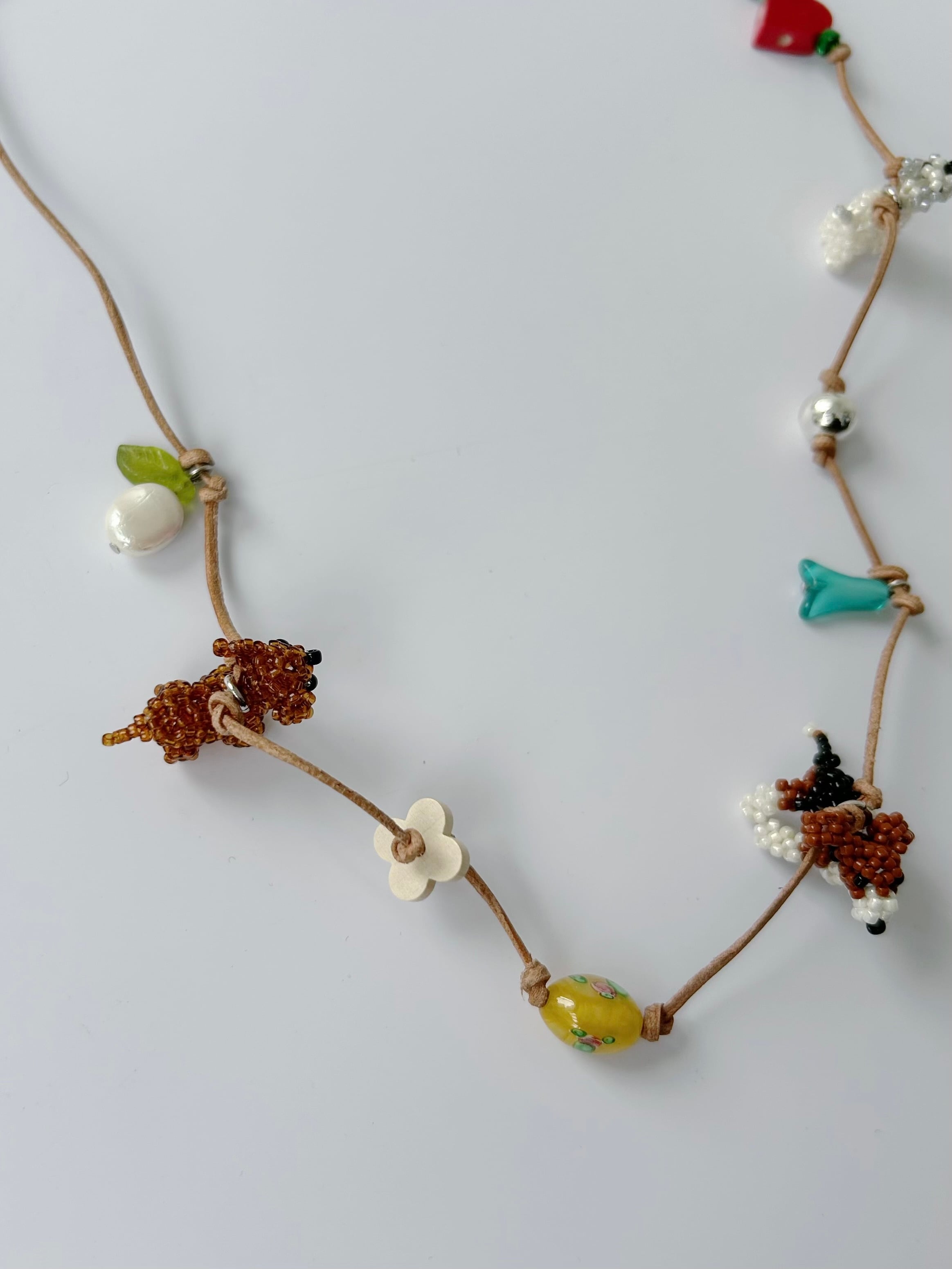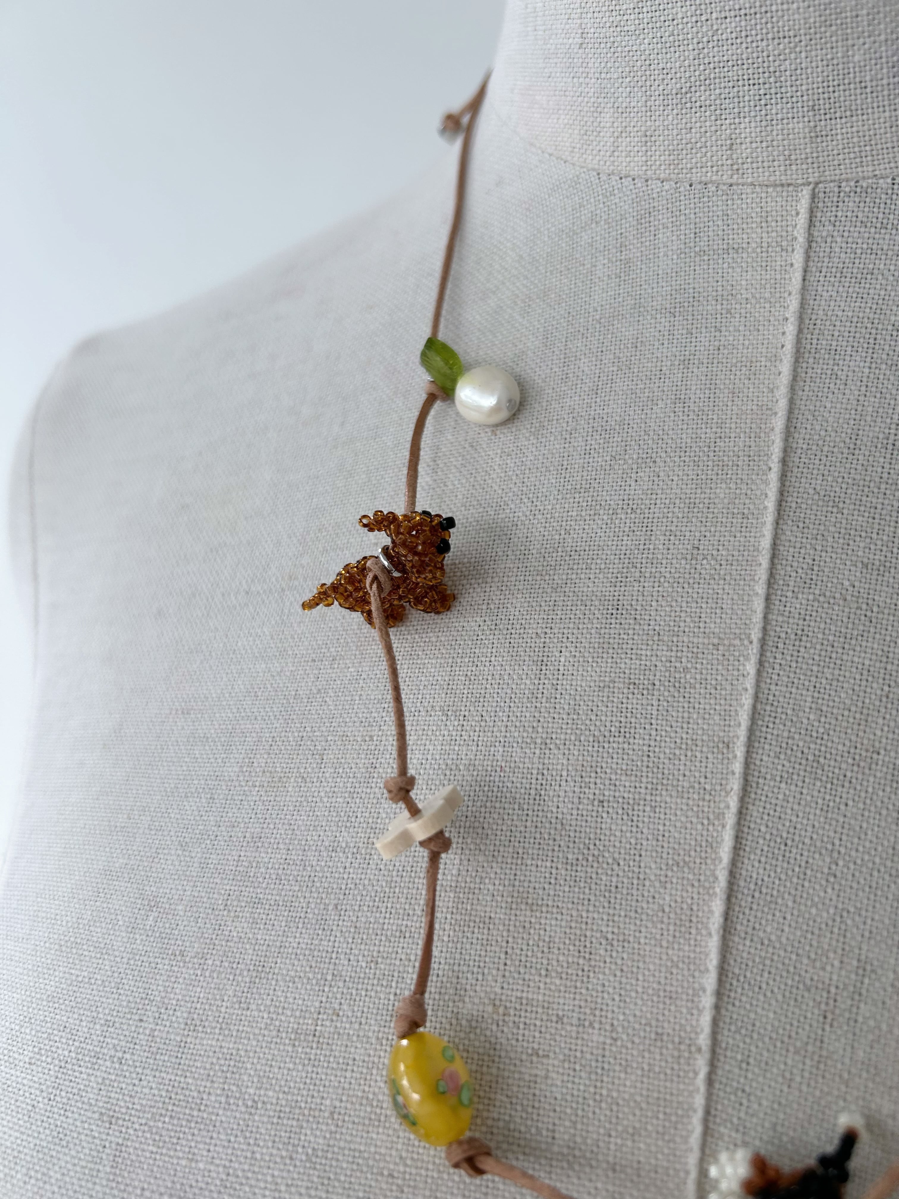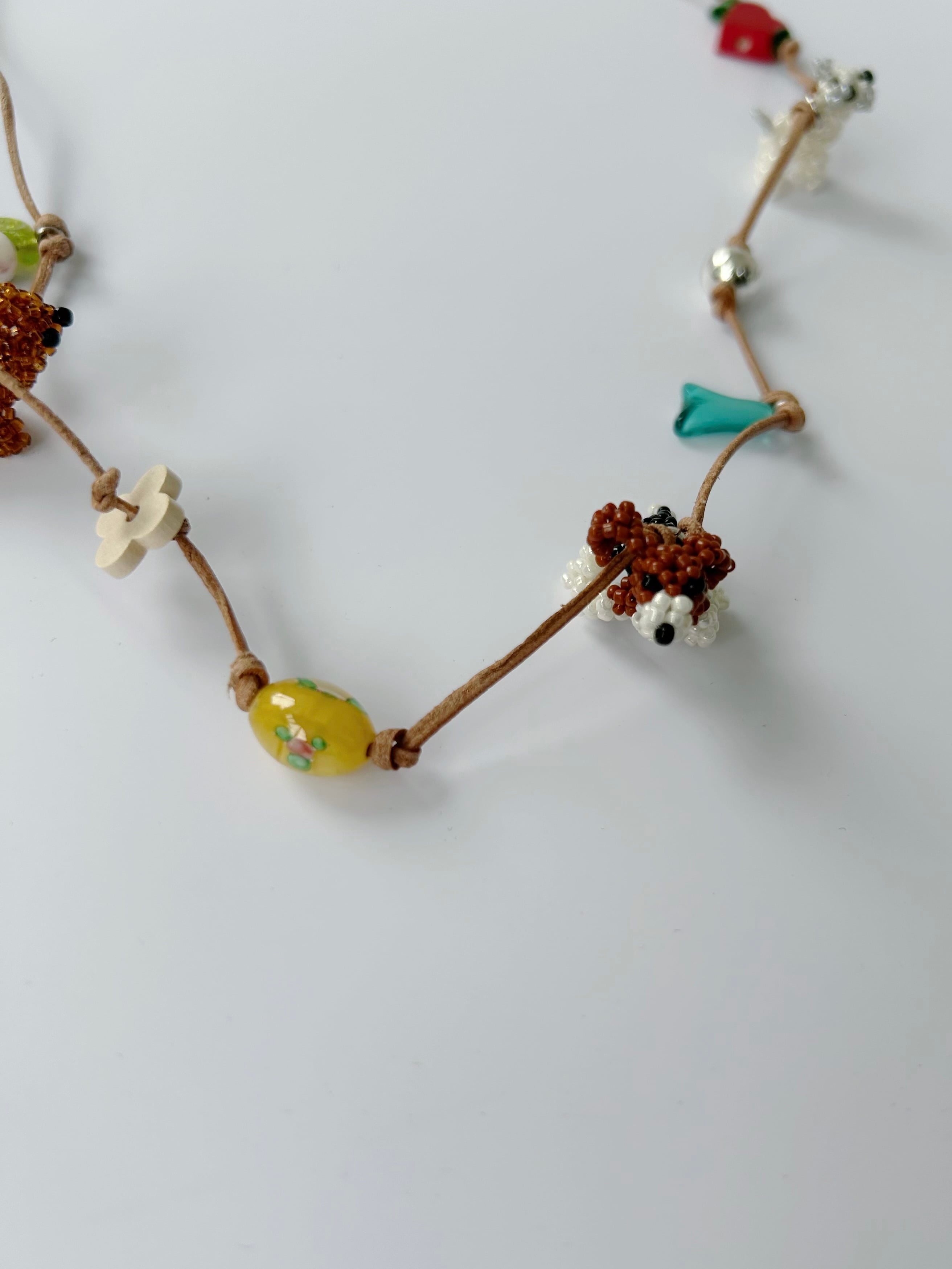 レザーコードにさまざまなチャームを施したネックレス。