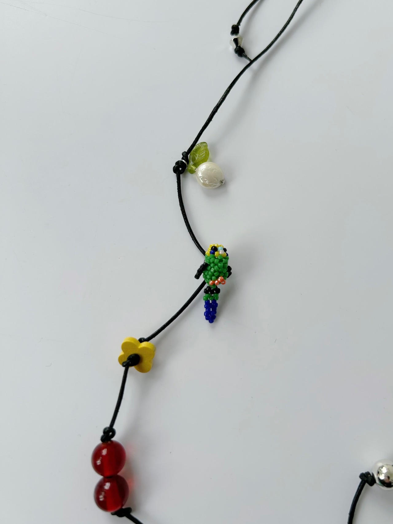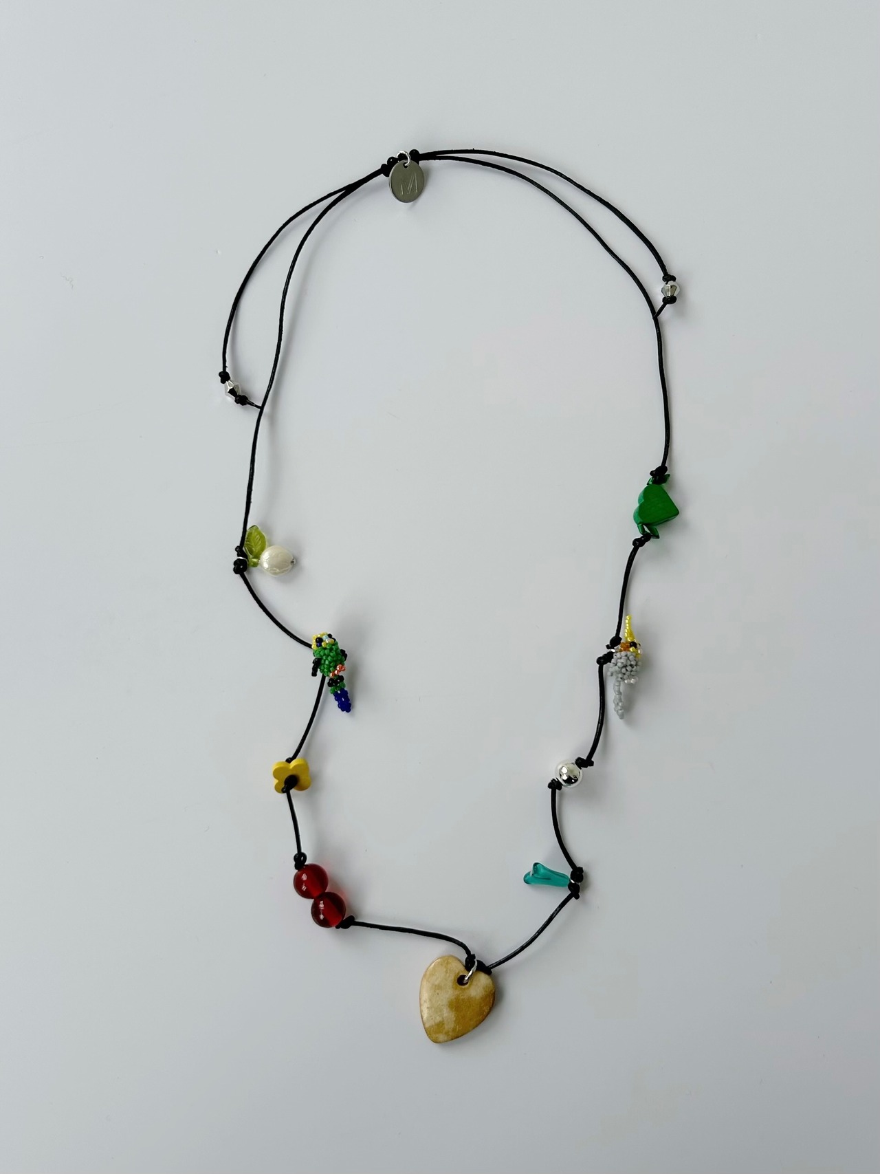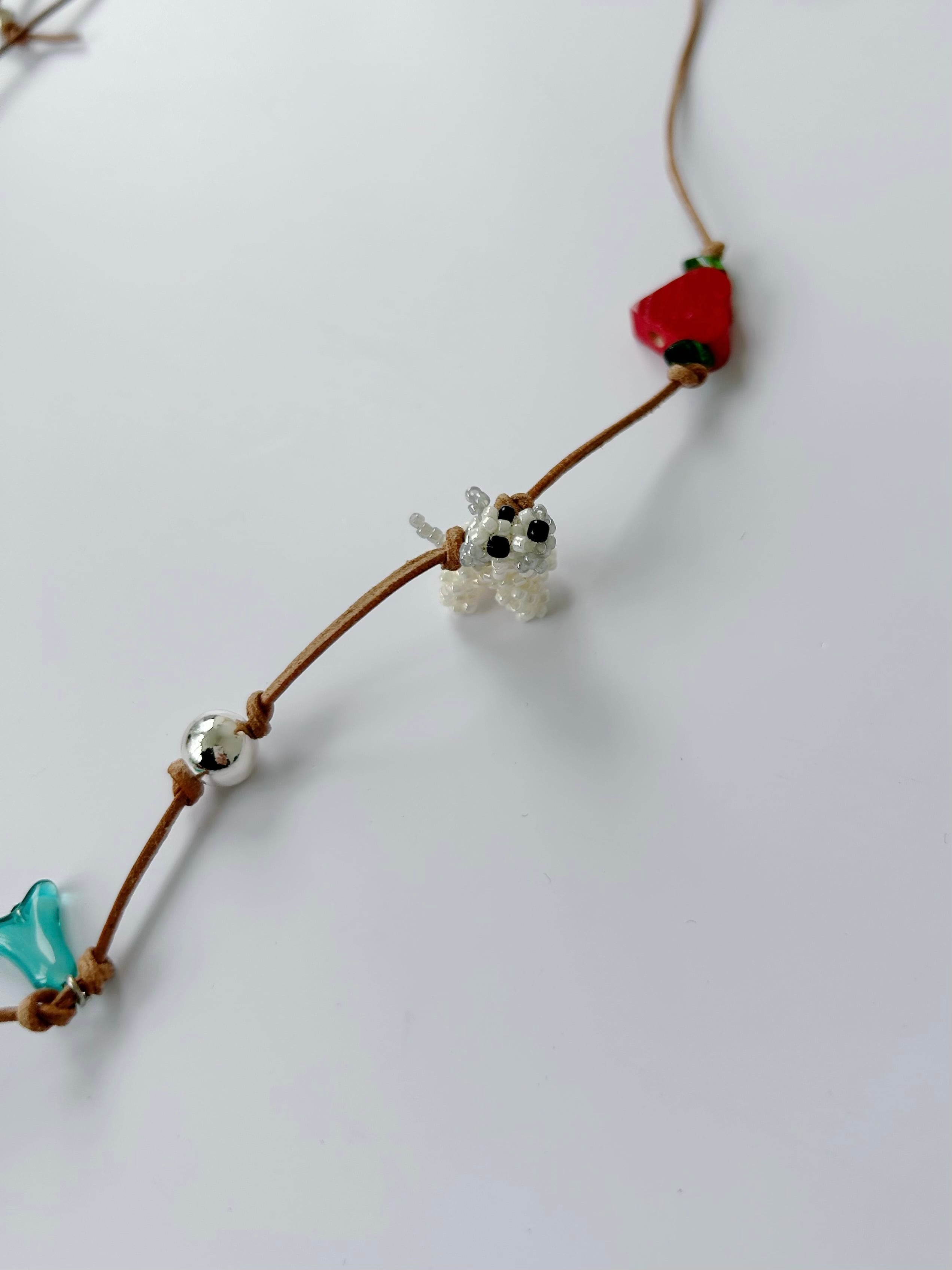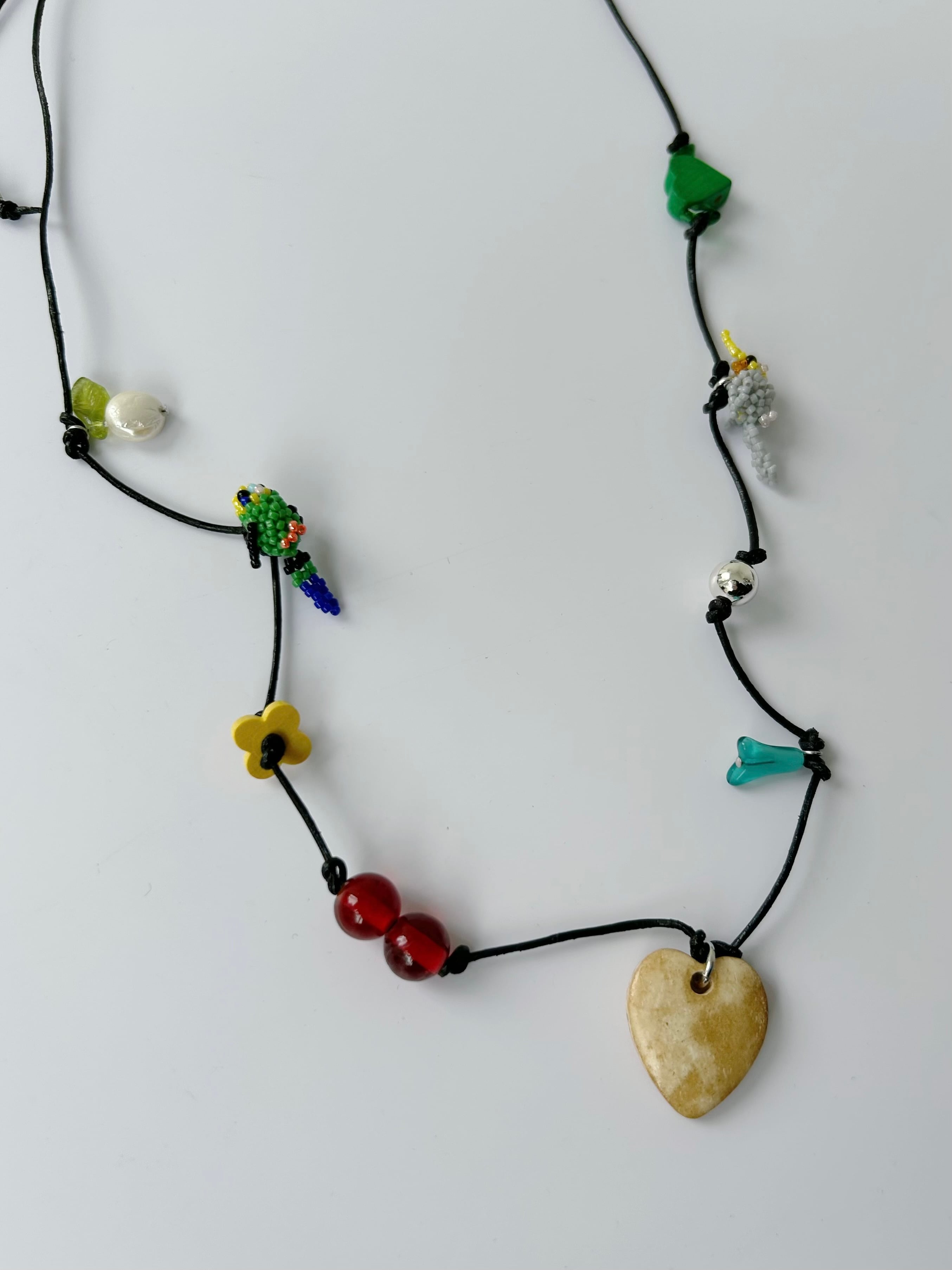 レザーコードにさまざまなチャームを施したネックレス。