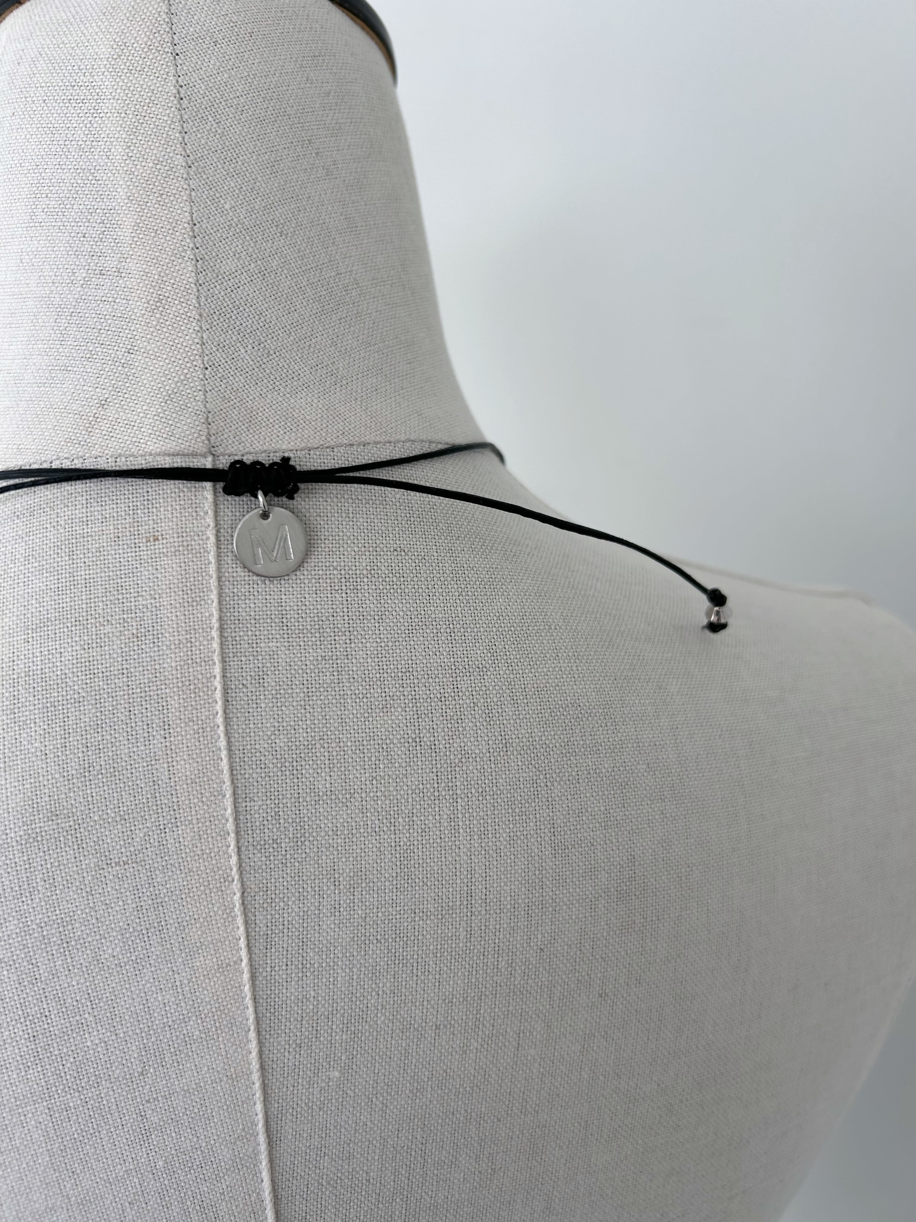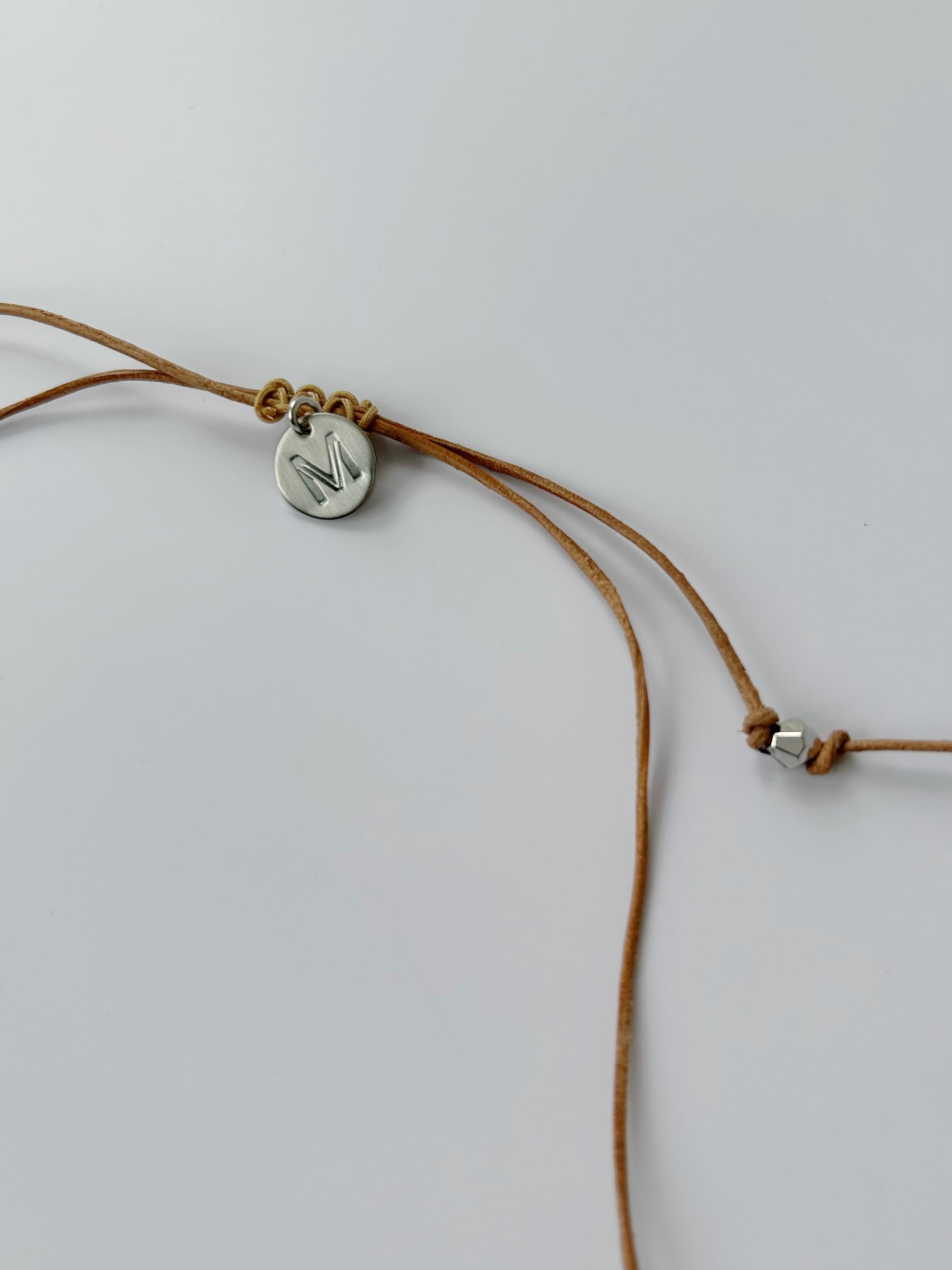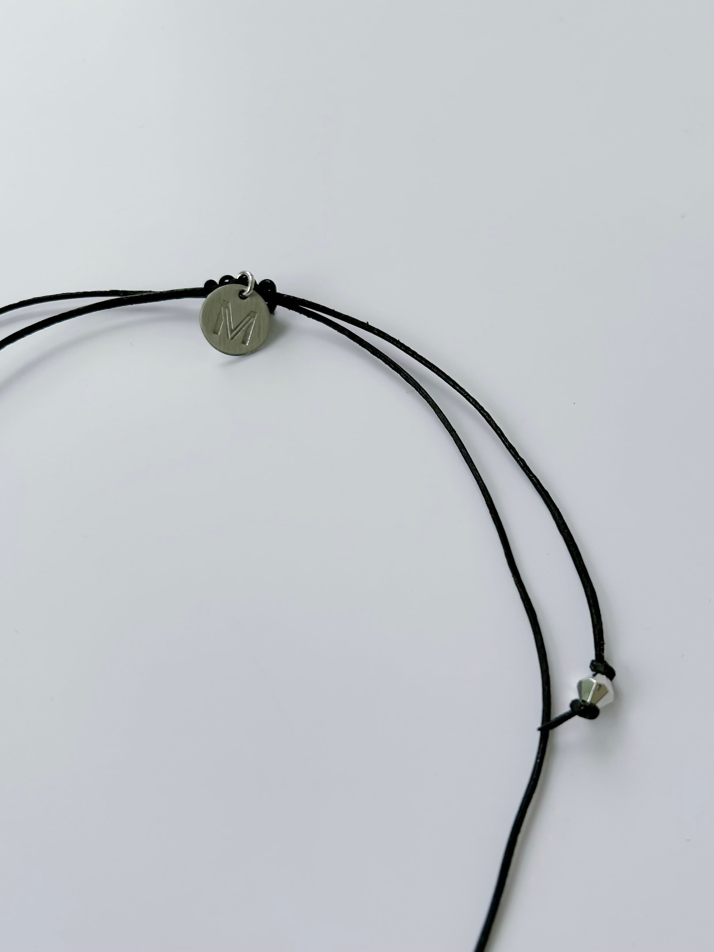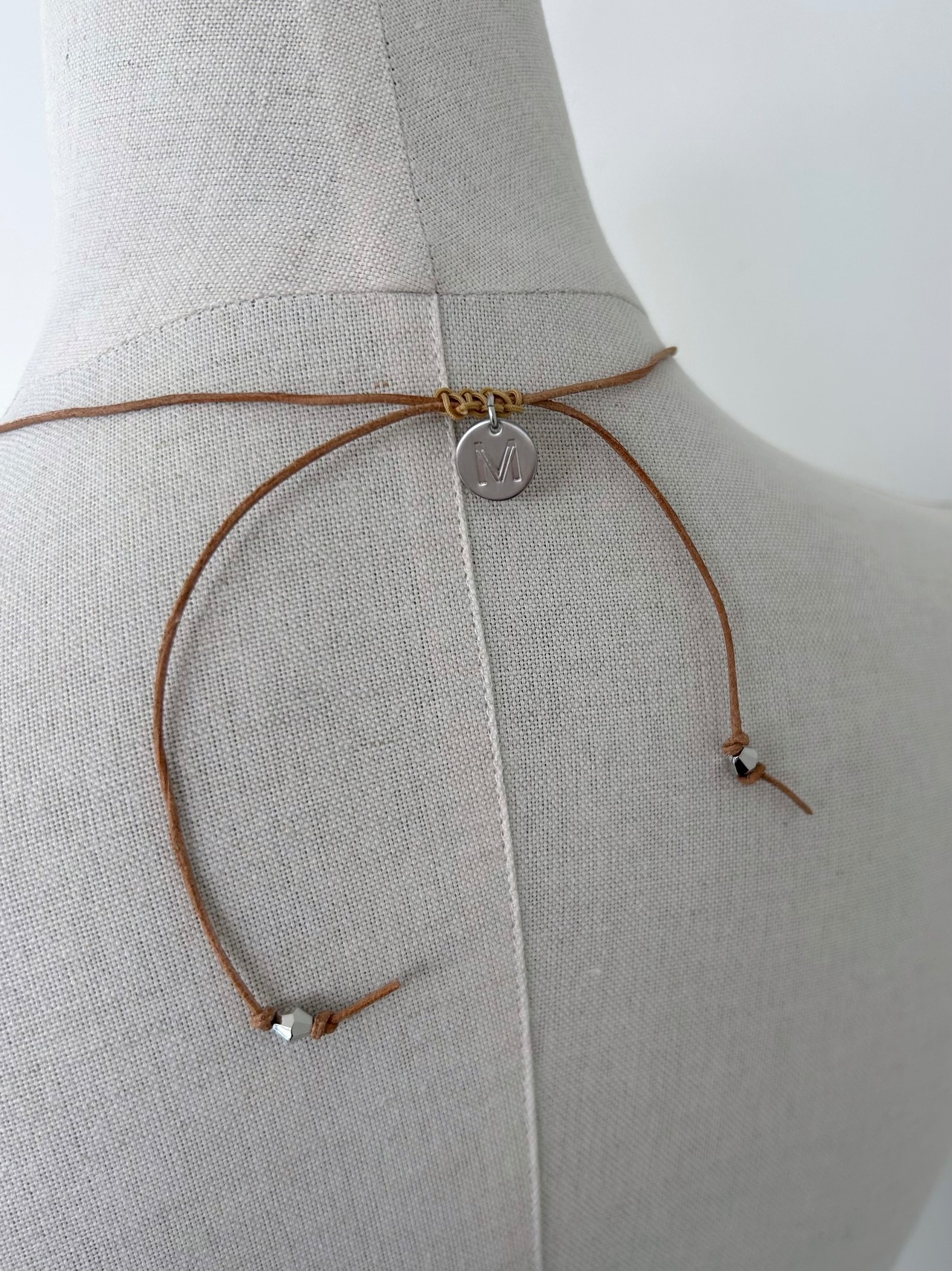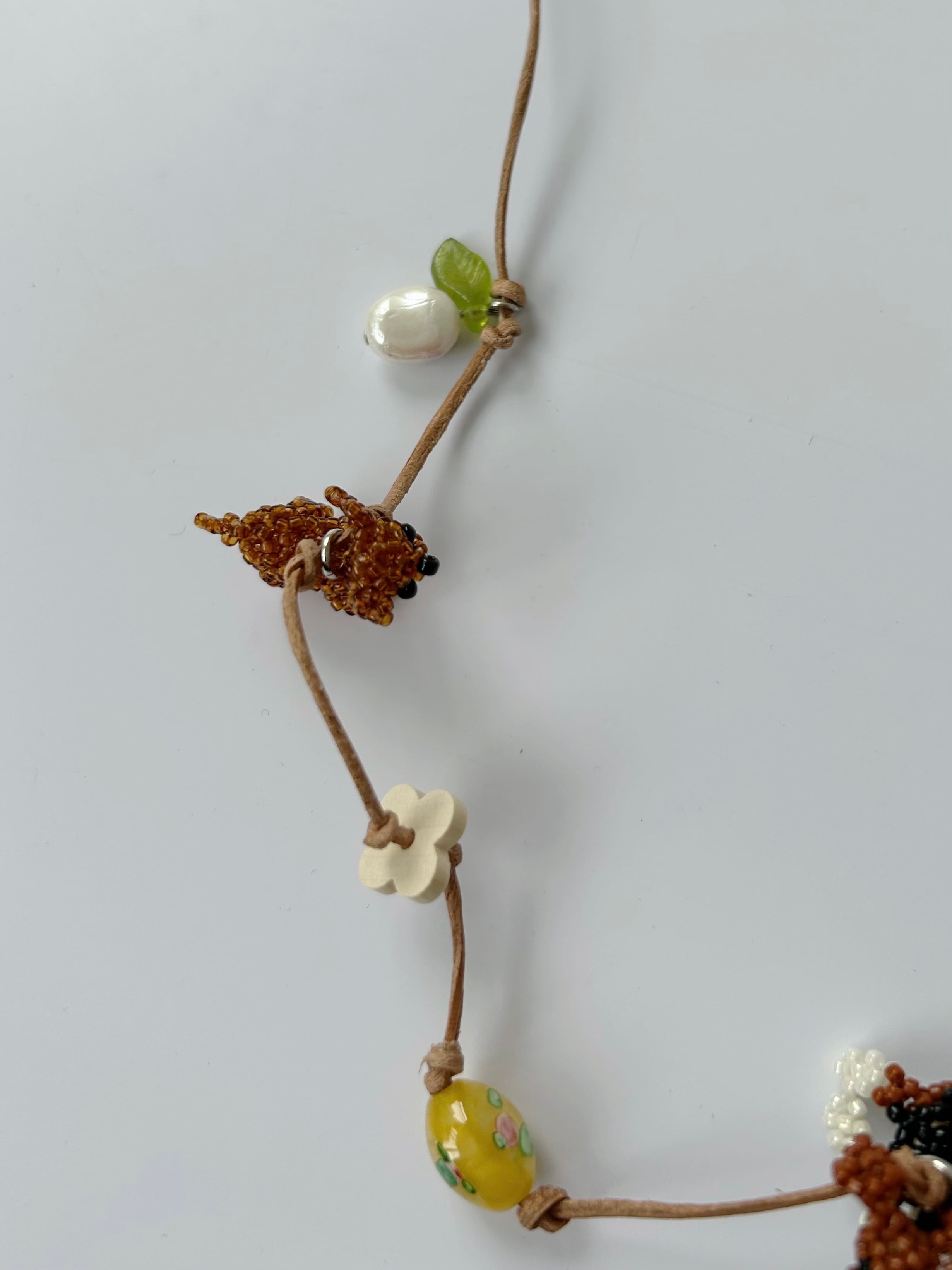 レザーコードにさまざまなチャームを施したネックレス。
