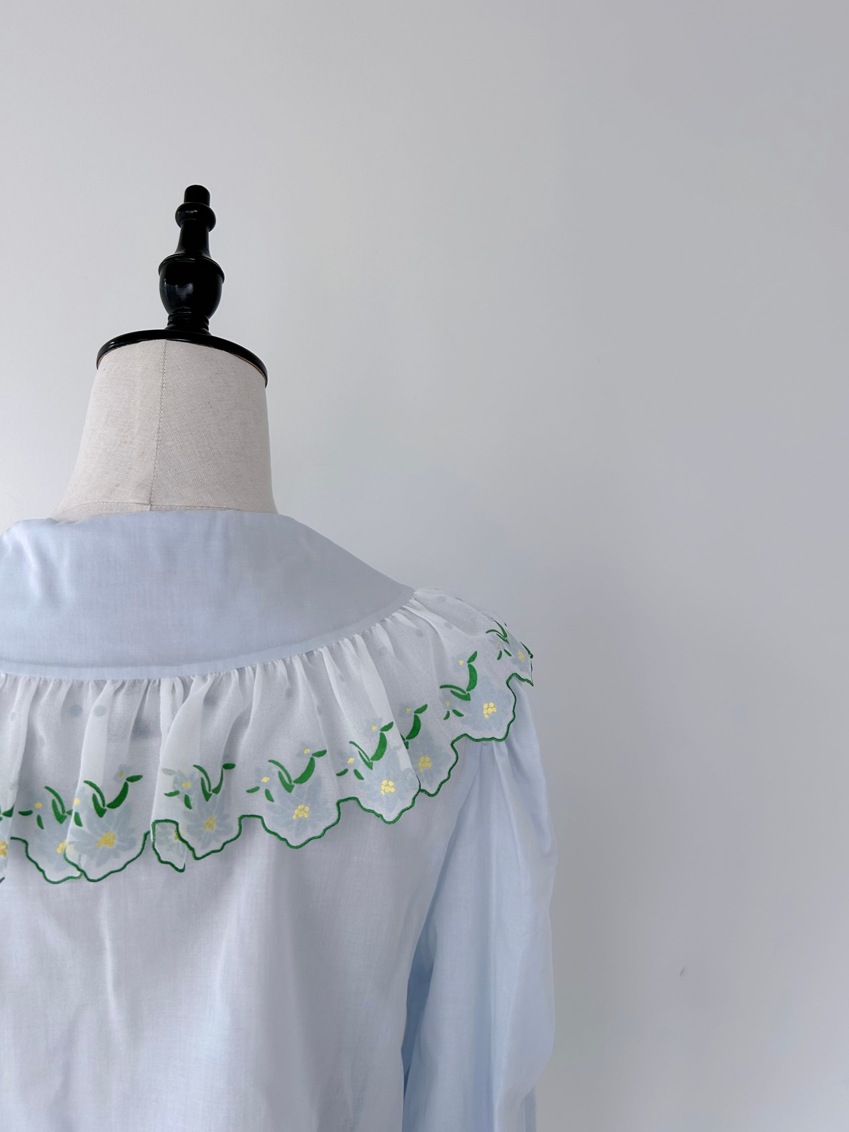 首元と袖口のフリルは、柔らかな立体感を生み、顔まわりや手元に上品なニュアンスを添えます。
