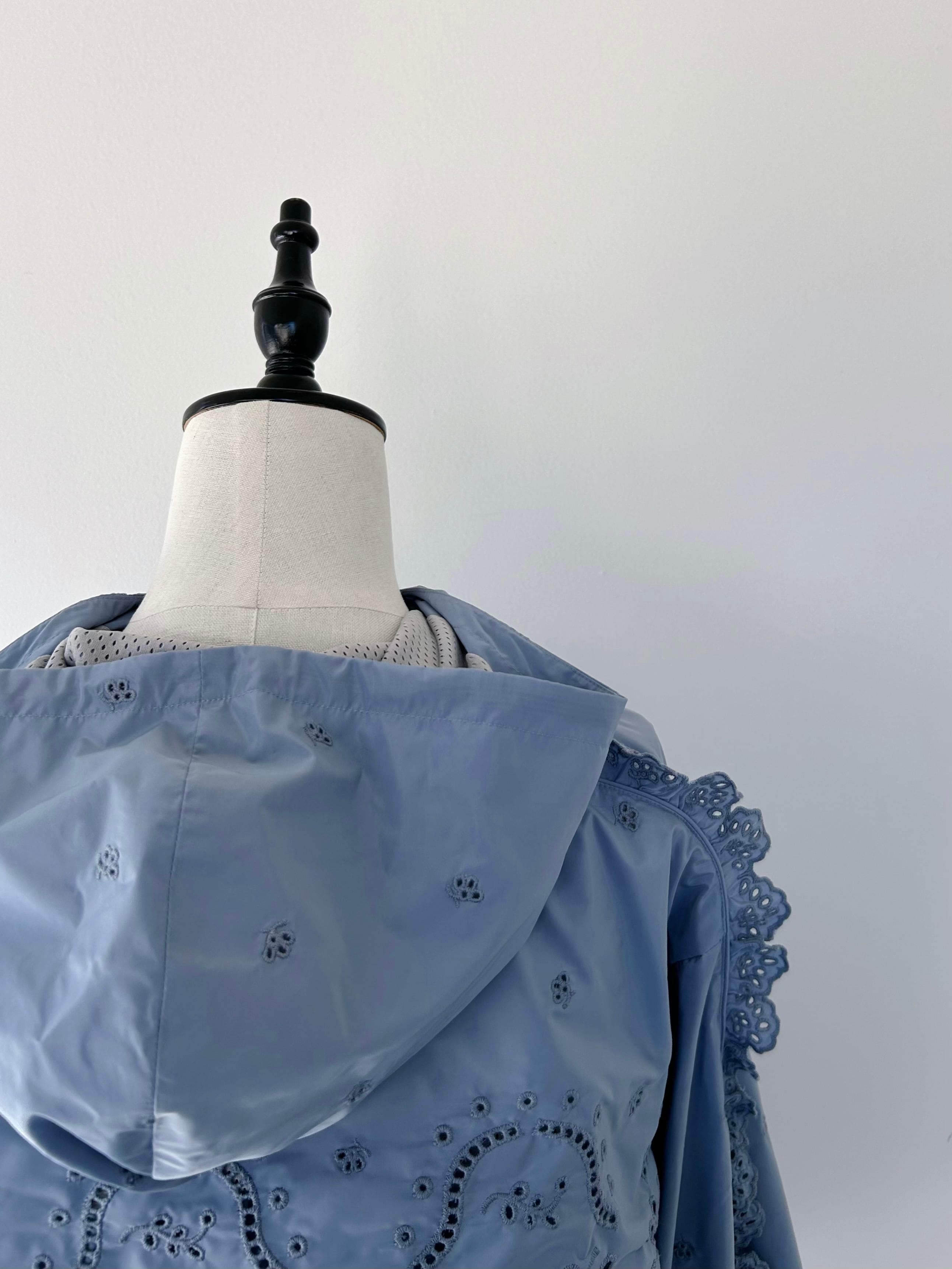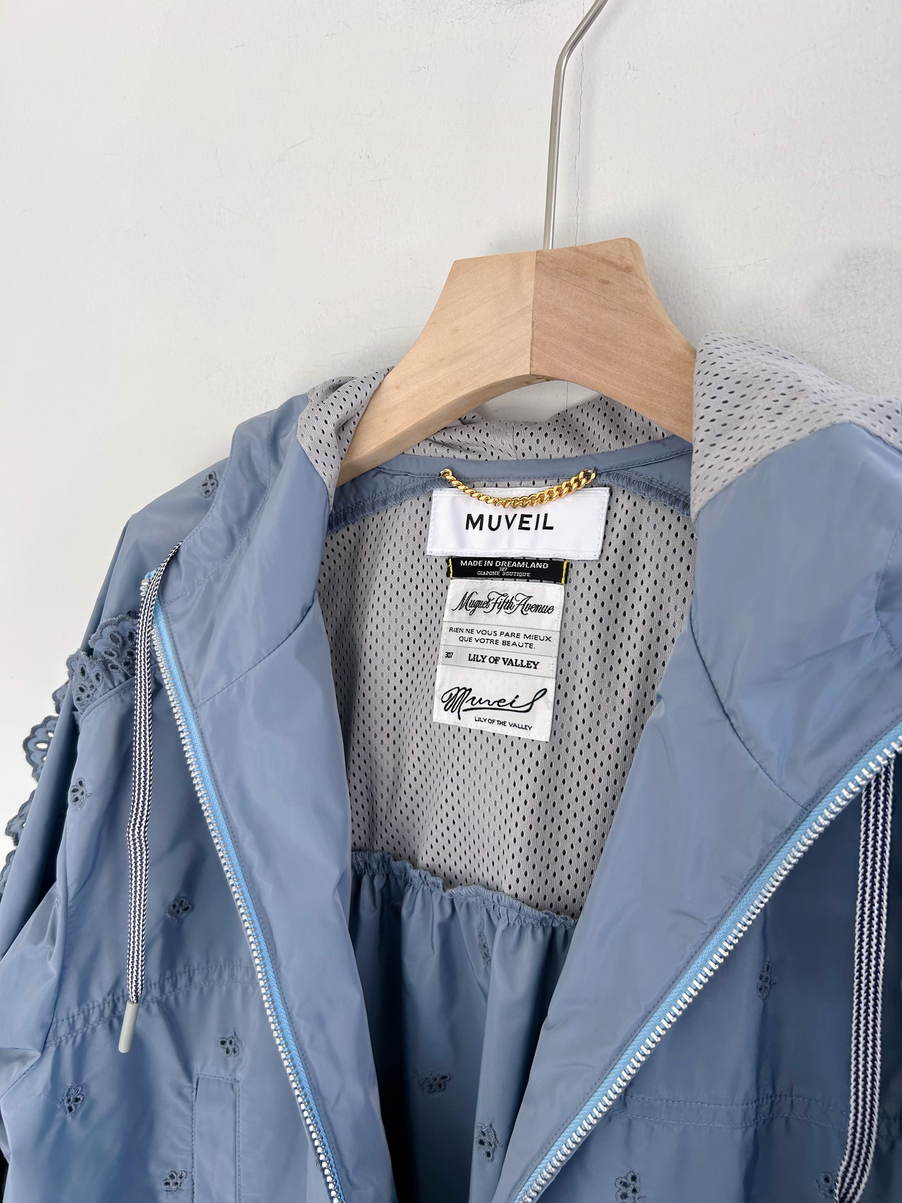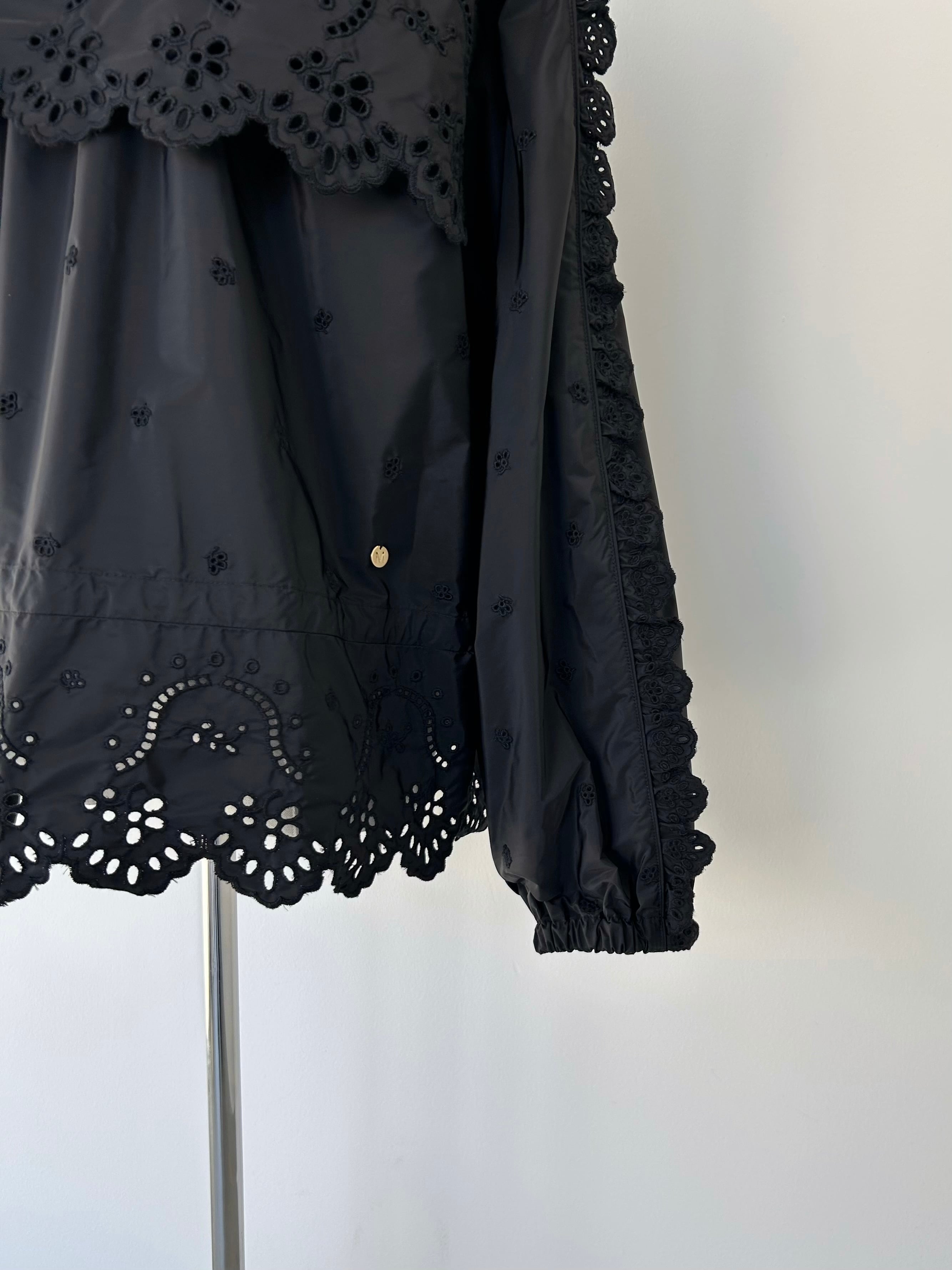 スポーツライクな生地にオリジナルのカットワークレースを施した生地を使用したジップブルゾン。