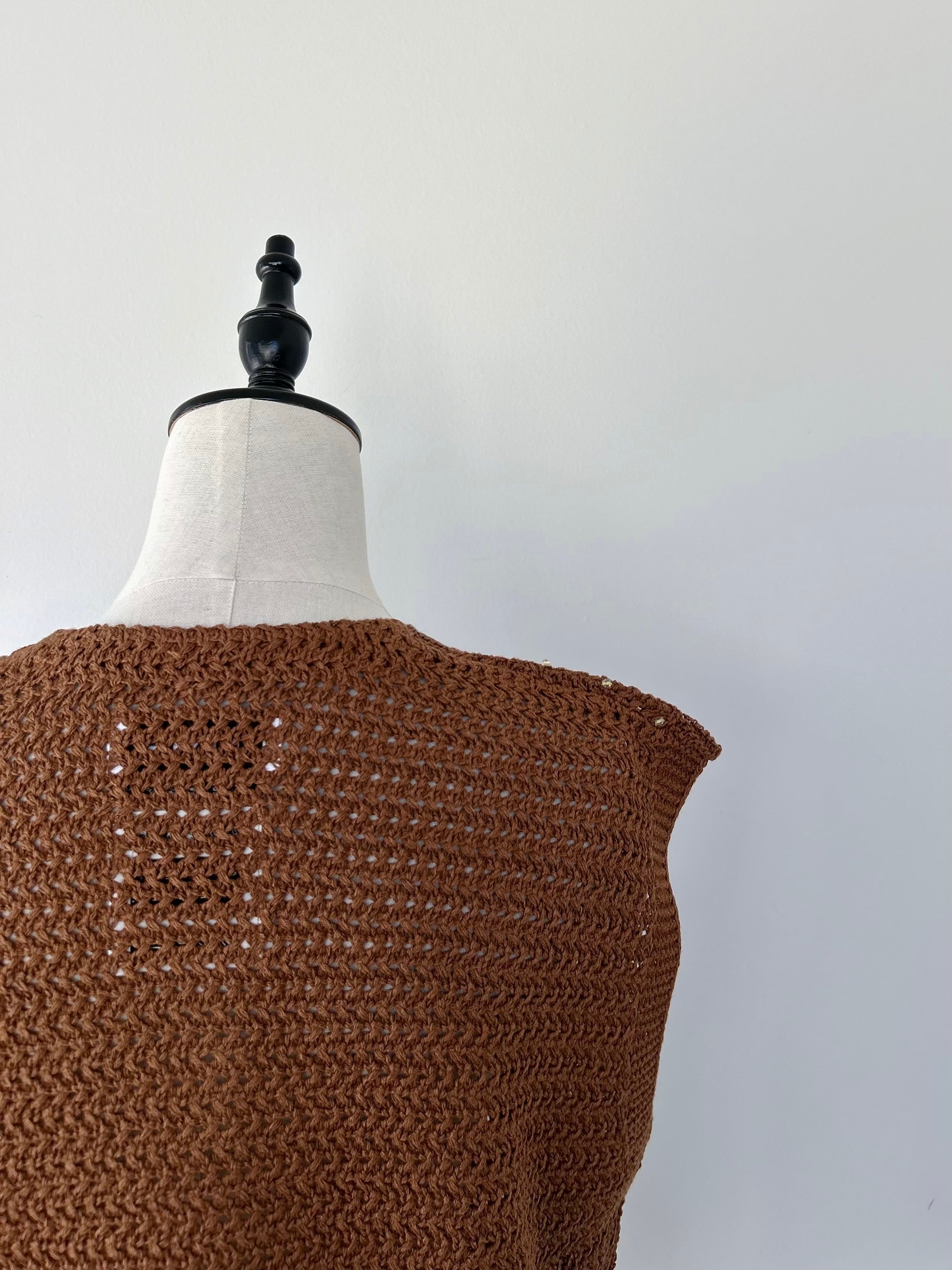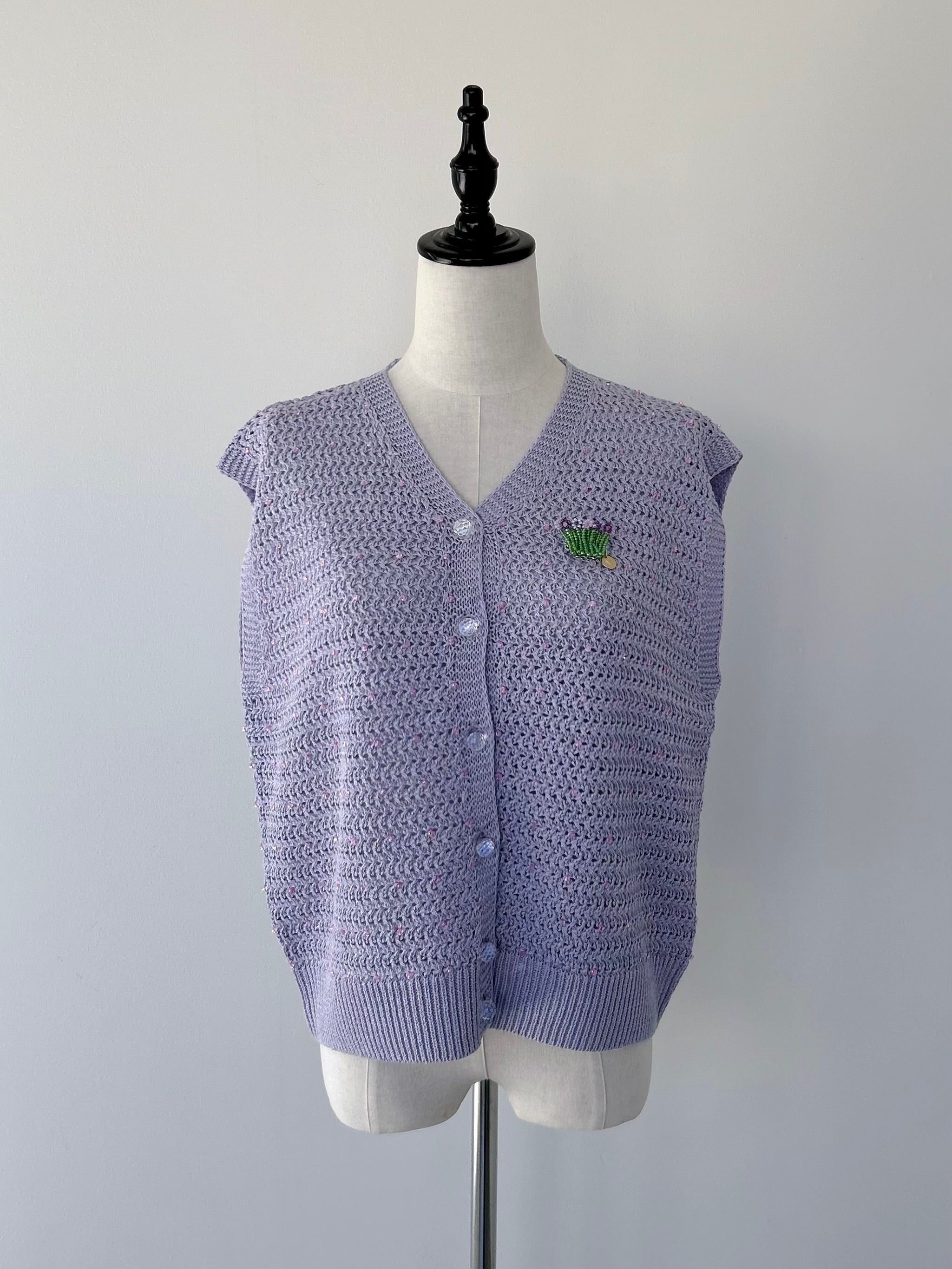 バスケット柄のベストカーディガンに配色糸でクリアビーズを縫いつけたカーディガン。