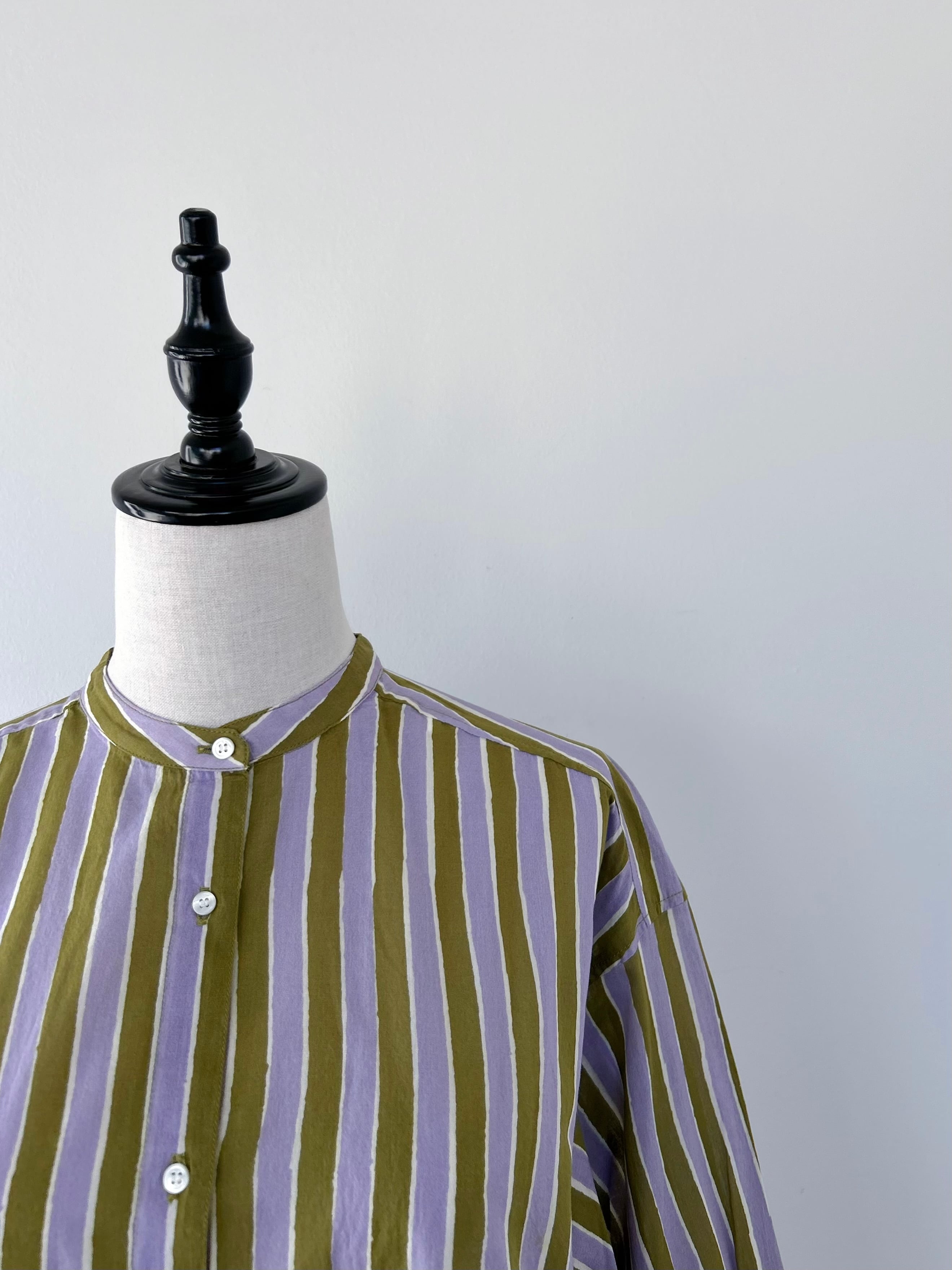 裾はフラットなのでボトムにインしやすく、首元はすっきりとしたマオカラーで軽やかに仕上げています。