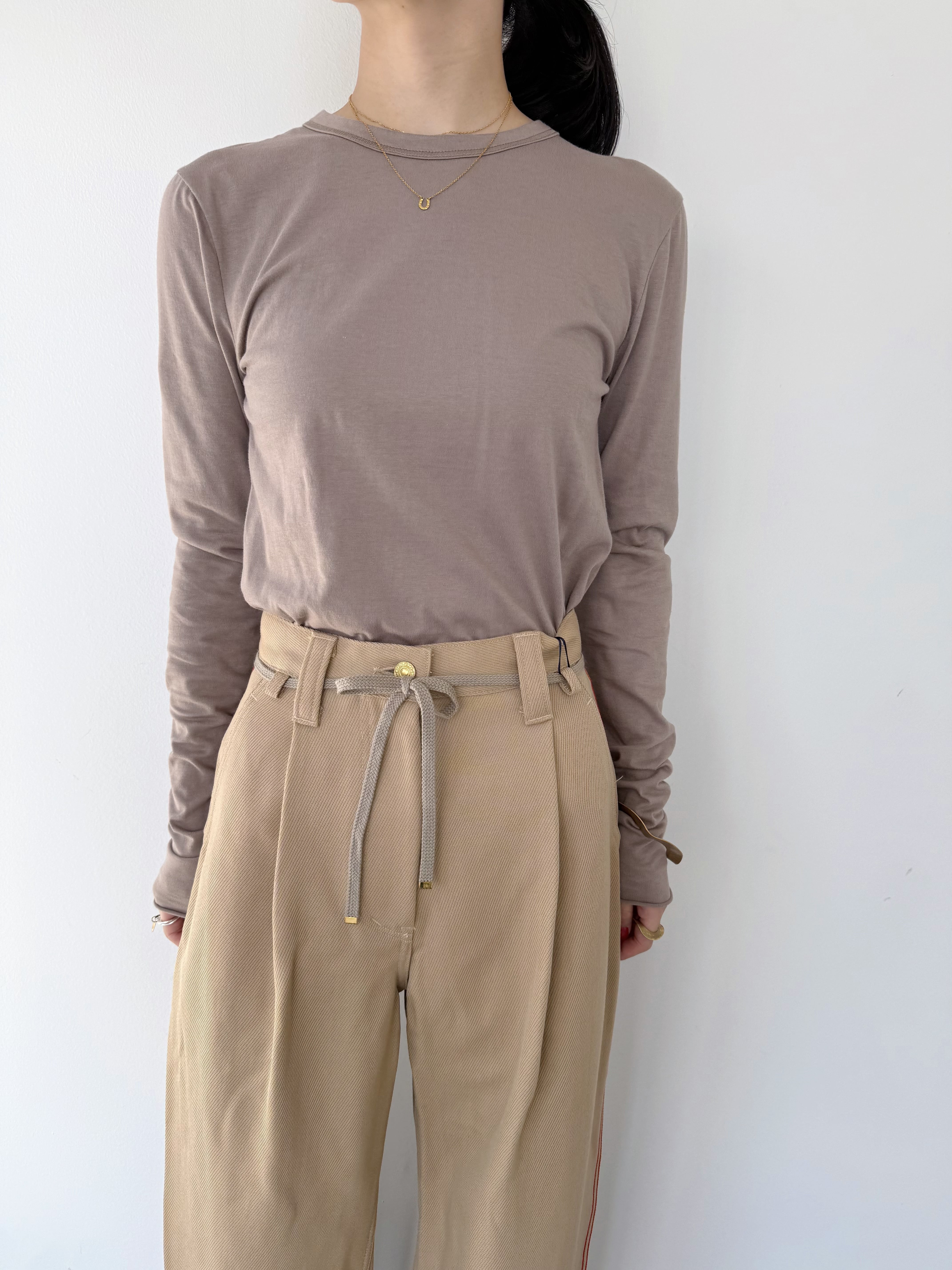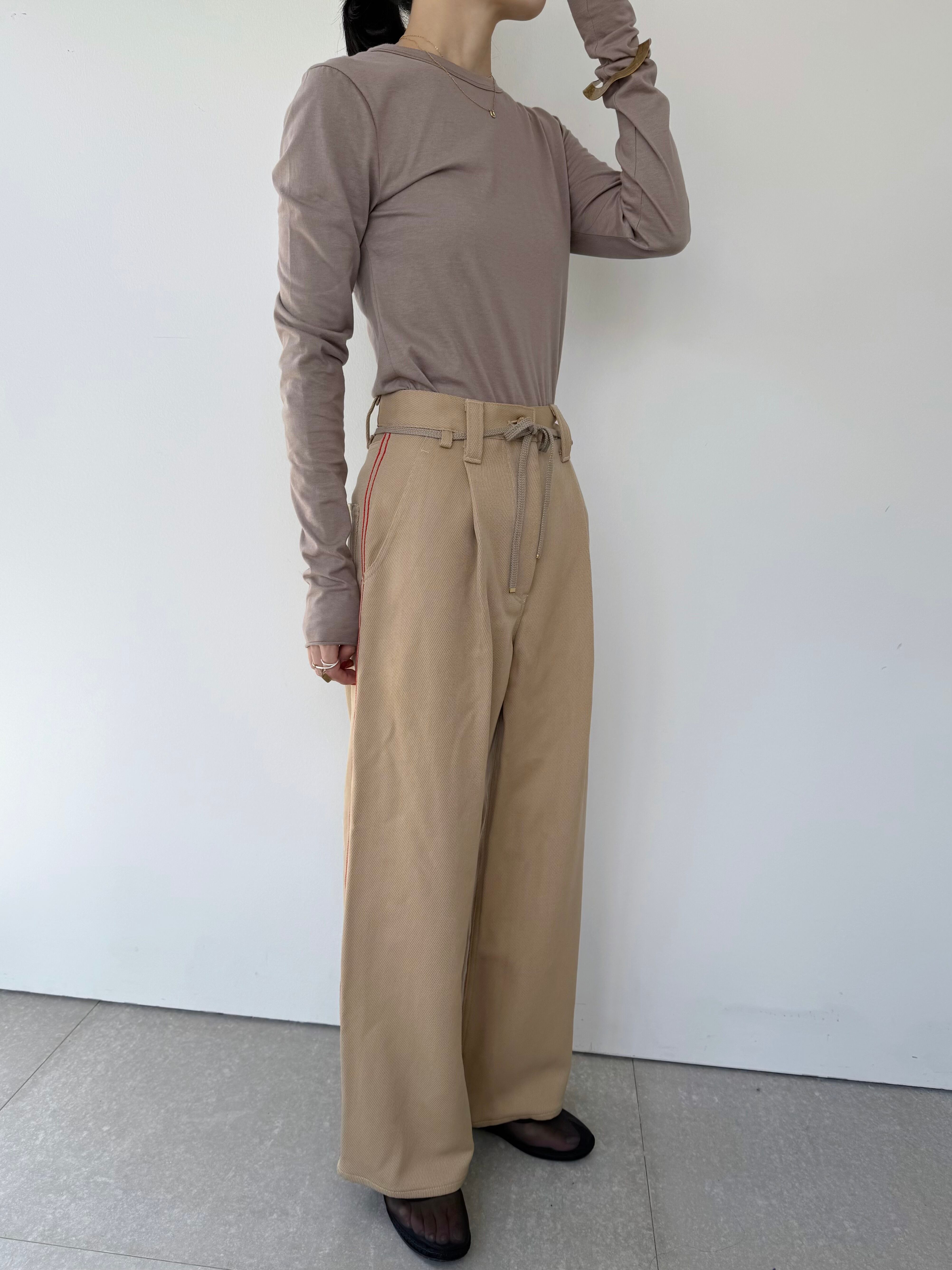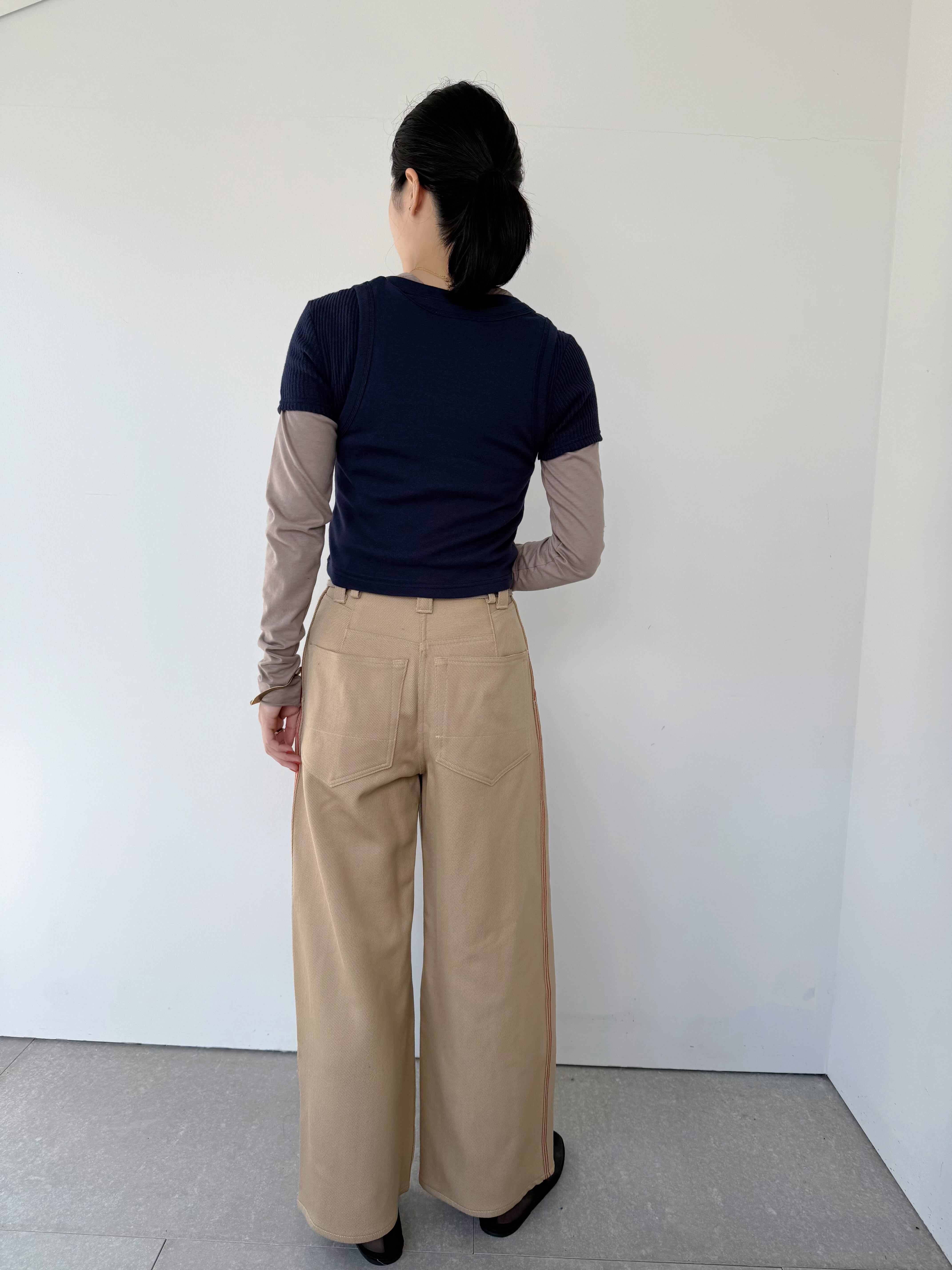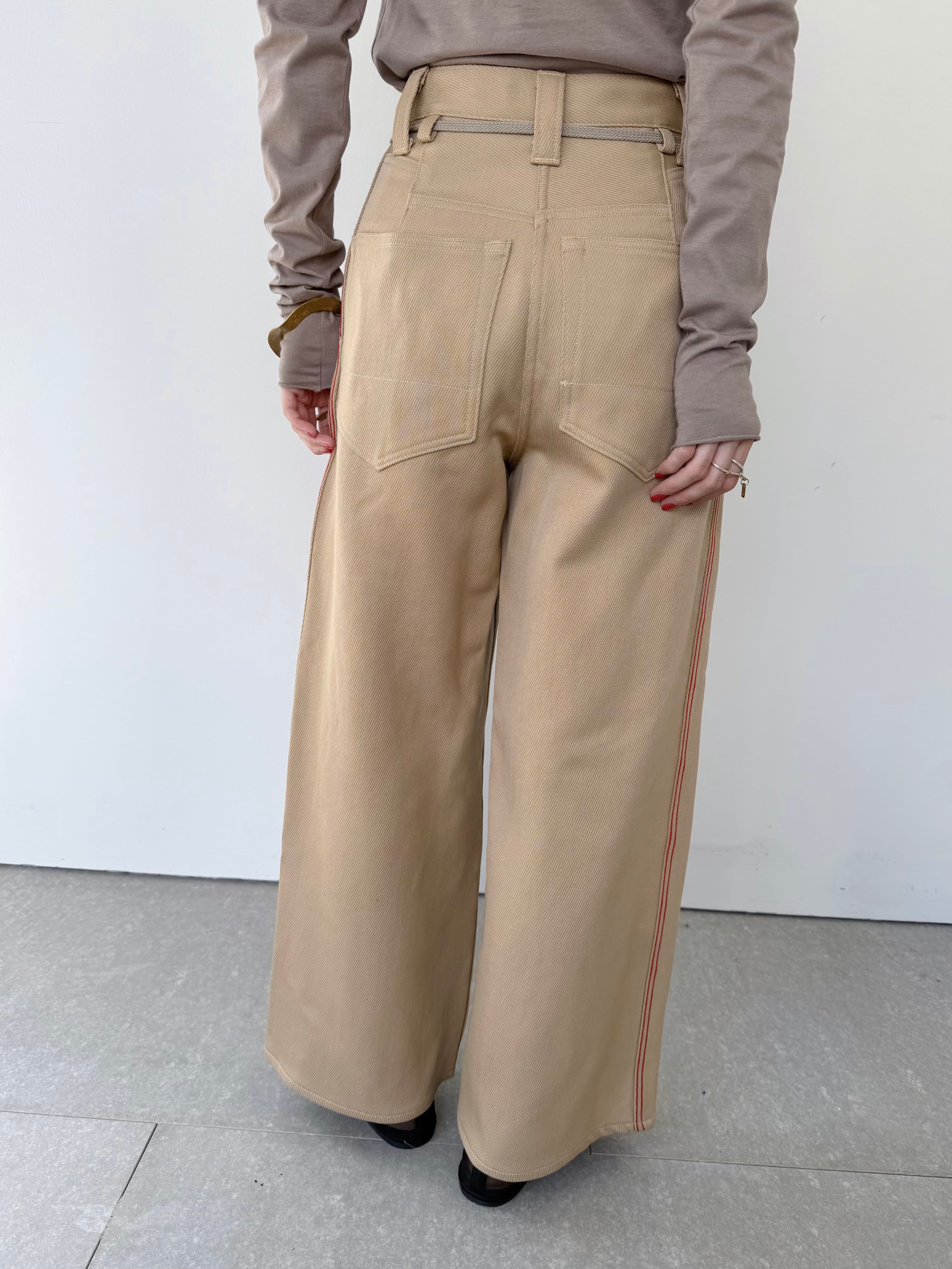 ハイウエストに脇の配色ステッチが効いたモードな印象のワイドパンツ。