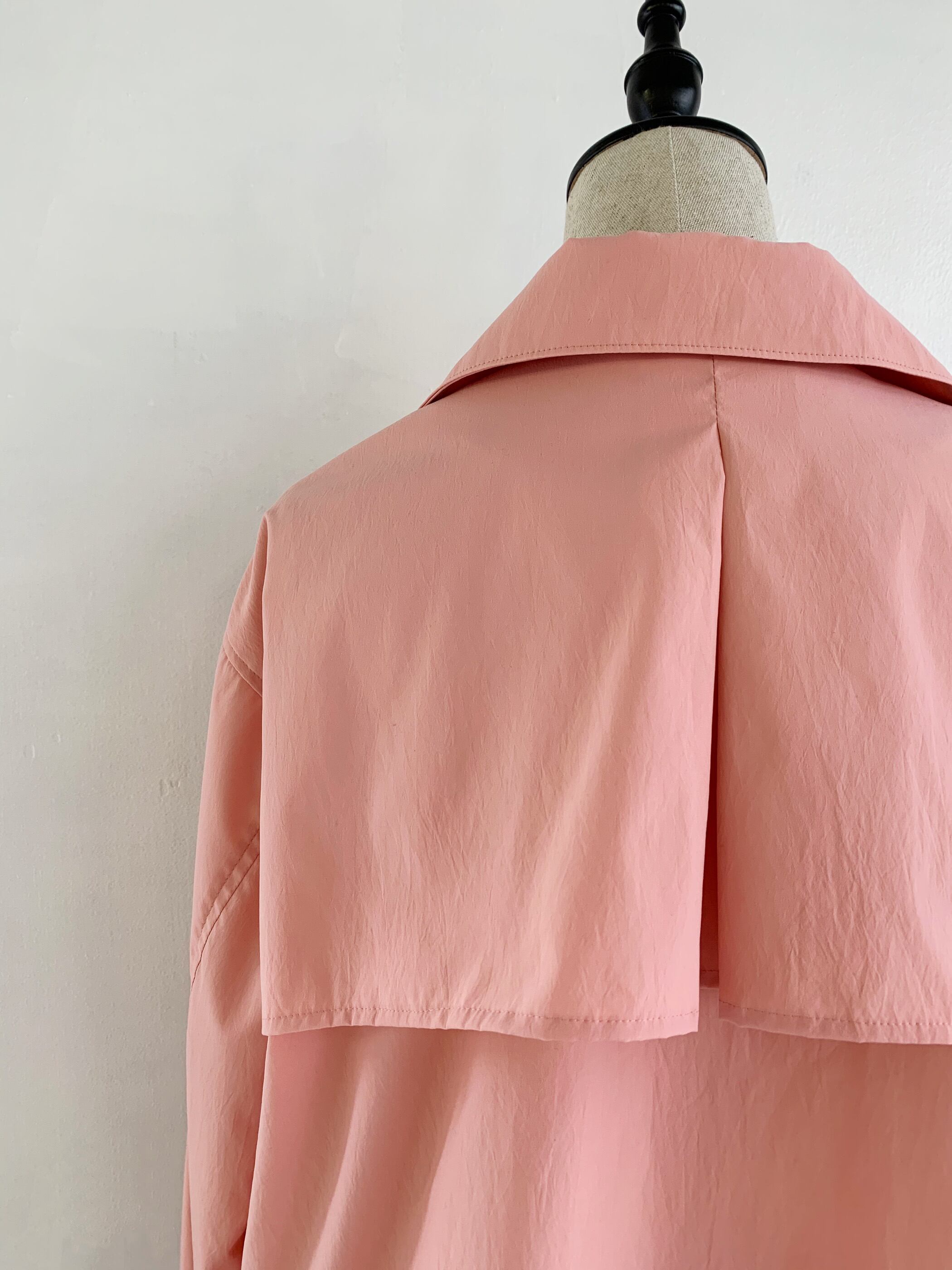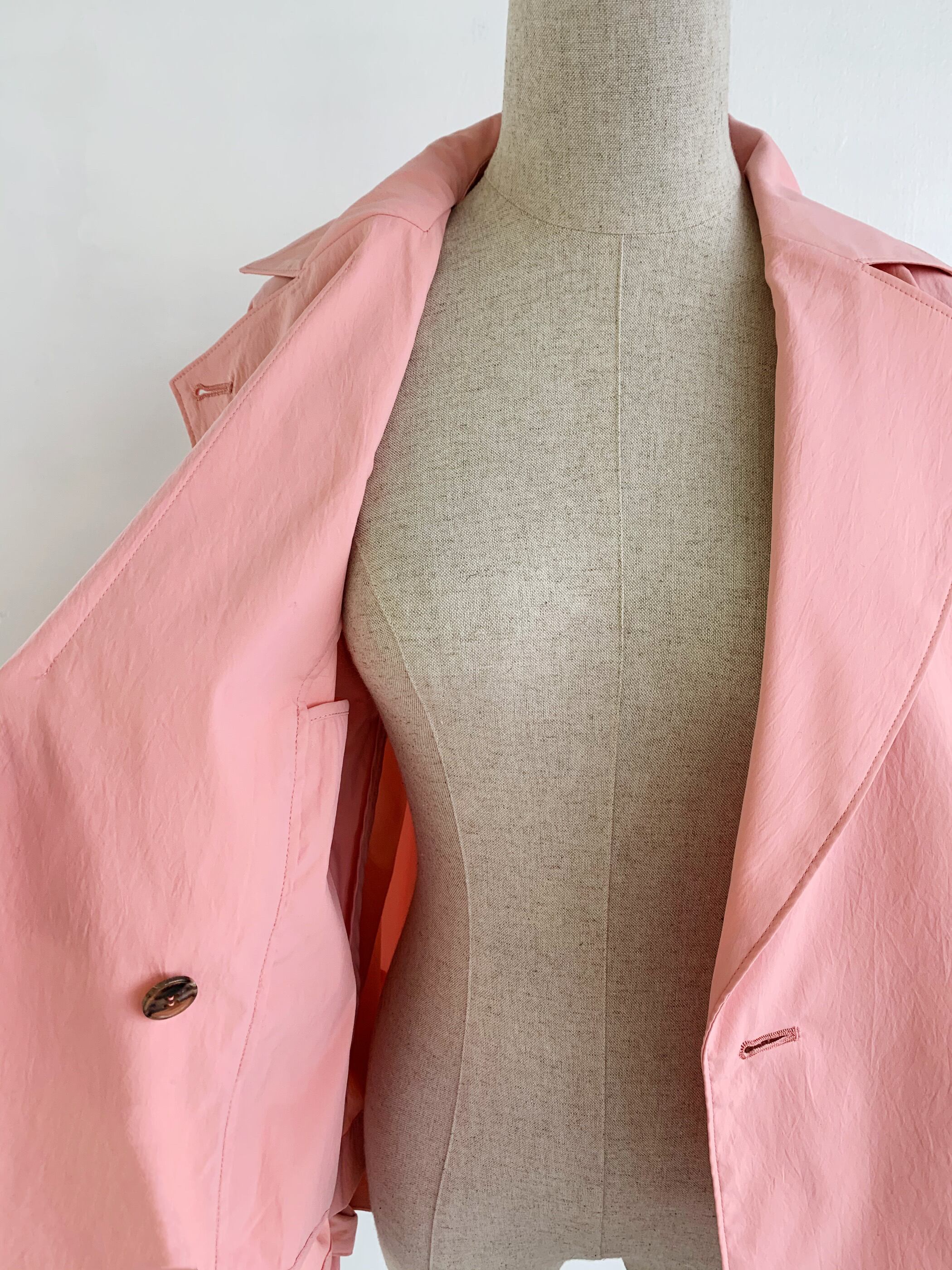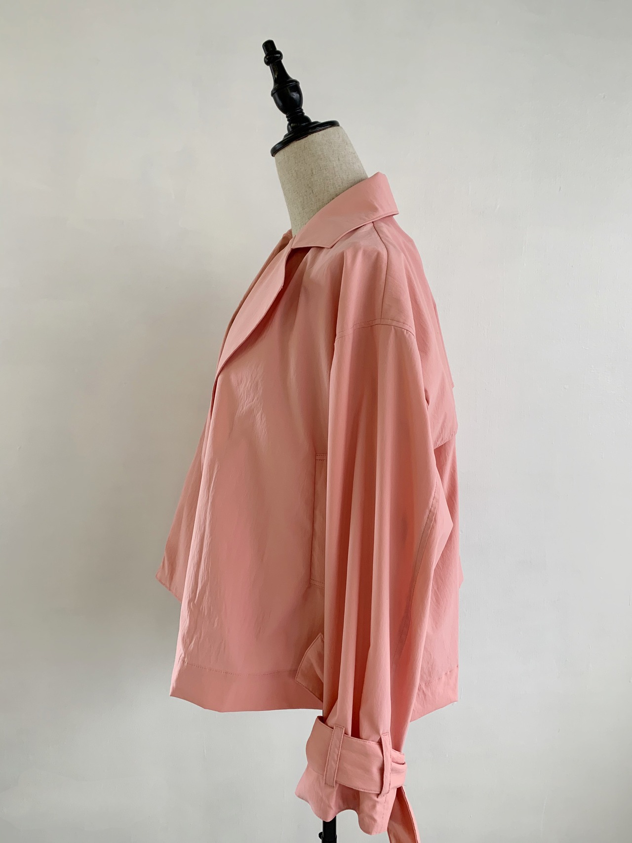 しわになりにくい素材を使用した、春らしいカラーのショート丈トレンチコート。