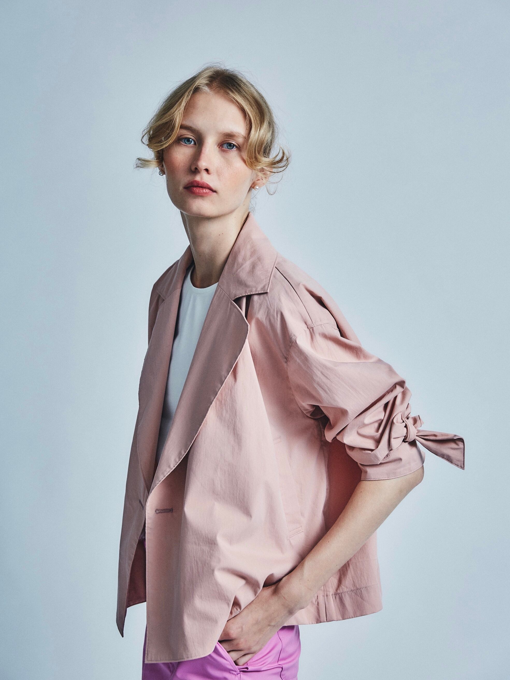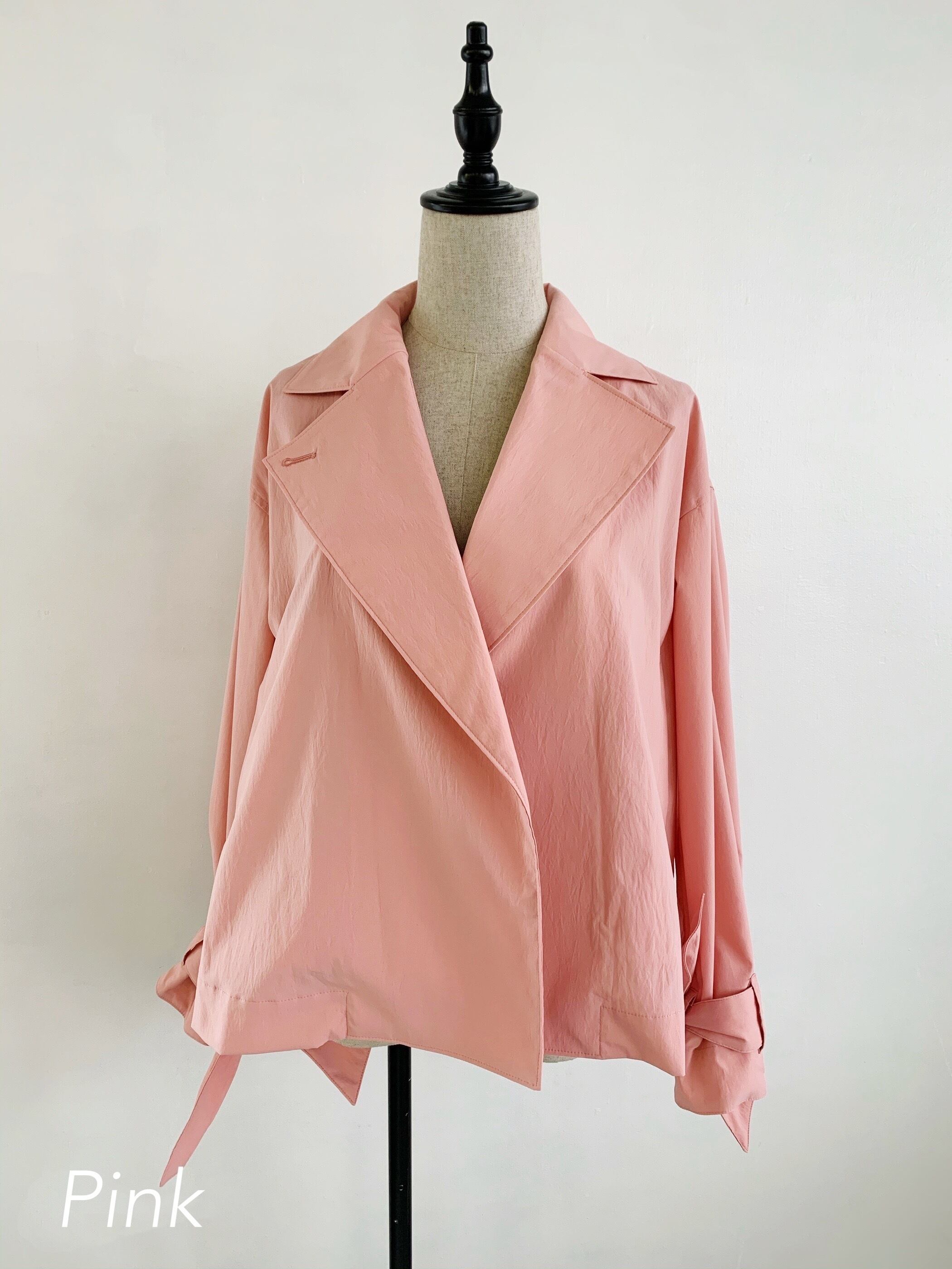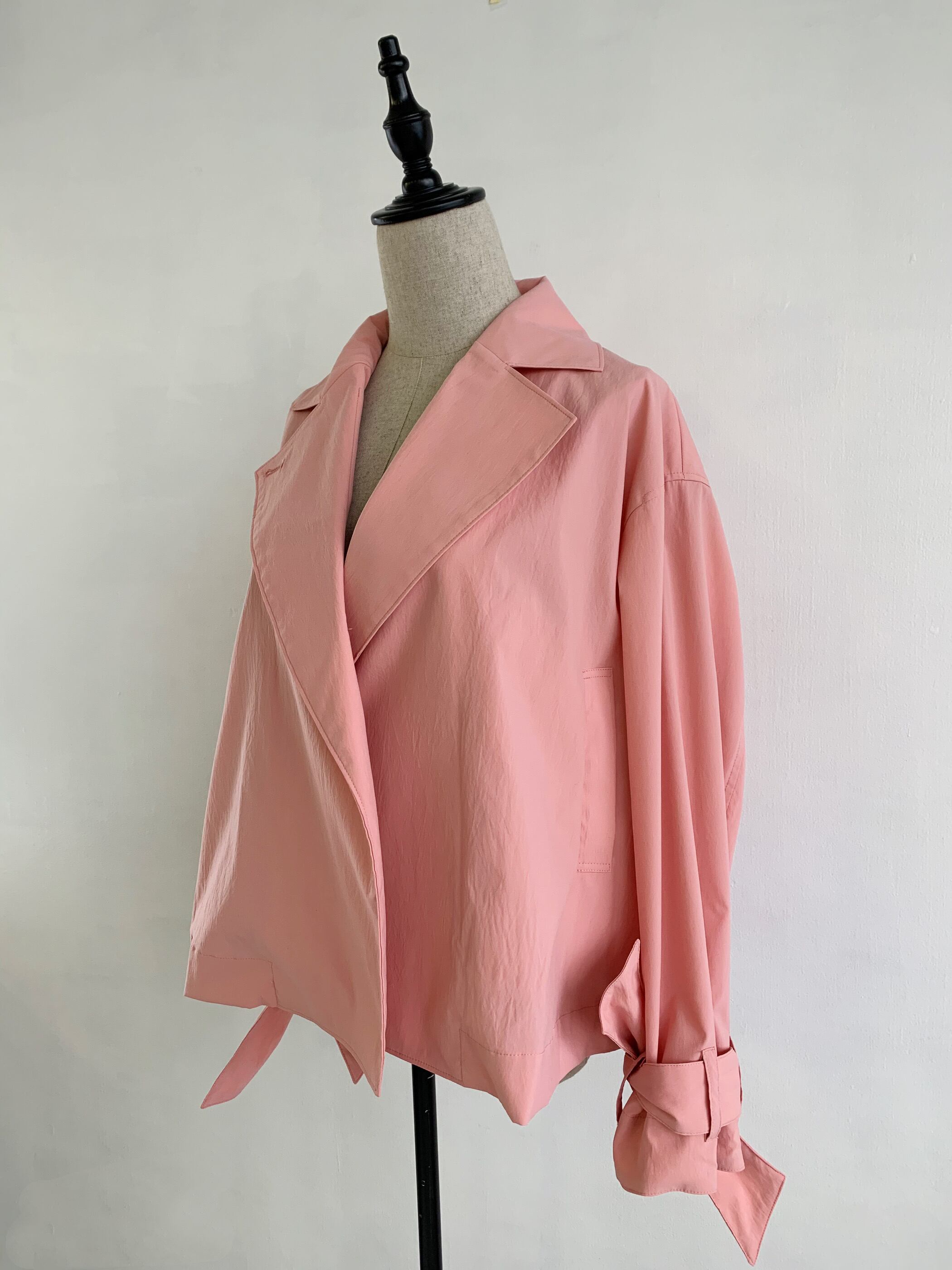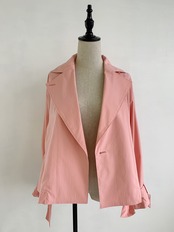 しわになりにくい素材を使用した、春らしいカラーのショート丈トレンチコート。