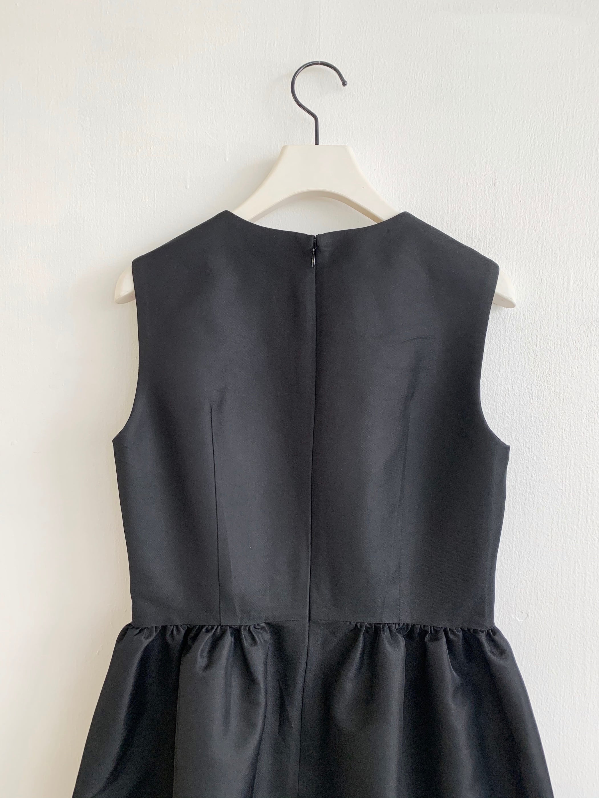 コンパクトなクルーネックに、ウエスト切り替えからボリュームのあるシルエットがポイント。