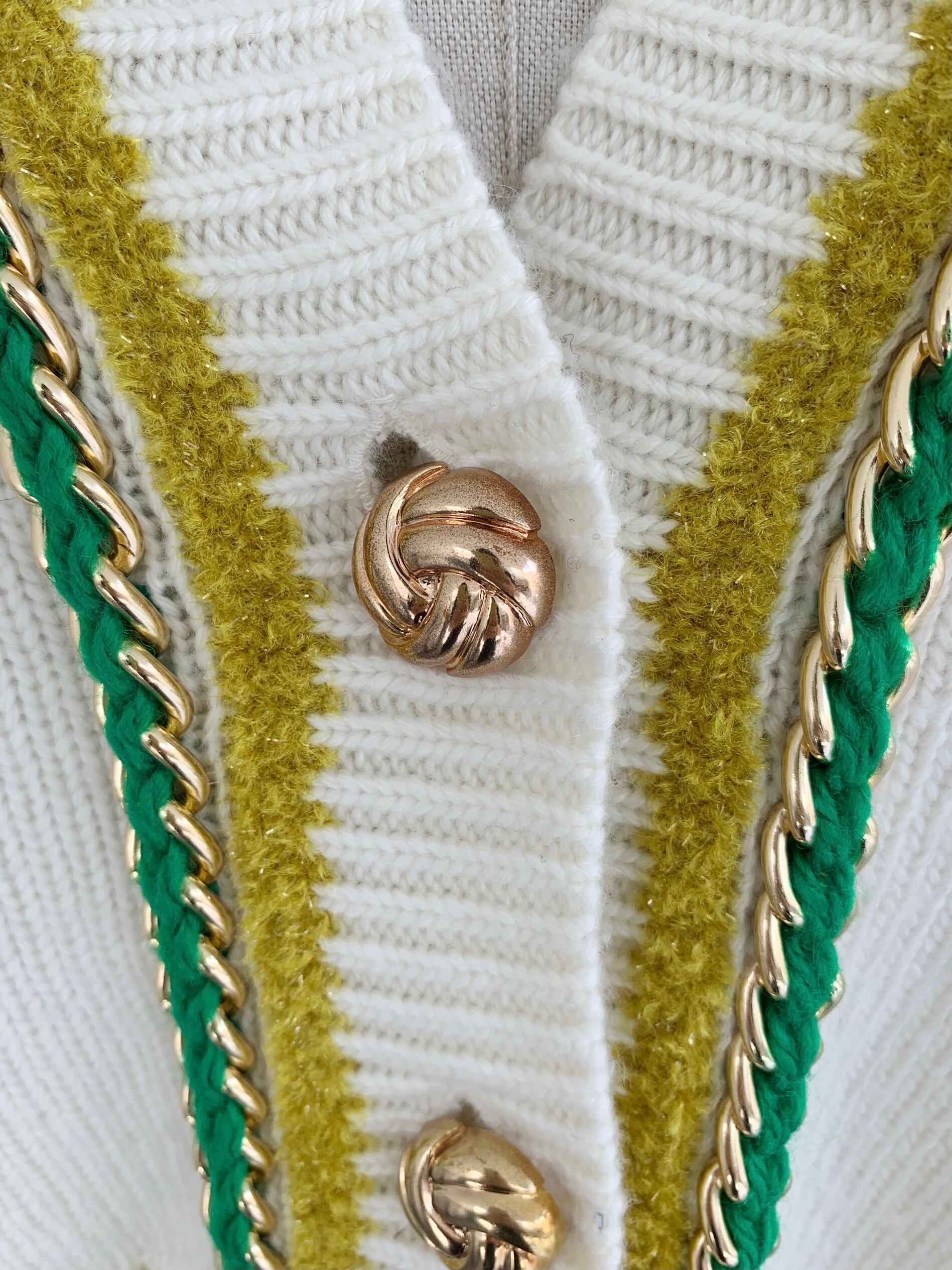 鮮やかな配色に、ヴィンテージ感のあるボタンやチェーンがポイント。