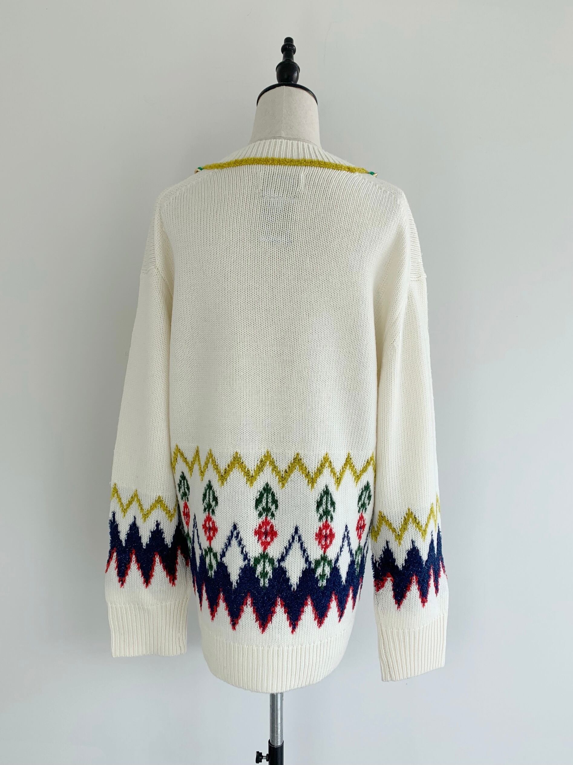 光沢感のあるモール糸を織り込んだノルディック柄のカーディガン。