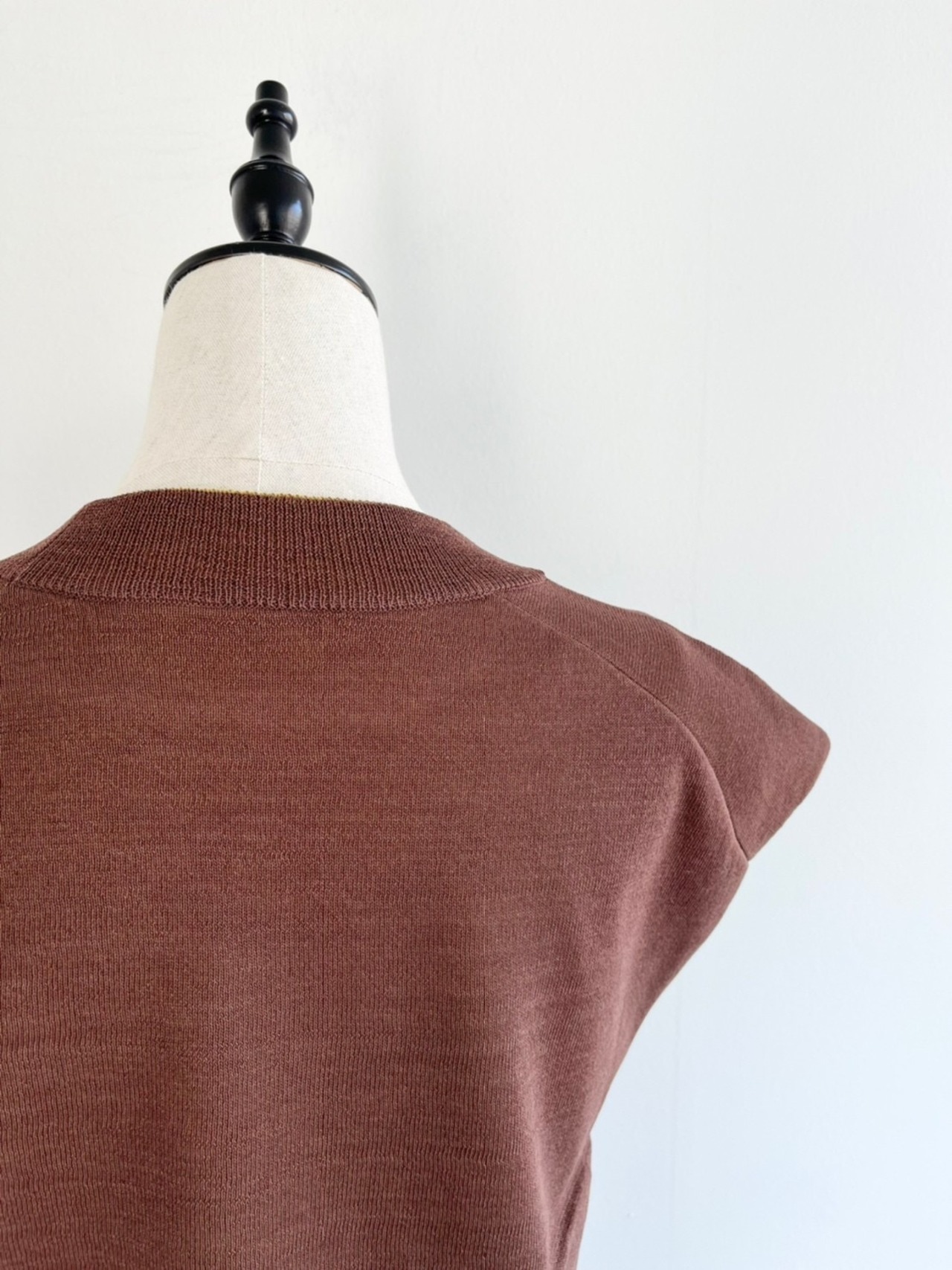 タフタ素材で仕立てたハリ感のあるブラウス。形は使いやすいフレンチスリーブのハイネックで、トリム部分の配色もデザインポイント。