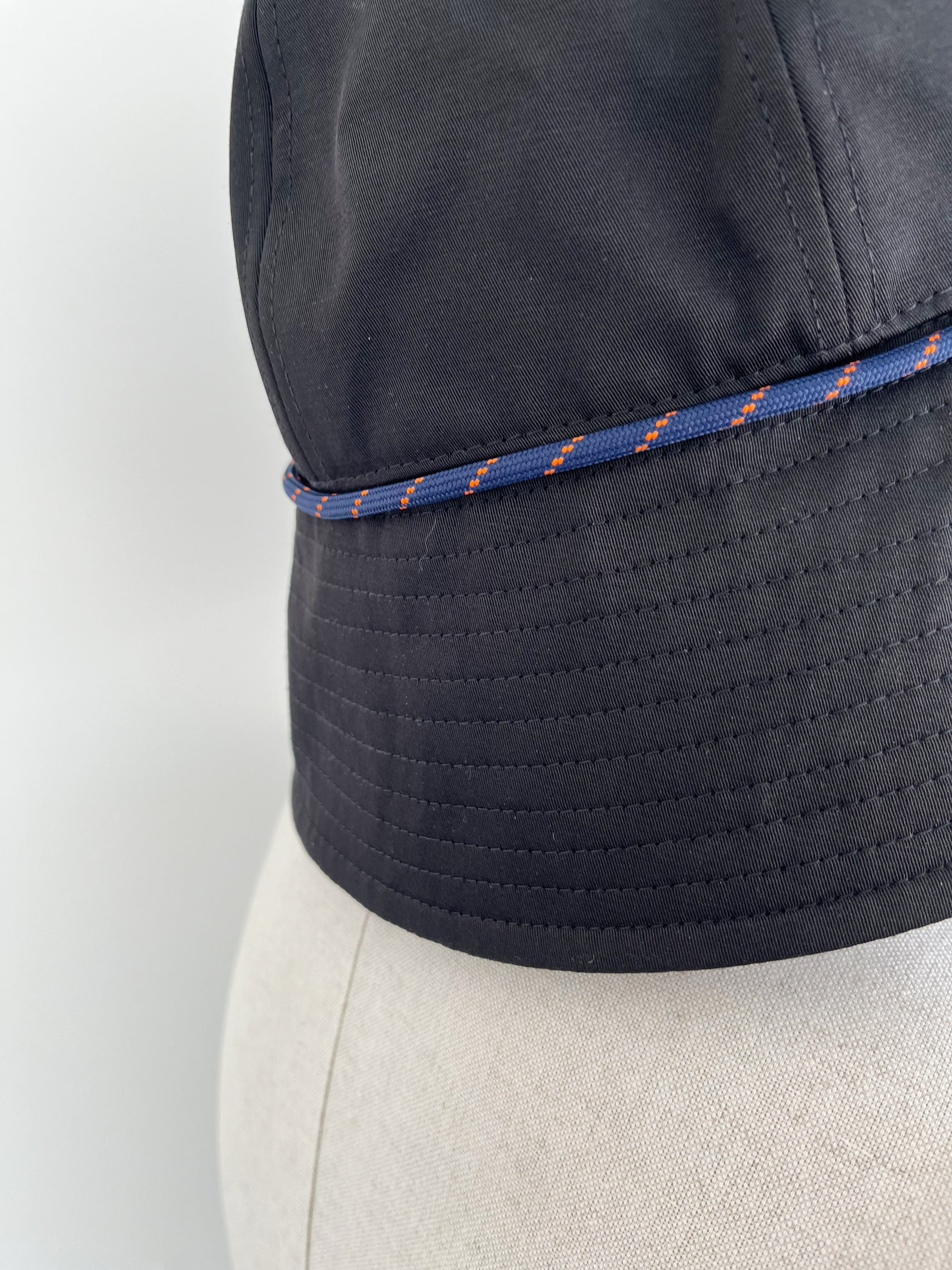 つば下がりの角度でコンパクトな印象に仕上げたバケットハット。