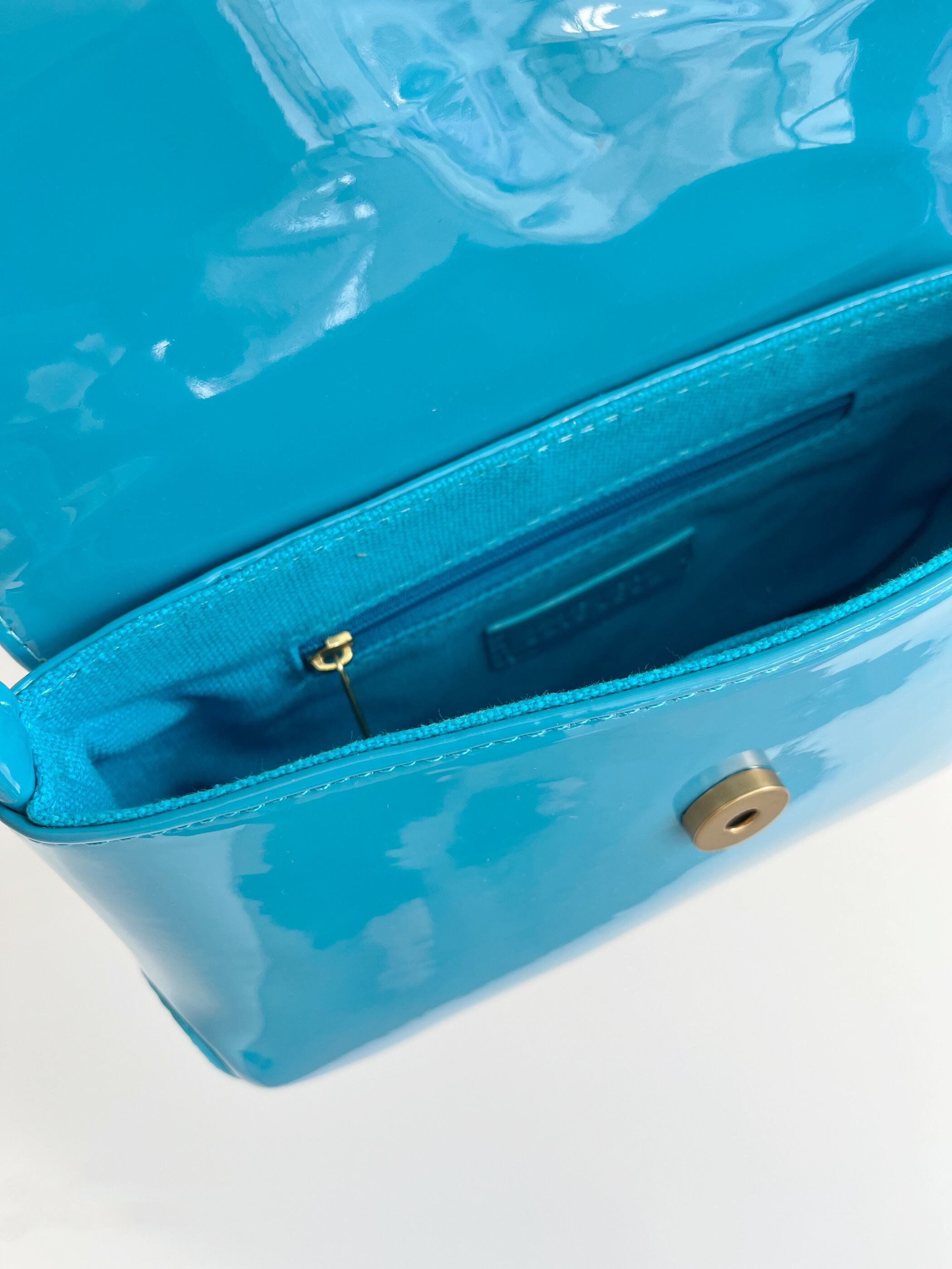エナメル素材のハンドバッグ。鮮やかなブルーカラーが印象的。