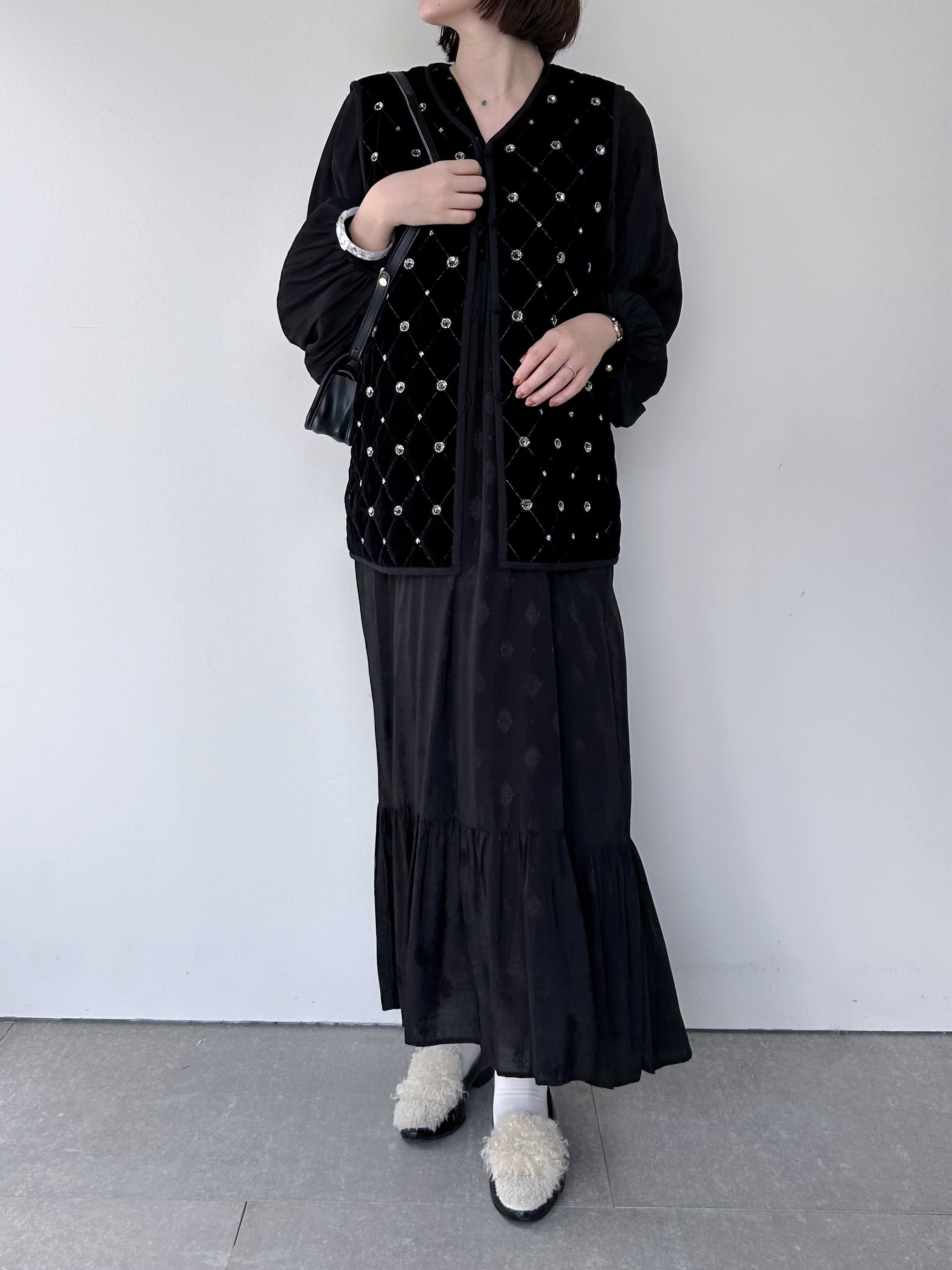 ベルベッド生地にたっぷりのビーズ刺繍を施したロングジレ。
