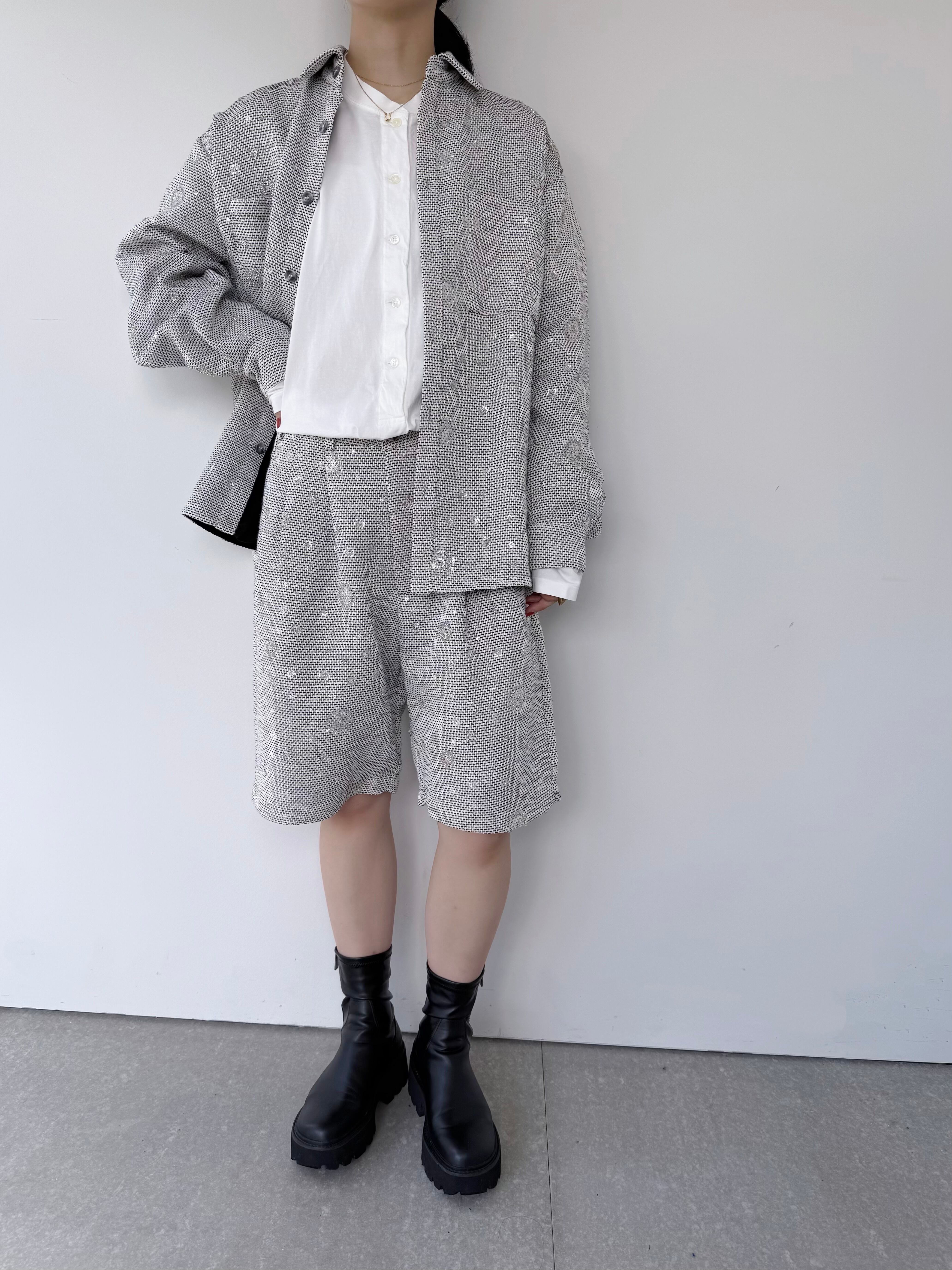 ビーズとスパンコールでデザインされたグレーカラーのツイードジャケット。