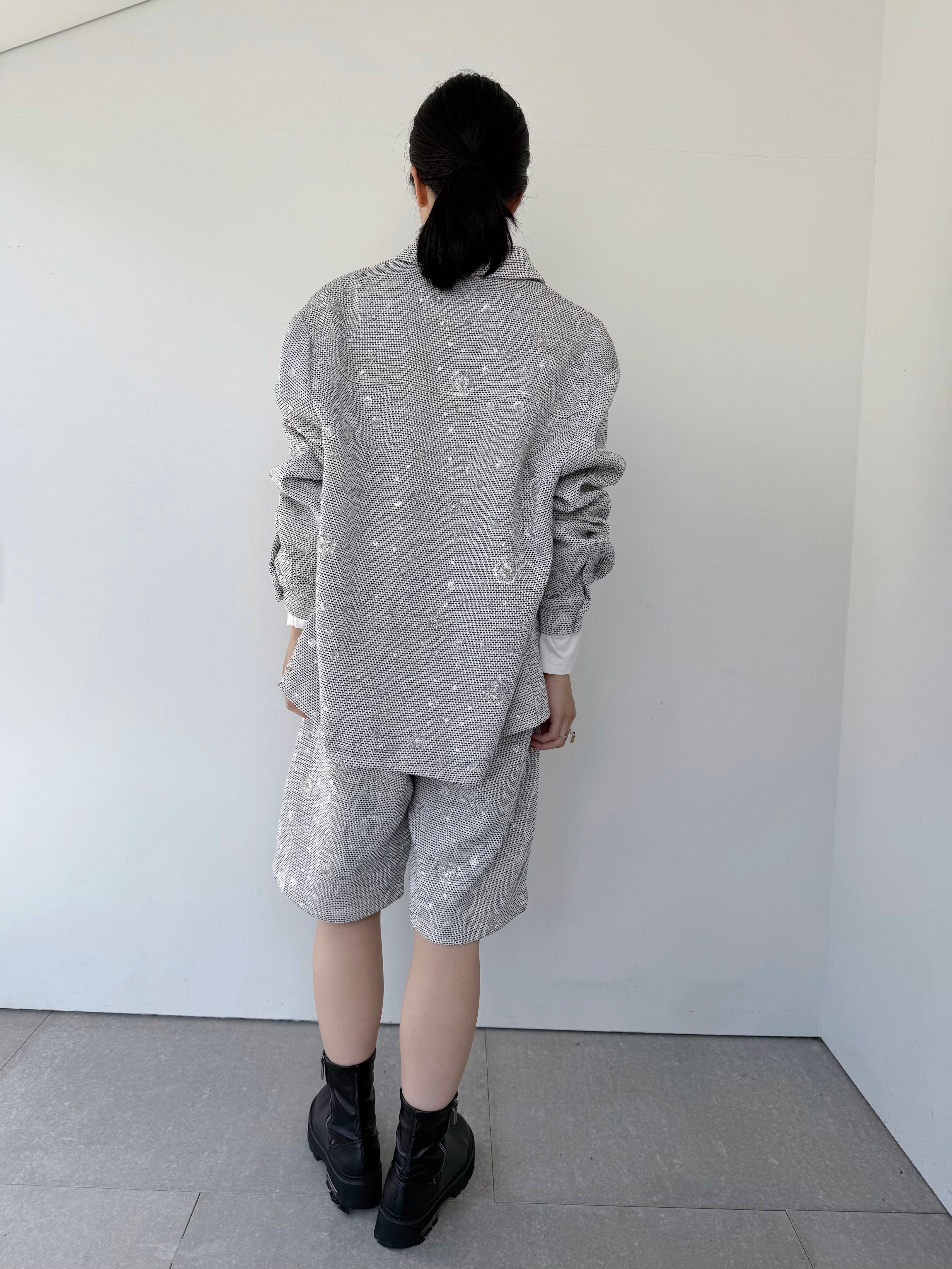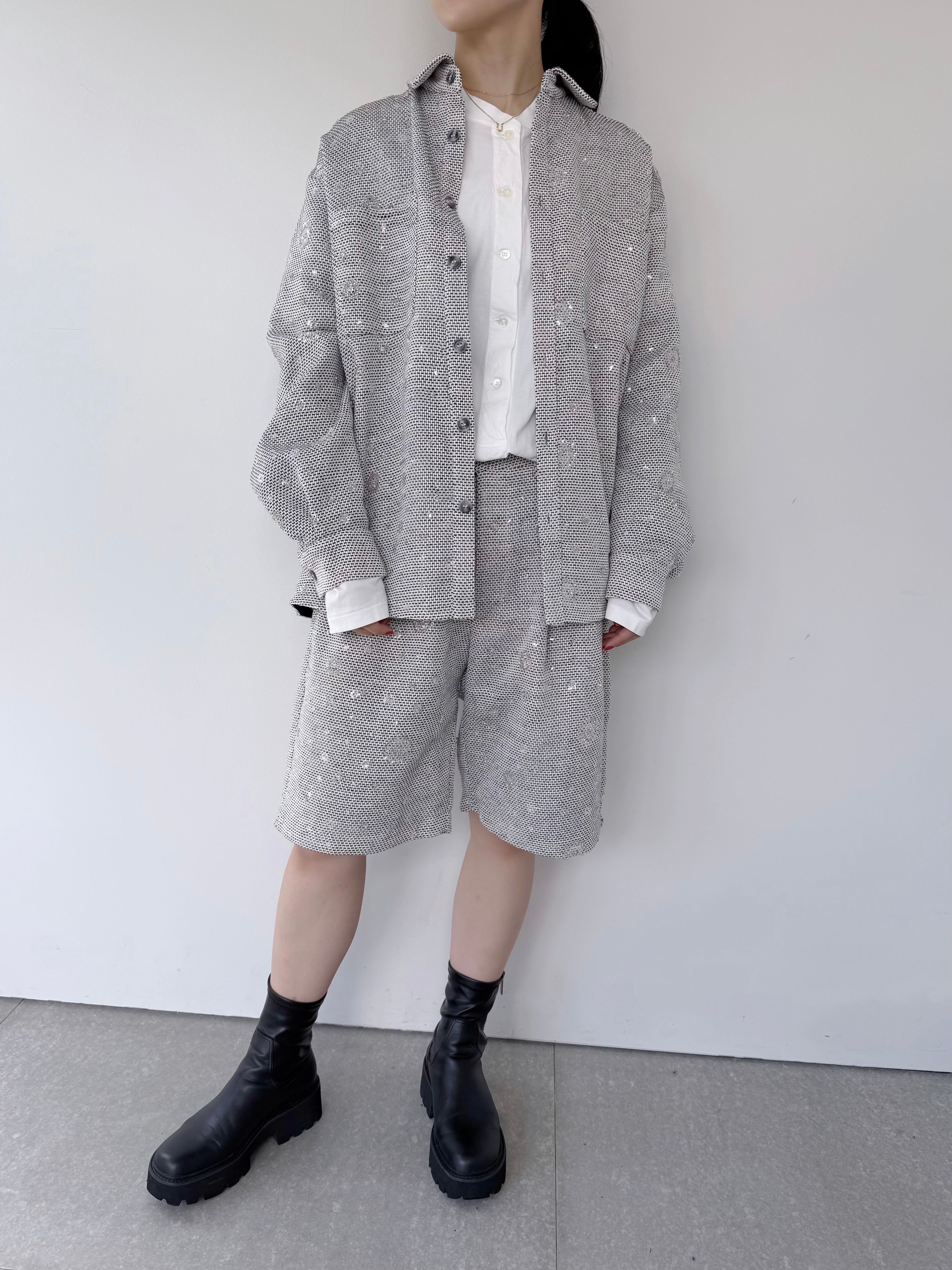 グレーカラーのツイード素材にビーズとスパンコールでデザインされたパンツ。