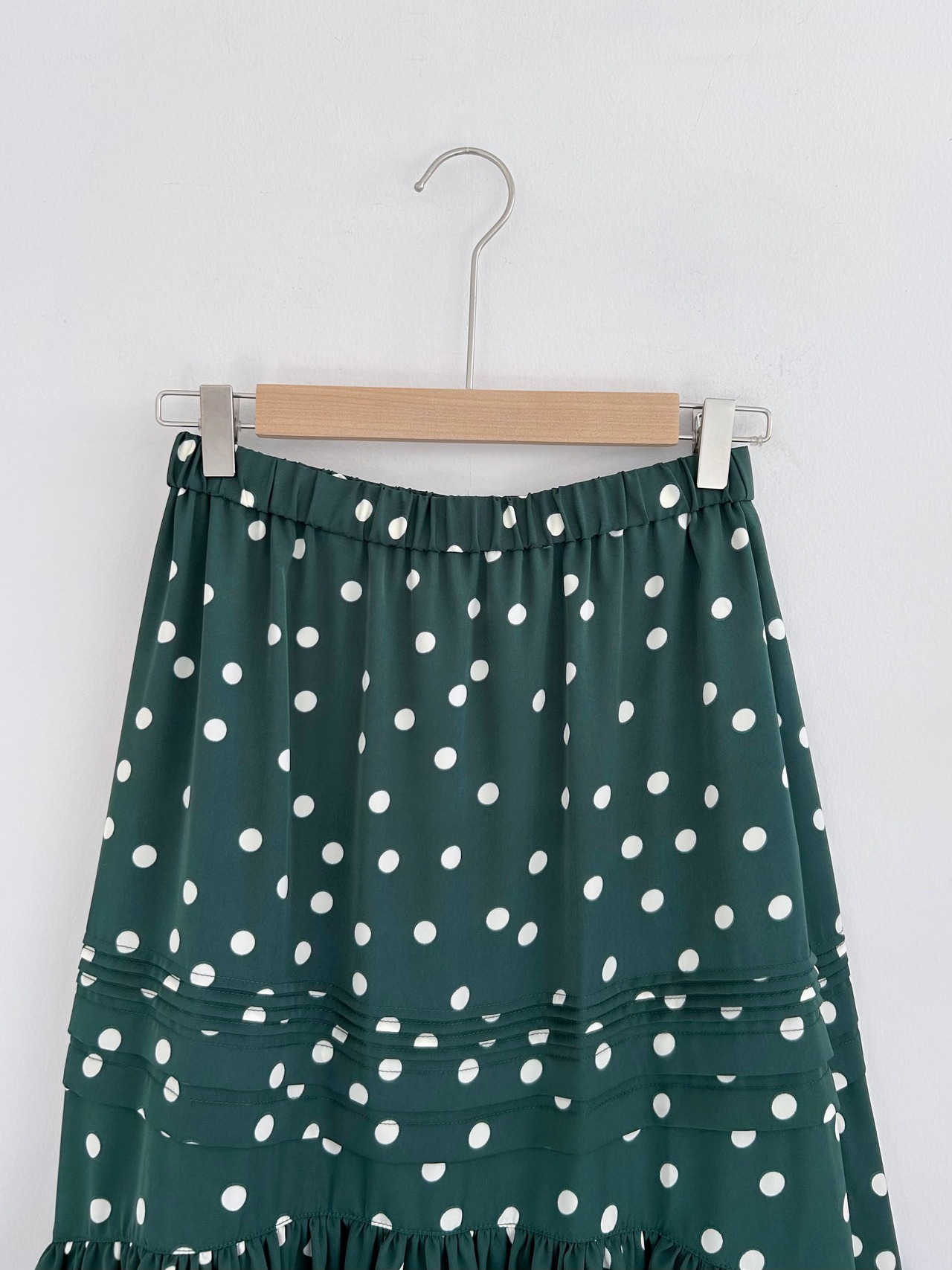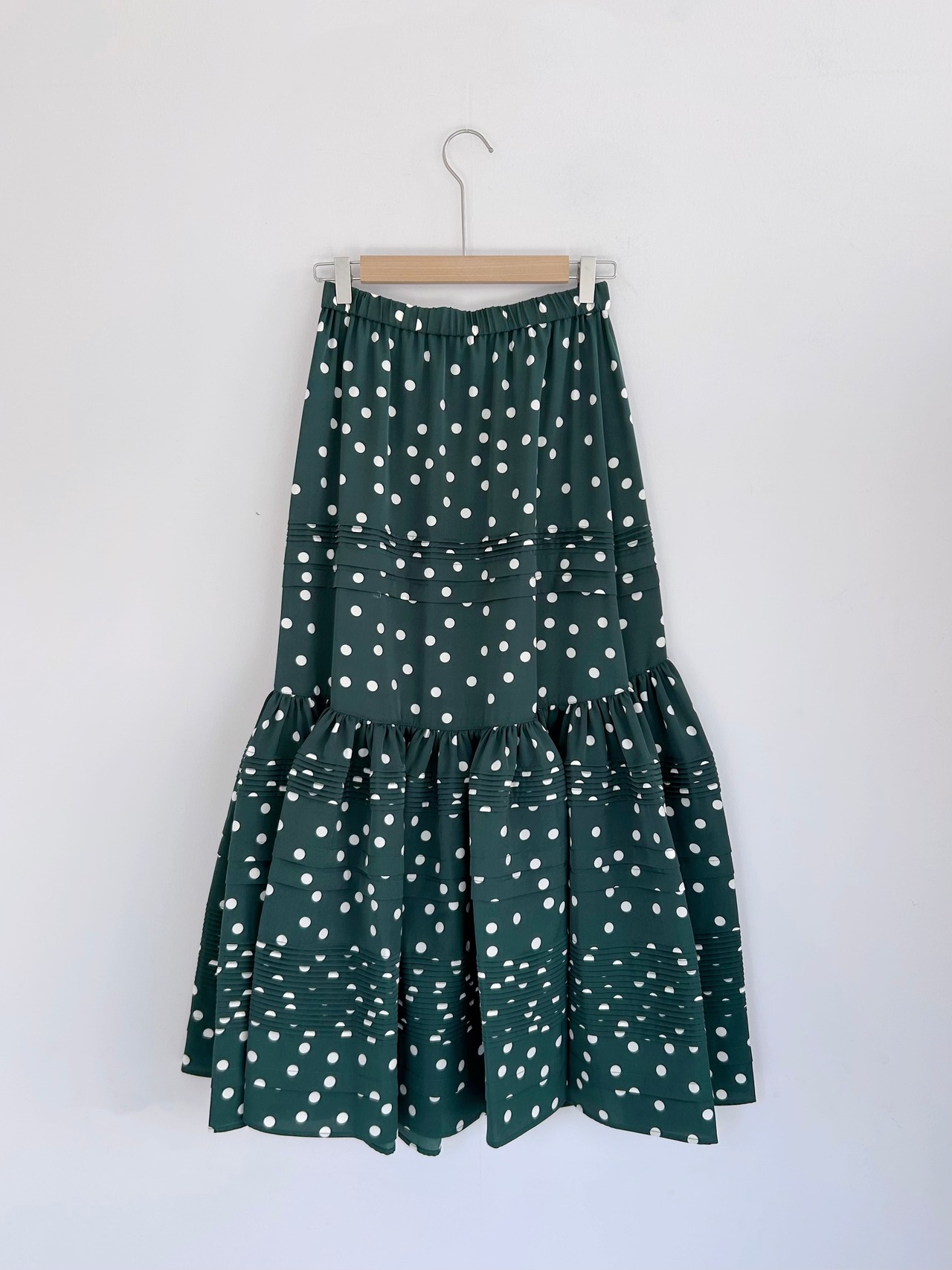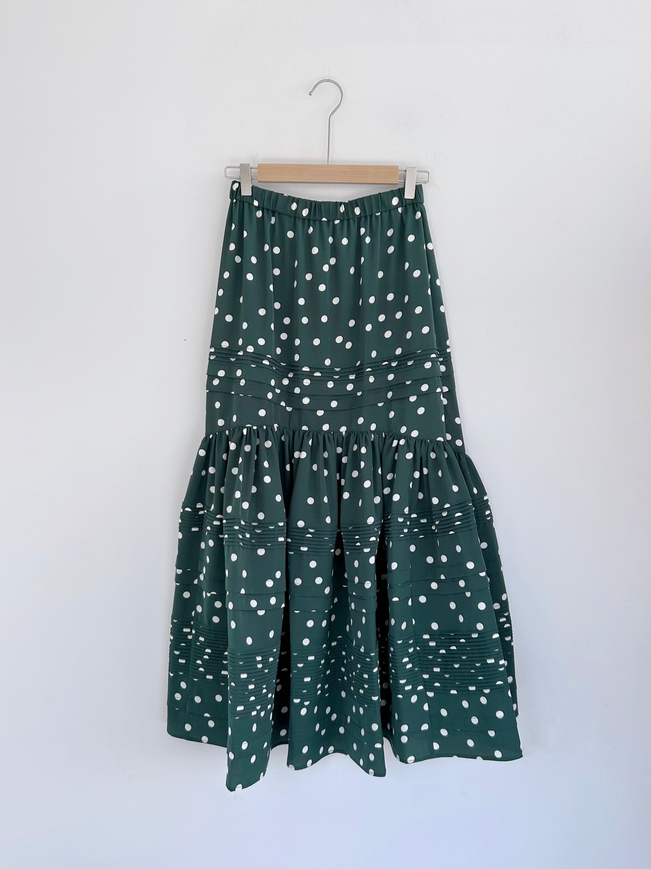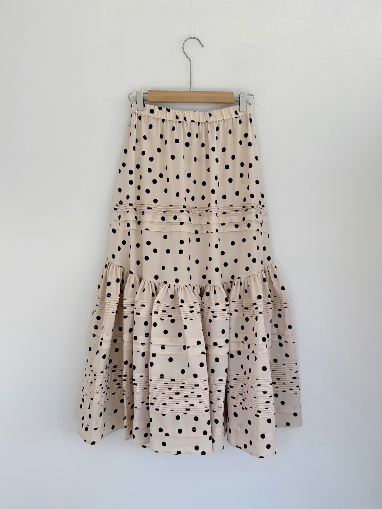 ランダムなドットプリントに細かなピンタックをあしらったティアードスカート。