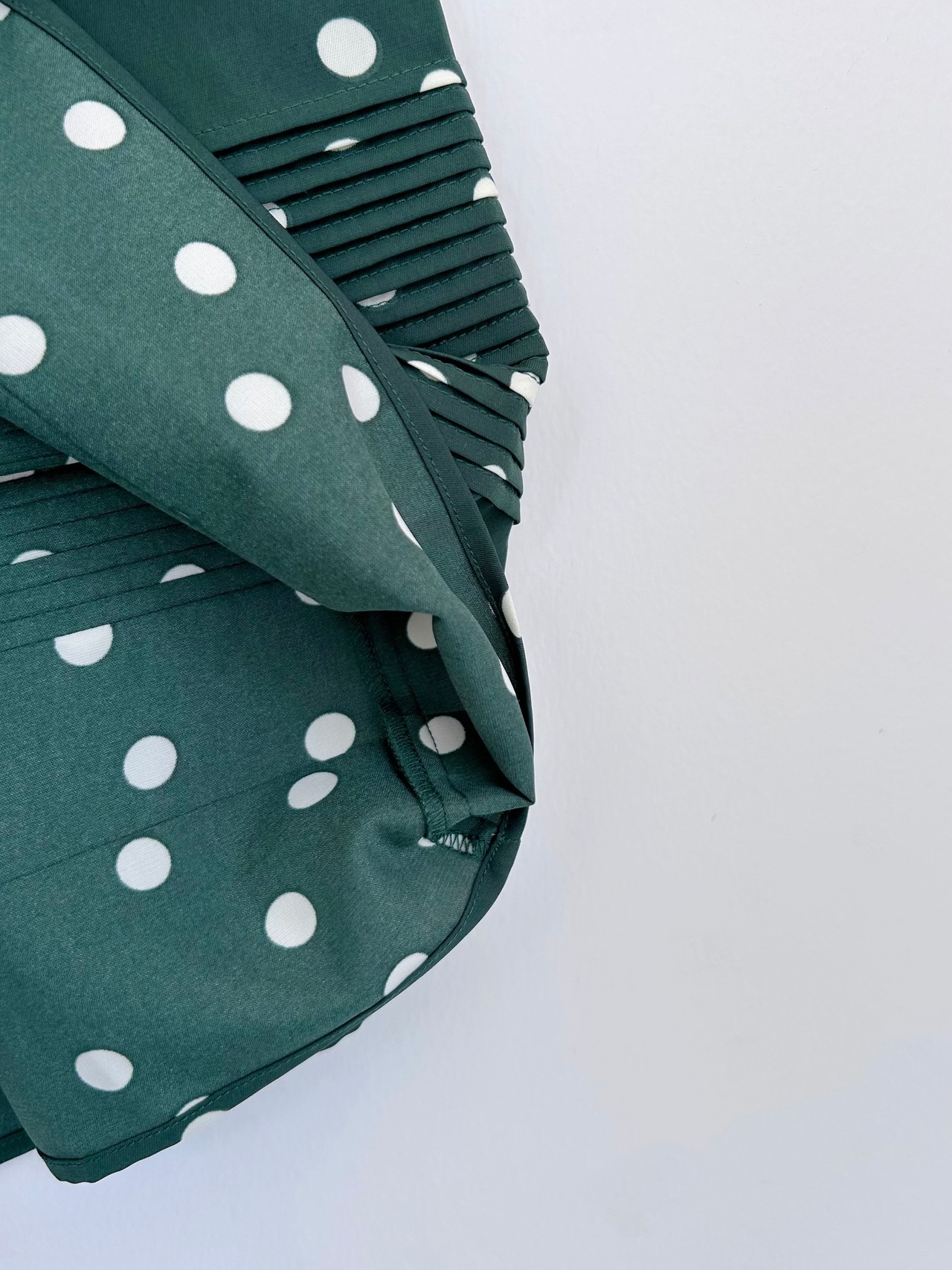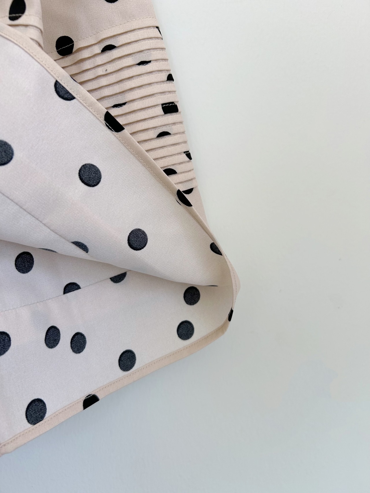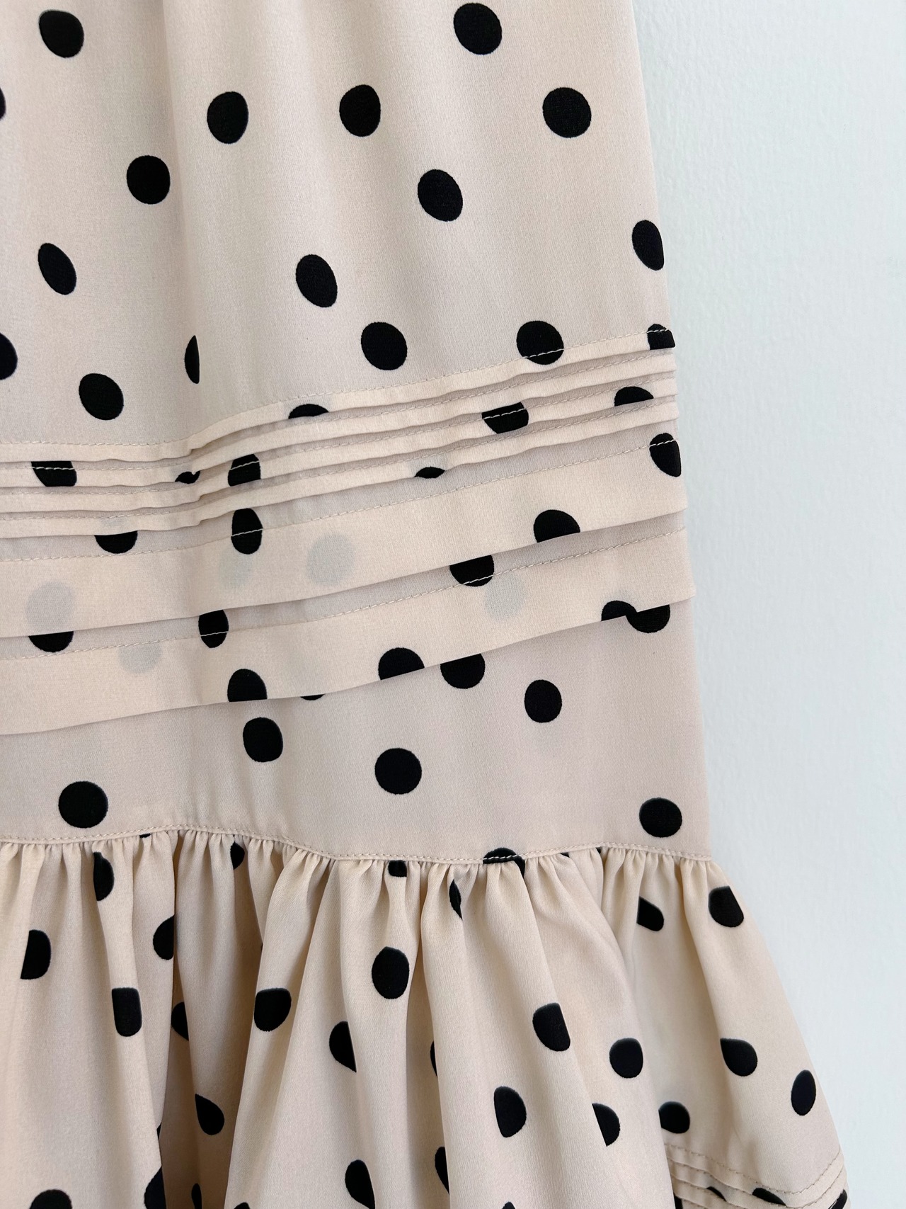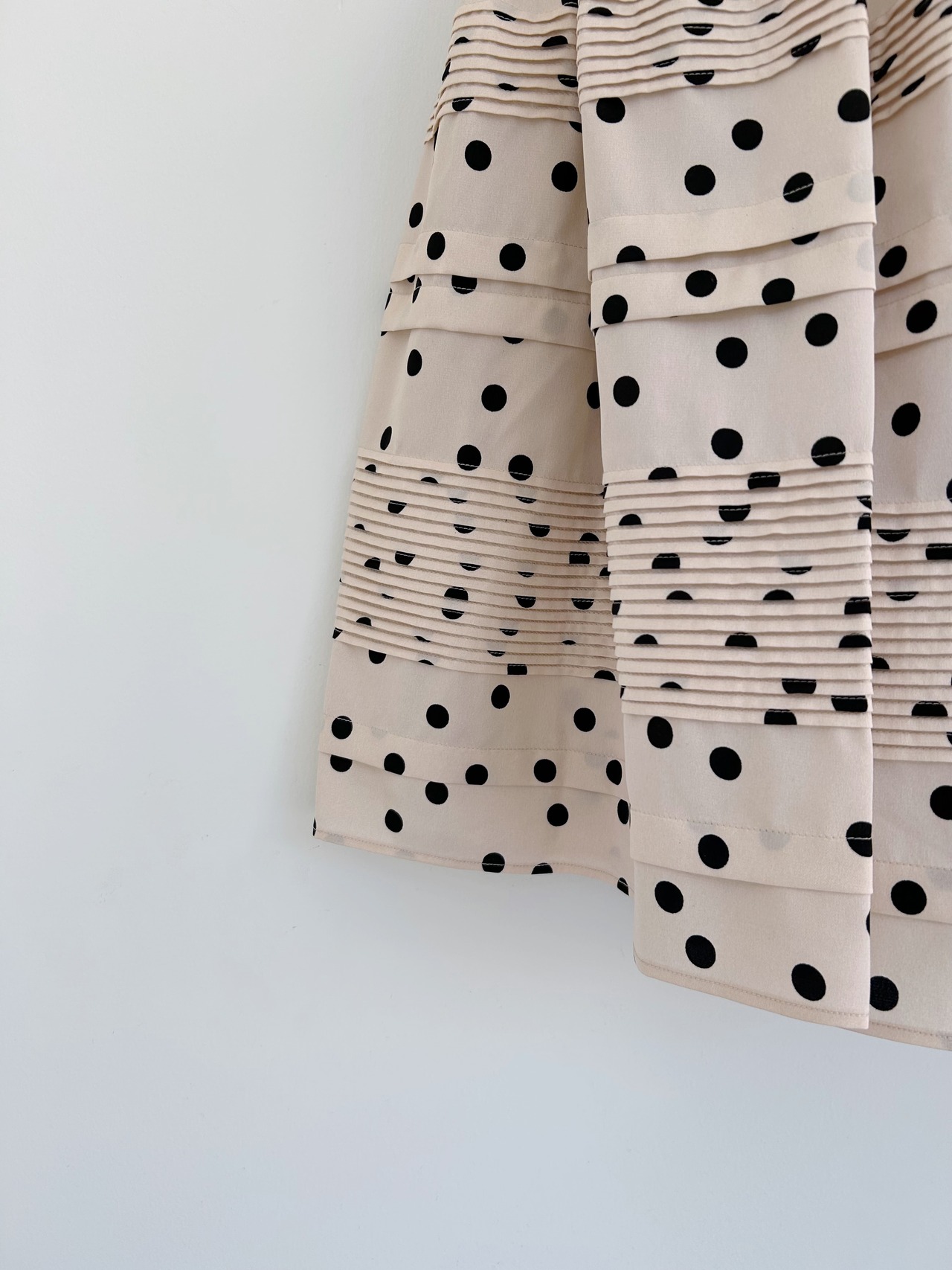 ランダムなドットプリントに細かなピンタックをあしらったティアードスカート。