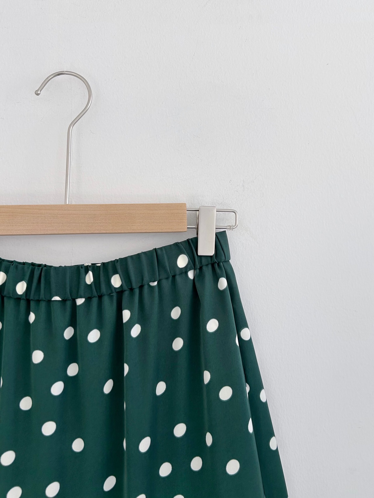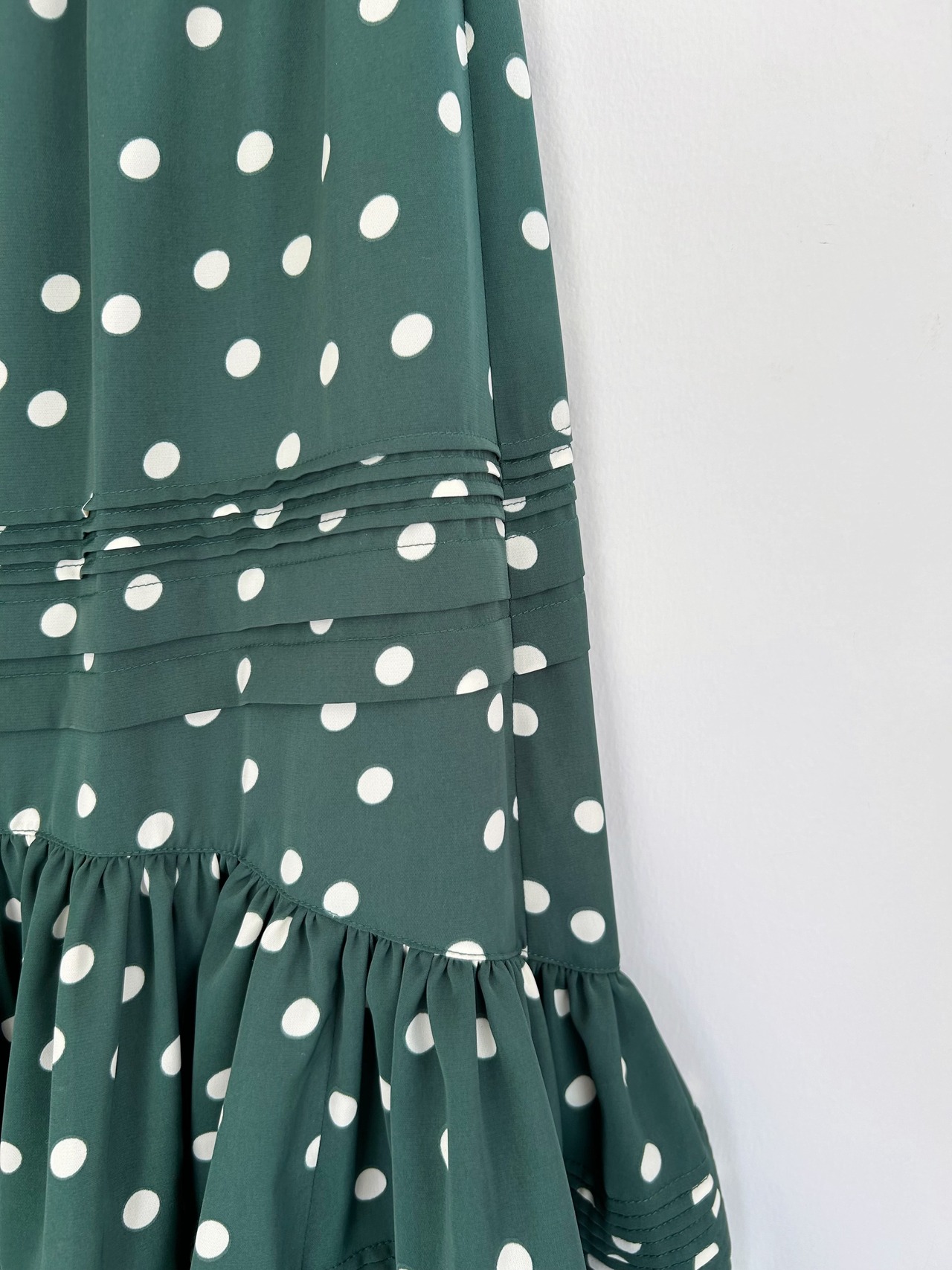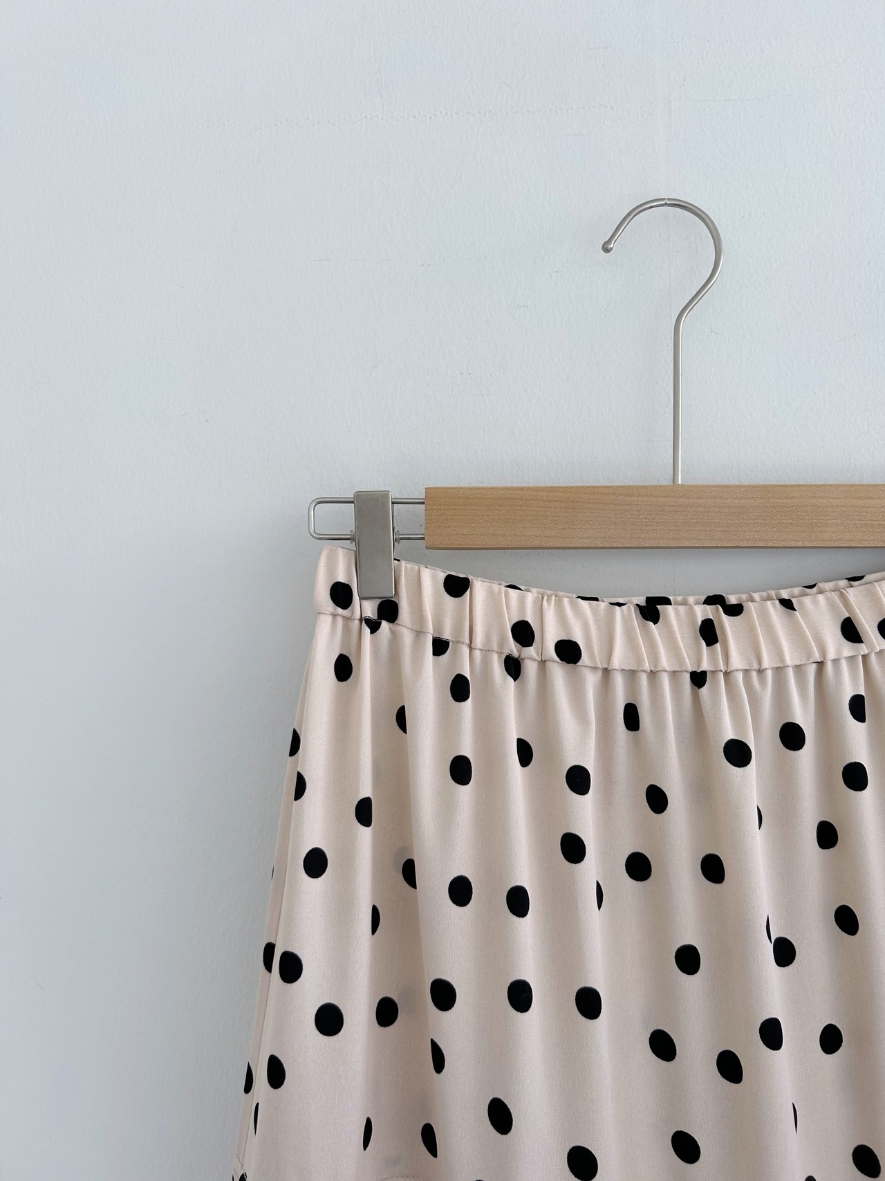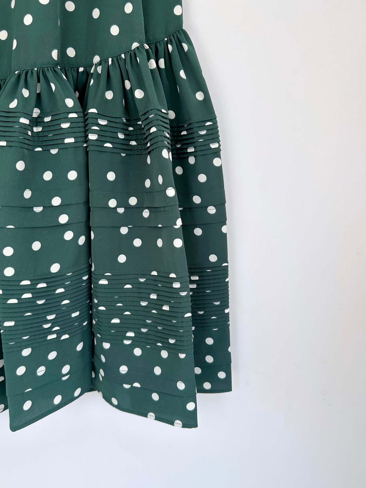 ランダムなドットプリントに細かなピンタックをあしらったティアードスカート。